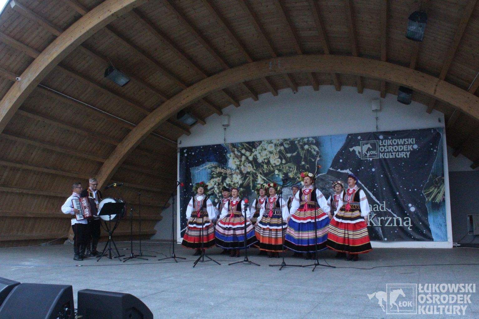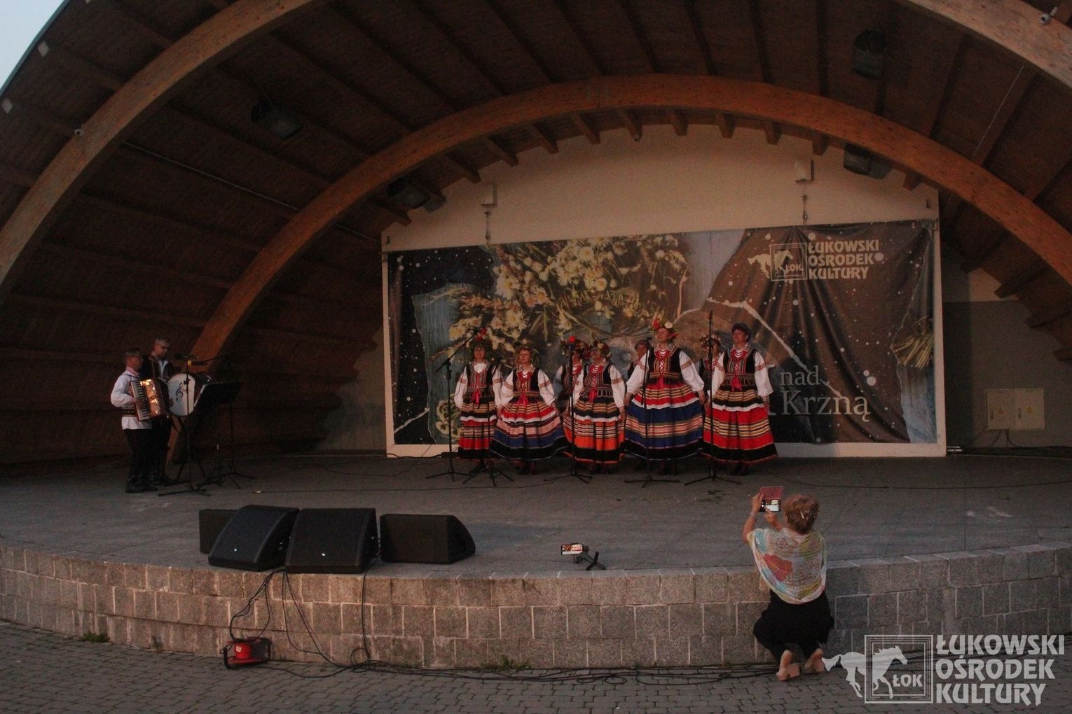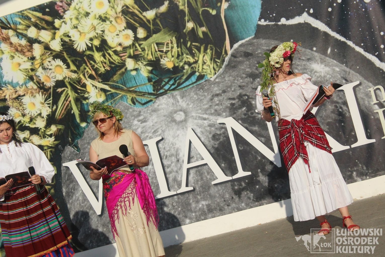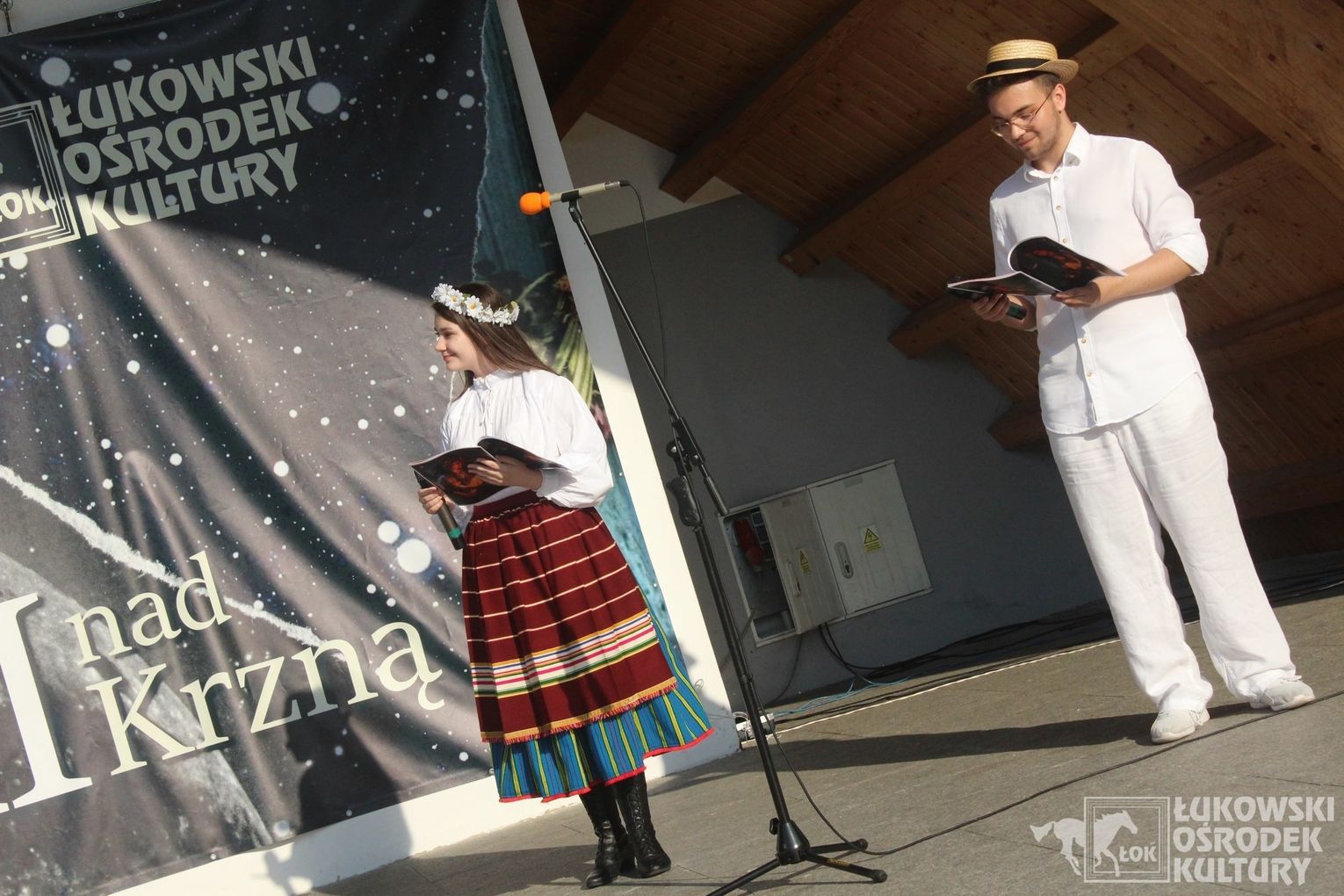 „Wianki nad Krzną” pomyślane zostały w taki sposób, aby w przystępny sposób, poprzez rozrywkę przybliżać widzom część historii, wiedzy oraz tradycji i obyczajów naszego regionu. Zgodnie ze słowiańskim zwyczajem na środku trawnika przed amfiteatrem umiejscowione zostało ognisko, które towarzyszyło całej imprezie. Na scenie w tym roku gościliśmy dwa tradycyjne teatry obrzędowe: „Jarzębina” z Paszenek w spektaklu „Spór o spadek” oraz „Zawsze razem” z Woli Gułowskiej w przedstawiającej zwyczaje i obrzędy kupalnocne inscenizacji „Dzisiaj Święty Janek”. Recytatorzy Teatru Żywego Słowa działającego w Łukowskim Ośrodku Kultury przygotowali „Pieśń Świętojańską o Sobótce” Jana Kochanowskiego. O dobry humor naszych widzów zadbali członkowie kabaretowego zespołu „Wohyniacy”, a do wspólnego śpiewania zmobilizowały wszystkich „Niezapominajki” z Dminina, które również poprowadziły nad rzekę barwny korowód z wiankami. Przez cały dzień trwały warsztaty wyplatania wianków prowadzone przez instruktorki ŁOK; nie zabrakło też gier i konkursów, w tym tego najważniejszego – na najładniejszy wianek. Podobnie jak w roku poprzednim stoły pełne regionalnych przysmaków przygotowały panie z Koła Gospodyń Wiejskich w Goździe. Po raz pierwszy coś dla ciała i ducha – naturalne kosmetyki, świece i eliksiry zaprezentowała Marta Suśniak. Piękną niespodziankę sprawili wszystkim „Łukowiacy”, którzy muzycznie przywitali nad Krzną korowód panien, pań, a nawet panów niosących wianki. Publiczność pomimo niepewnej pogody dopisała licznie, a wiek uczestników oscylował pomiędzy 9 miesięcy, a 90 lat. Celem „Wianków nad Krzną” oprócz oczywiście dobrej zabawy jest popularyzacja wiedzy o zapomnianych obrzędach i obyczajach oraz zainteresowanie lokalną specyfiką kulturową. Dlatego niezwykle cieszy nas tak duże zainteresowanie z Państwa strony i serdecznie zapraszamy na kolejną odsłonę za rok.