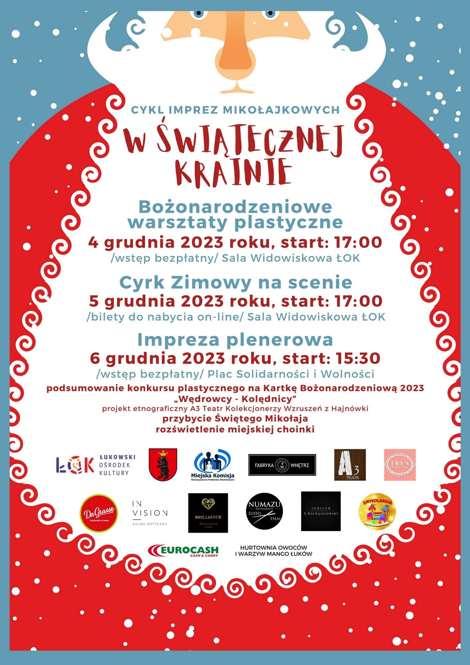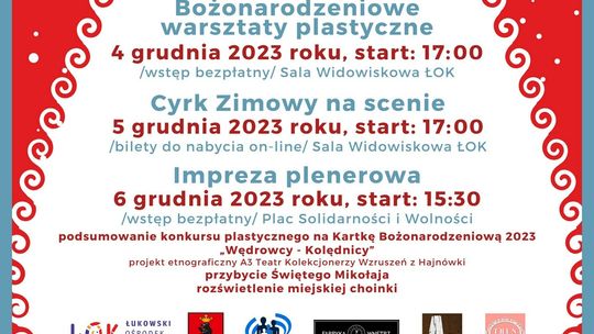 W środę 6 grudnia 2023r. zapraszamy o godz. 15:30 na Plac Solidarności i Wolności w Łukowie. Tam odbędzie się podsumowanie konkursu plastycznego na Kartkę Bożonarodzeniową 2023, podczas którego laureaci otrzymają dyplomy oraz nagrody. Z przykrością informujemy, że z przyczyn od nas niezależnych, występ Teatru A3 Kolekcjonerzy Wzruszeń z Hajnówki nie odbędzie się.