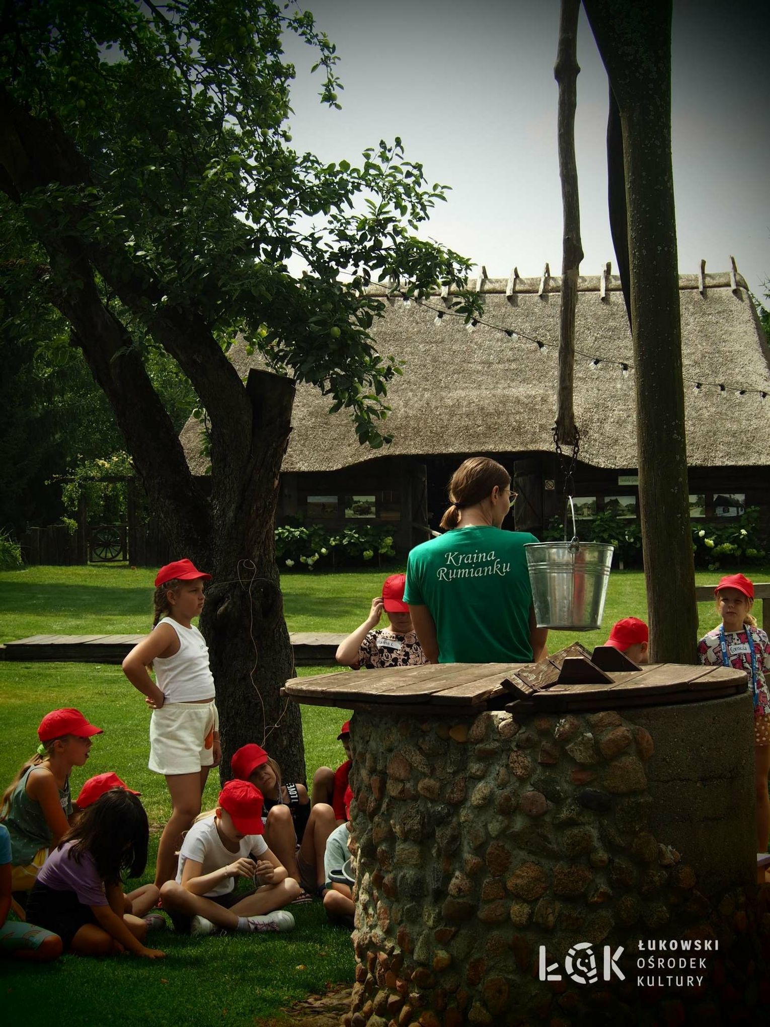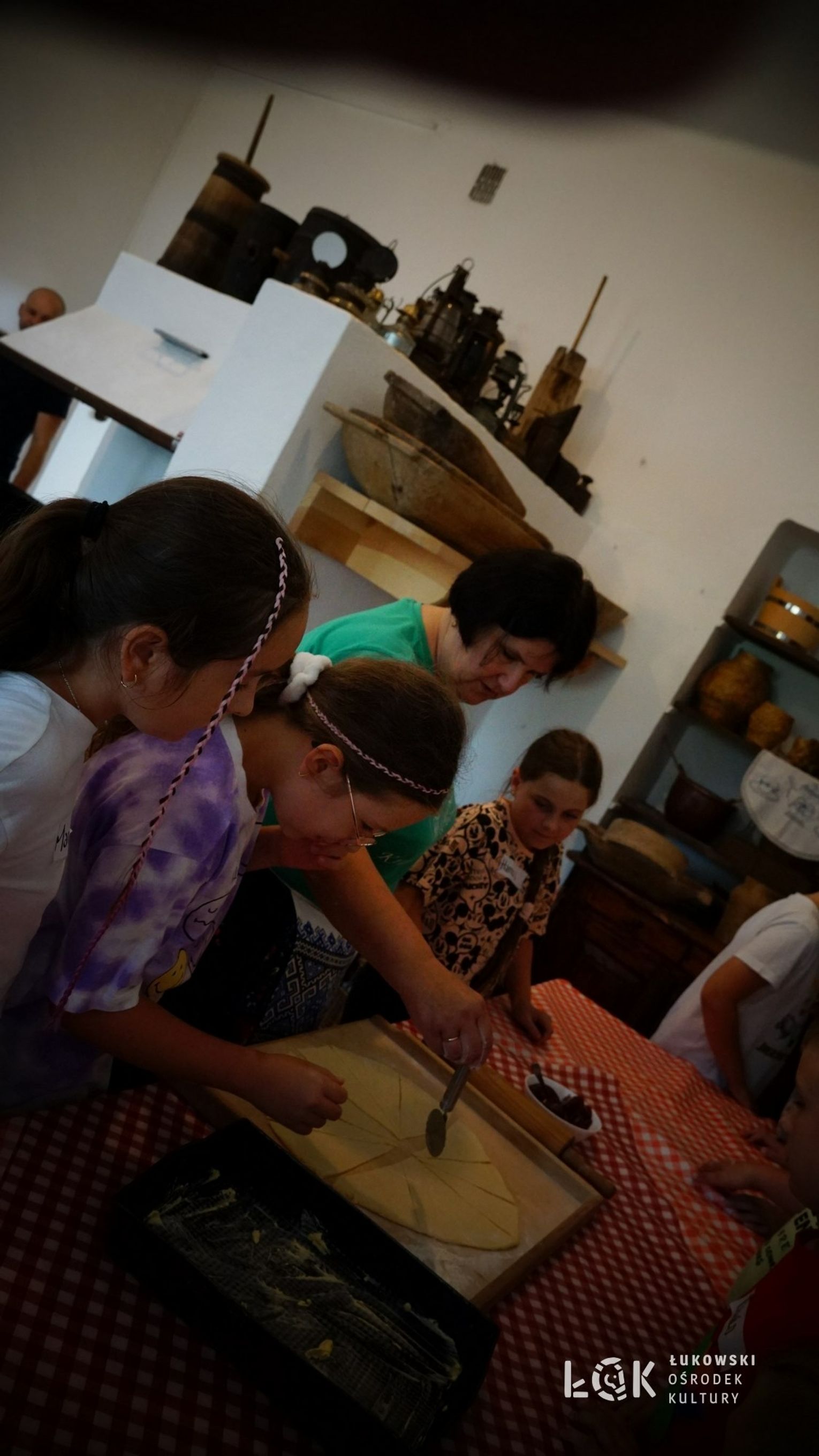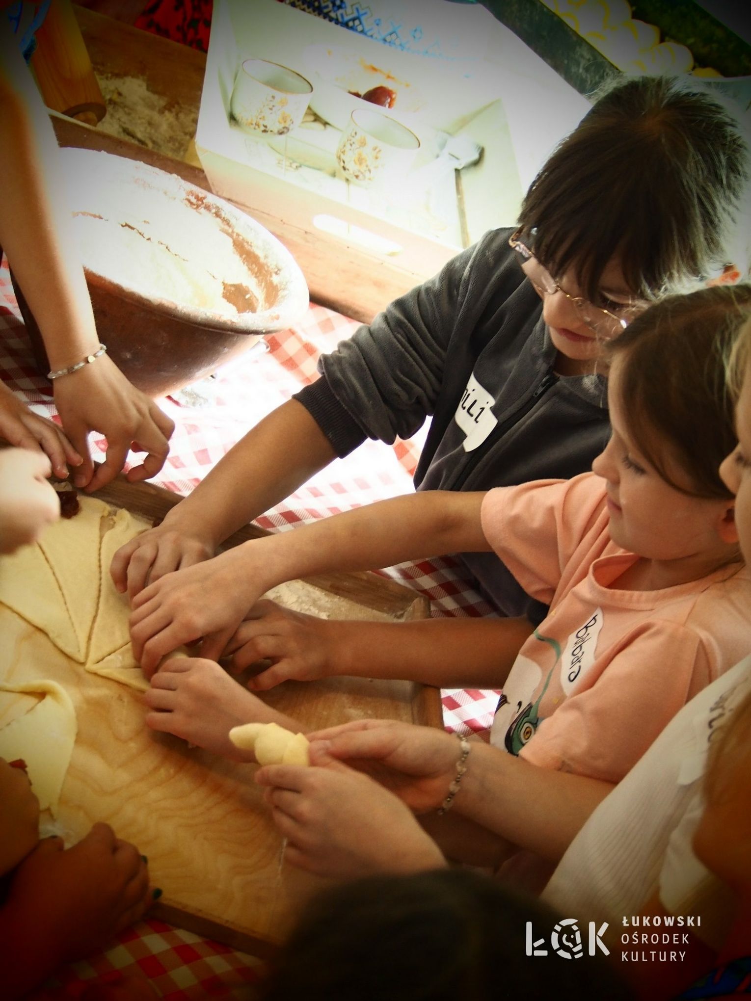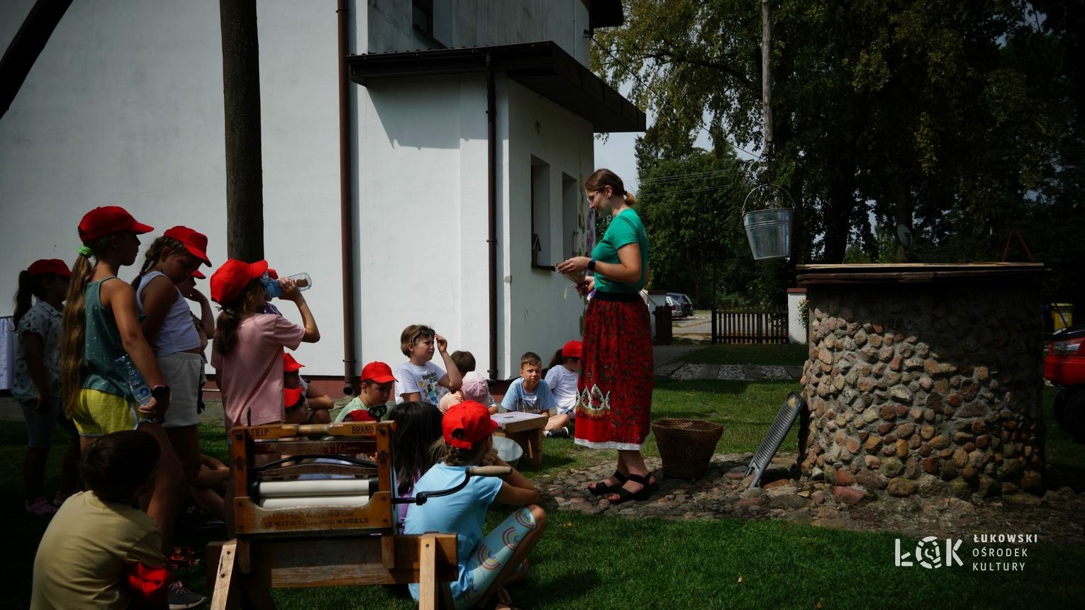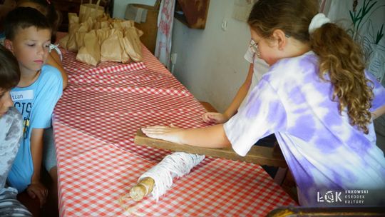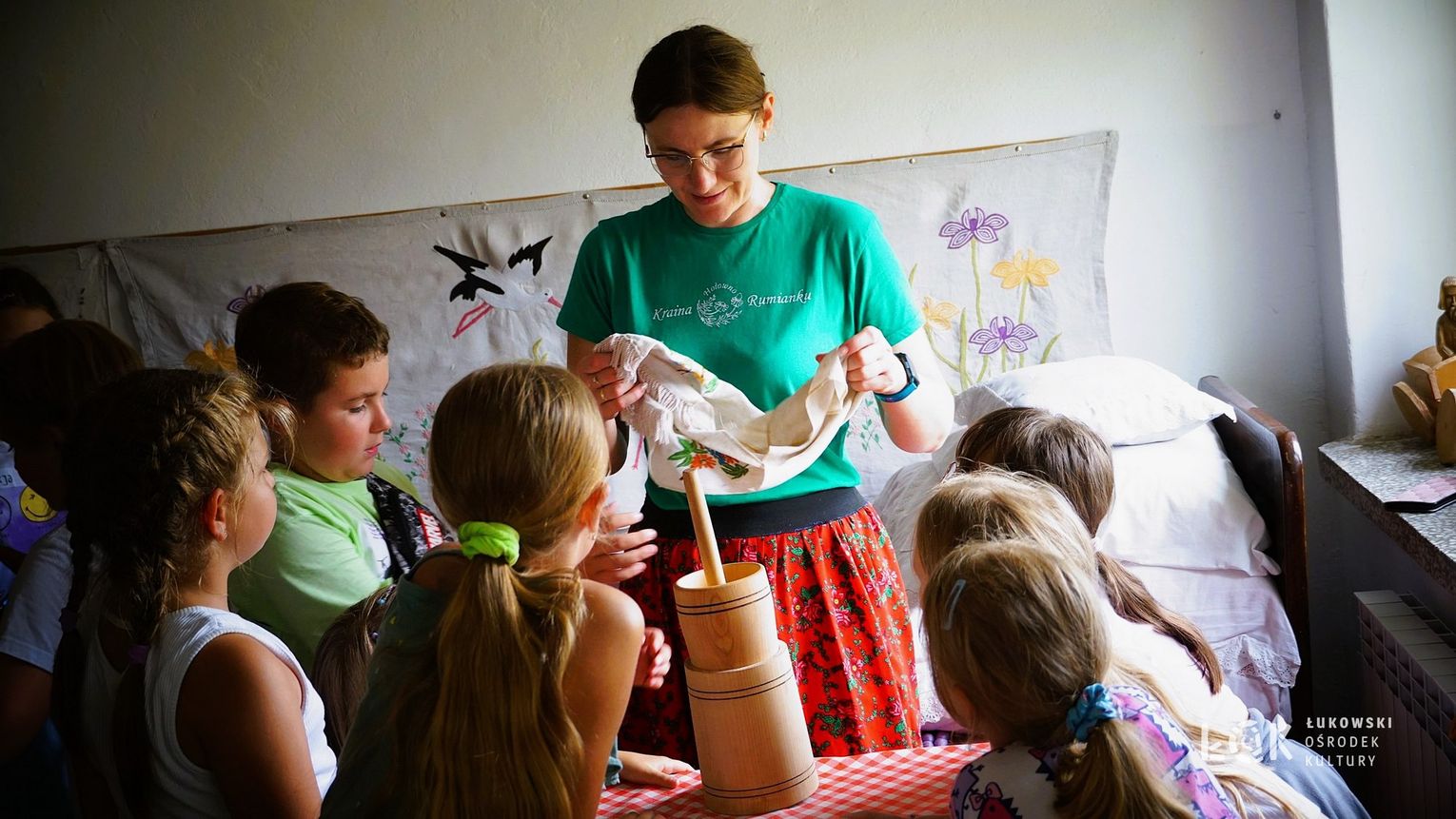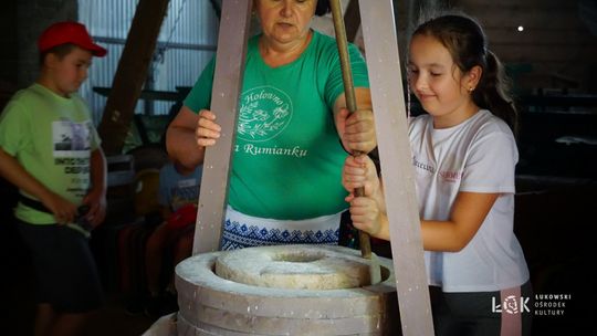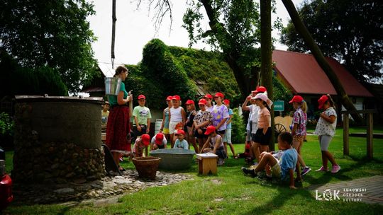 Kraina Rumianku to wioska tematyczna, w której dzieci, młodzież oraz dorośli mogą doświadczyć, jak żyli, pracowali i odpoczywali nasi przodkowie. Wszystko to dzieje się w scenerii polskiej wsi, gdzie dawne obyczaje są wciąż żywe i praktykowane. Dzieci z Łukowskiego Ośrodka Kultury wzięły udział w warsztatach „Od ziarna do chleba”, podczas których poznali tradycyjne sposoby uprawy zboża i jego przechowywania, nauczyły się młócenia cepem, czyszczenia ziarna, mielenia zboża w kamiennych żarnach. Miały także okazję przygotowywać ciasto i upiec w piecu chlebowym słodkie rogaliki, które potem mogły zjeść ze smakiem. Następnie uczestnicy zajęć w ŁOK wzięli udział w warsztatach „Dawne zajęcia domowe”, w trakcie których miały okazję m.in. wyprasować i wymaglować bieliznę, własnoręcznie upraną wcześniej w balii, zobaczyć, jak wyglądała dawna wiejska izba i co się w niej działo do świtu do zmierzchu, ubić masło w maselnicy i zjeść je ze smakiem z chlebem oraz nauczyć się prasowania żelazkiem na węgiel i z duszą. Uczestnicy warsztatów oprócz walorów edukacyjnych i integracyjnych, spędzili twórczo czas. Dodatkowo mogli czerpali radość z poznawania dziedzictwa kulturowego i przyrodniczego naszego regionu.