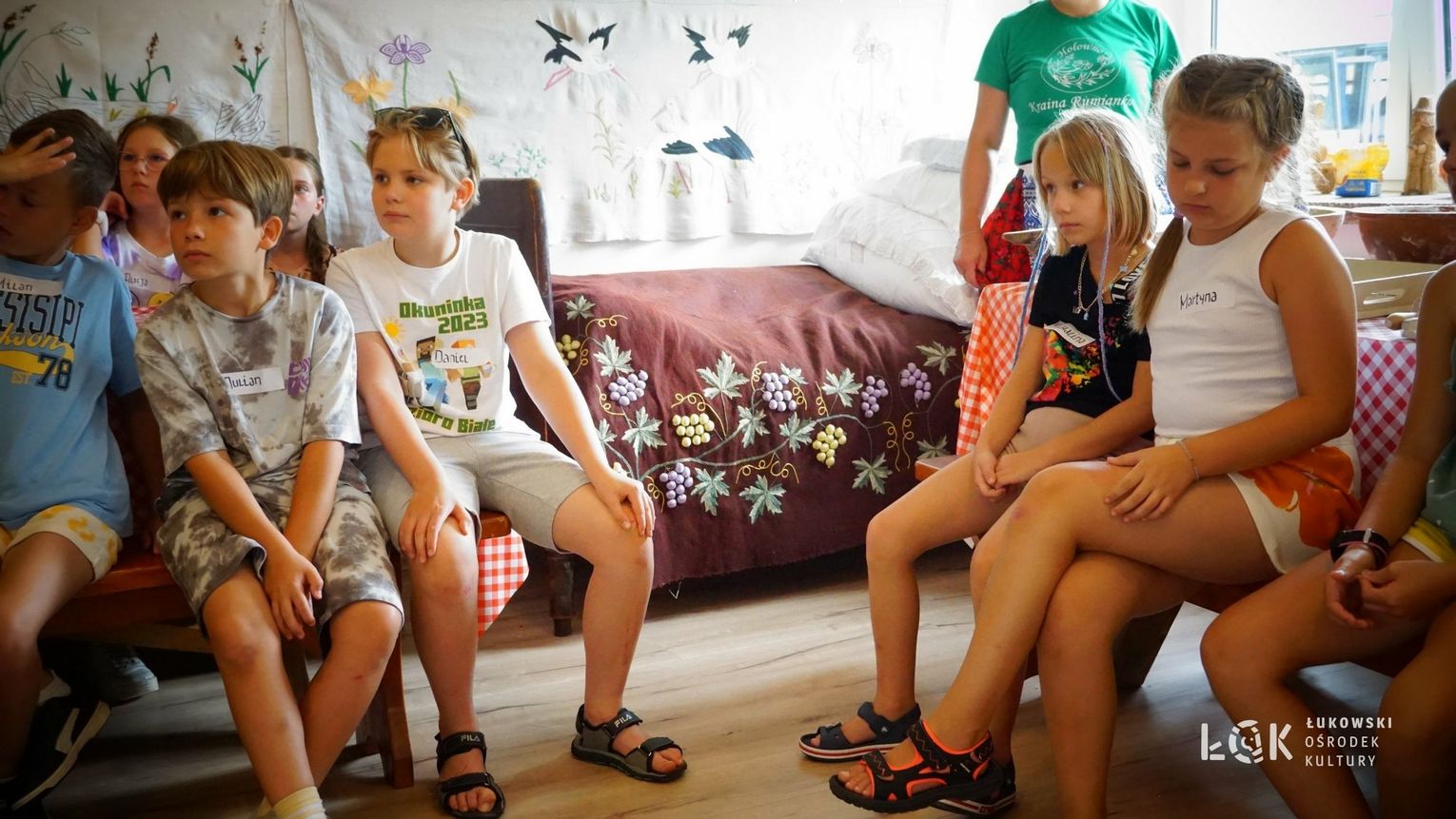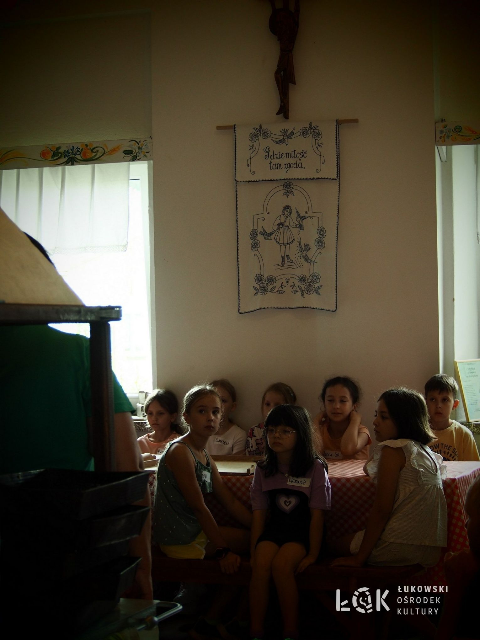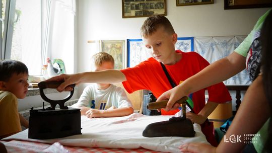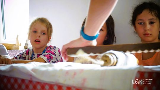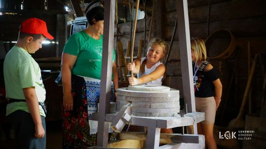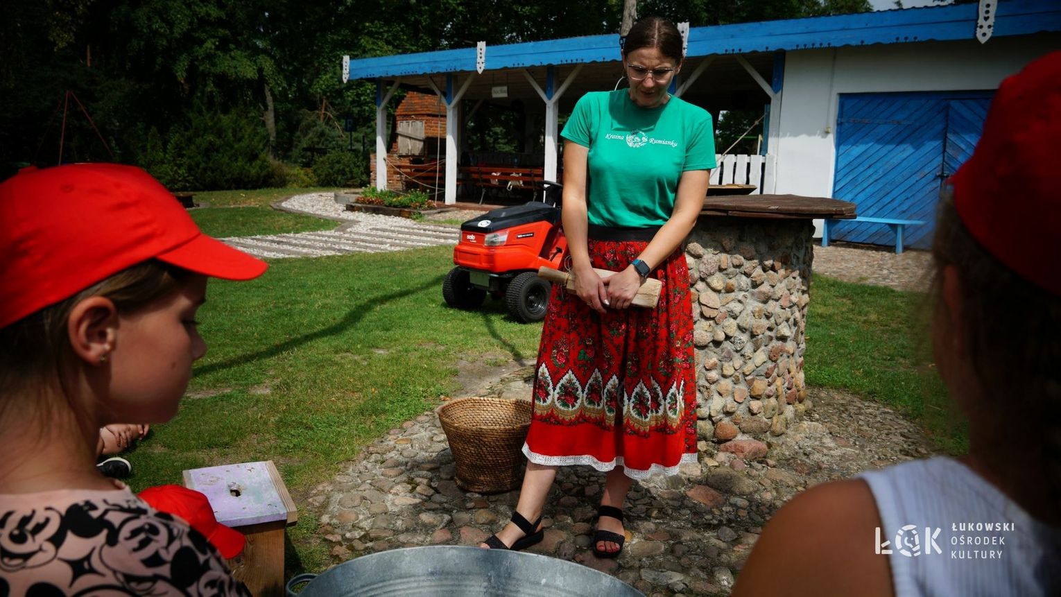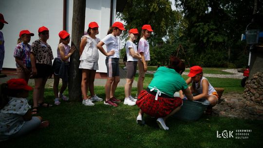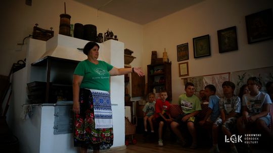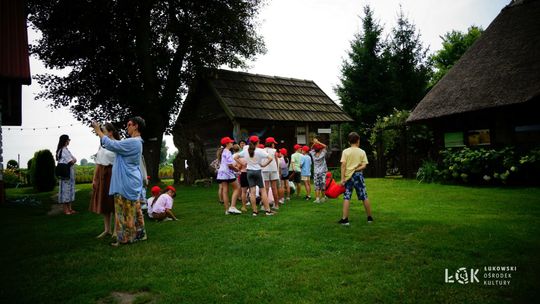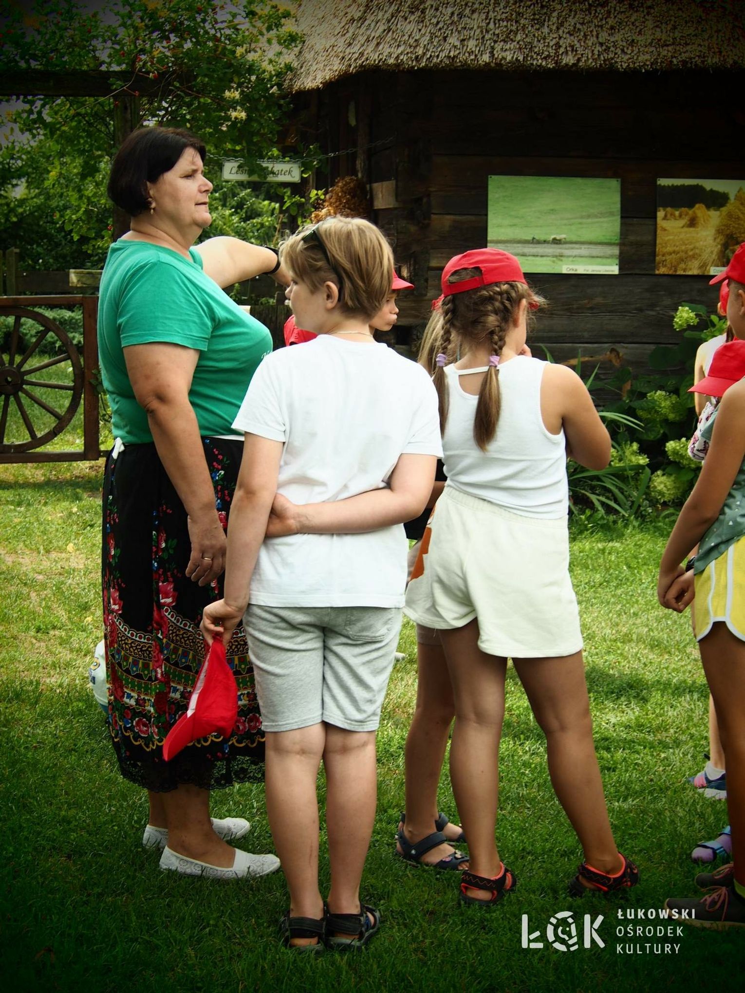 Kraina Rumianku to wioska tematyczna, w której dzieci, młodzież oraz dorośli mogą doświadczyć, jak żyli, pracowali i odpoczywali nasi przodkowie. Wszystko to dzieje się w scenerii polskiej wsi, gdzie dawne obyczaje są wciąż żywe i praktykowane. Dzieci z Łukowskiego Ośrodka Kultury wzięły udział w warsztatach „Od ziarna do chleba”, podczas których poznali tradycyjne sposoby uprawy zboża i jego przechowywania, nauczyły się młócenia cepem, czyszczenia ziarna, mielenia zboża w kamiennych żarnach. Miały także okazję przygotowywać ciasto i upiec w piecu chlebowym słodkie rogaliki, które potem mogły zjeść ze smakiem. Następnie uczestnicy zajęć w ŁOK wzięli udział w warsztatach „Dawne zajęcia domowe”, w trakcie których miały okazję m.in. wyprasować i wymaglować bieliznę, własnoręcznie upraną wcześniej w balii, zobaczyć, jak wyglądała dawna wiejska izba i co się w niej działo do świtu do zmierzchu, ubić masło w maselnicy i zjeść je ze smakiem z chlebem oraz nauczyć się prasowania żelazkiem na węgiel i z duszą. Uczestnicy warsztatów oprócz walorów edukacyjnych i integracyjnych, spędzili twórczo czas. Dodatkowo mogli czerpali radość z poznawania dziedzictwa kulturowego i przyrodniczego naszego regionu.