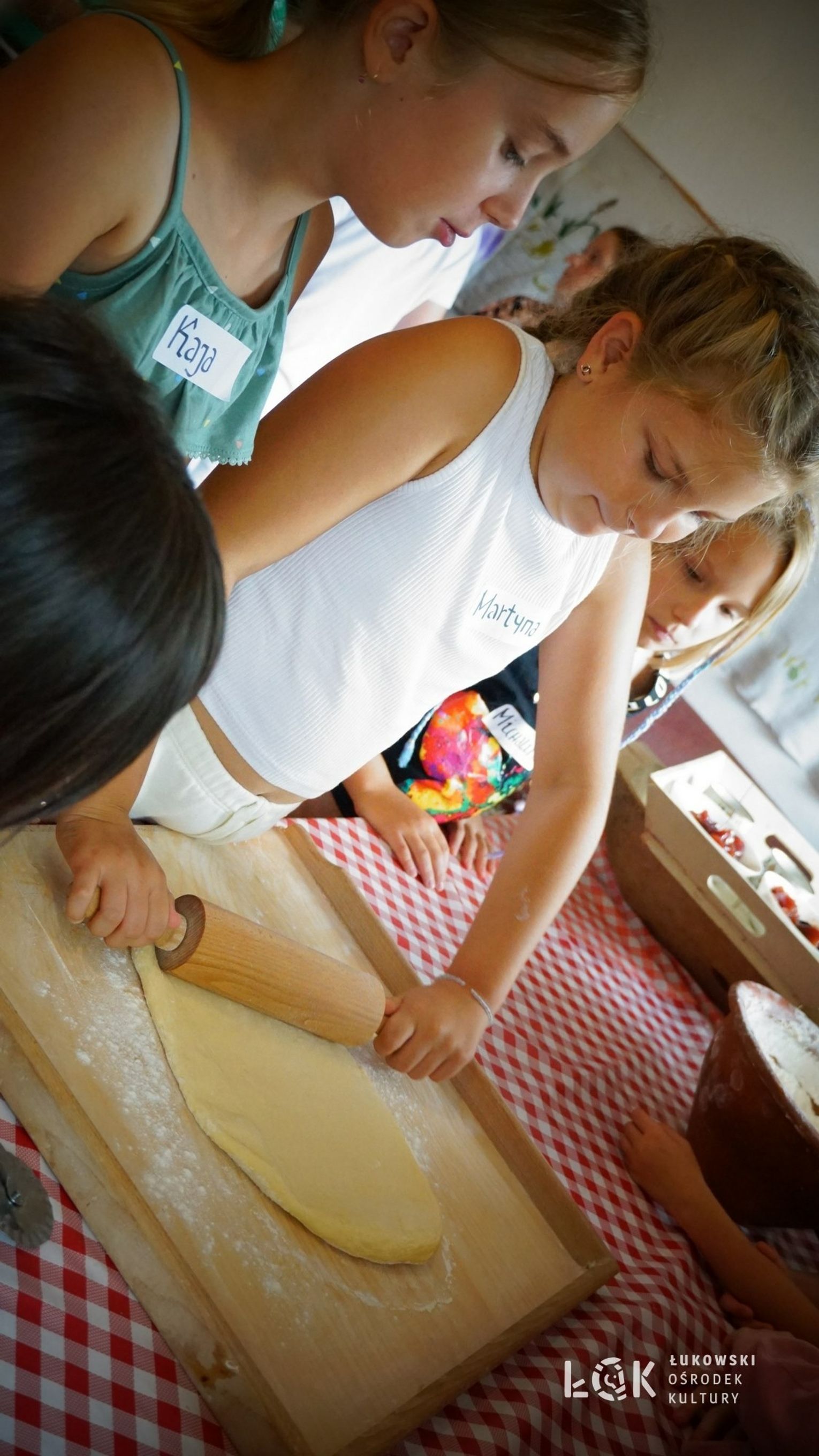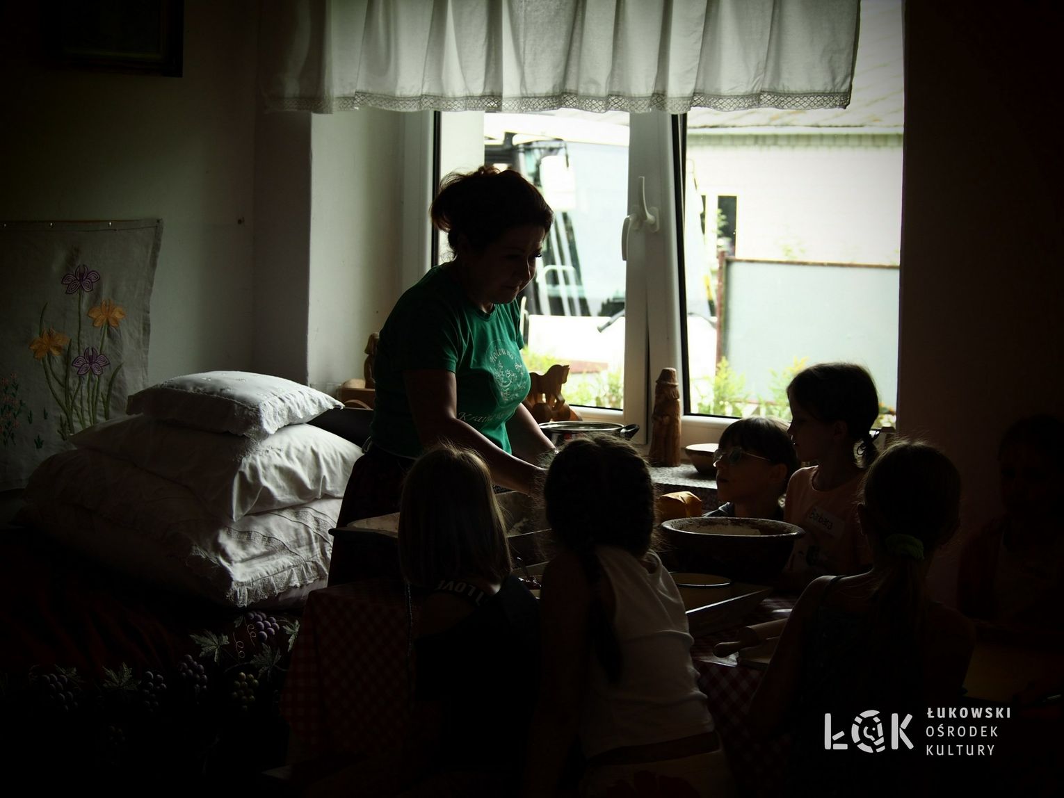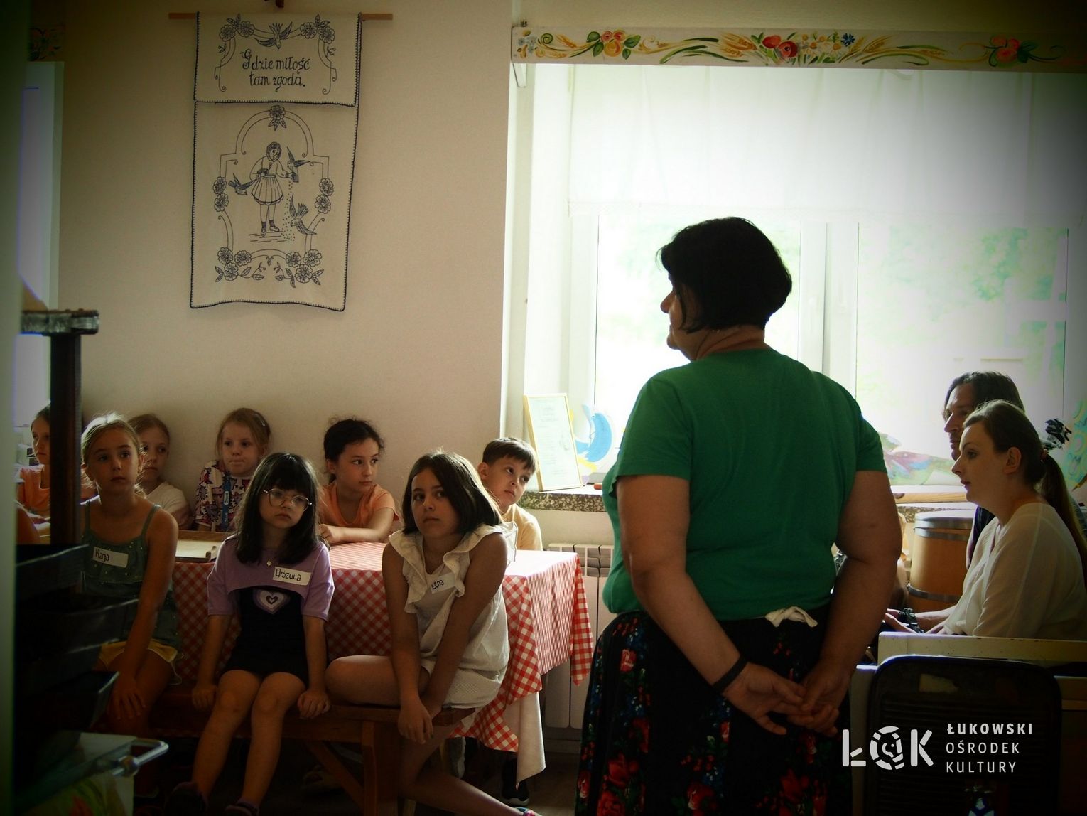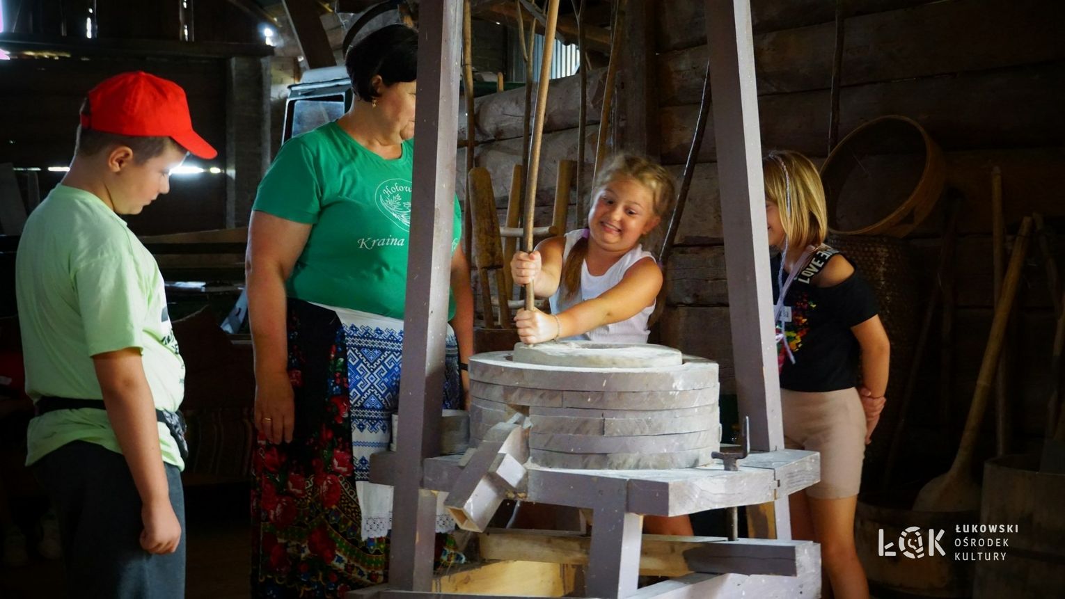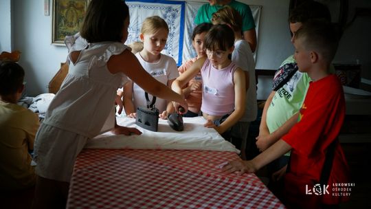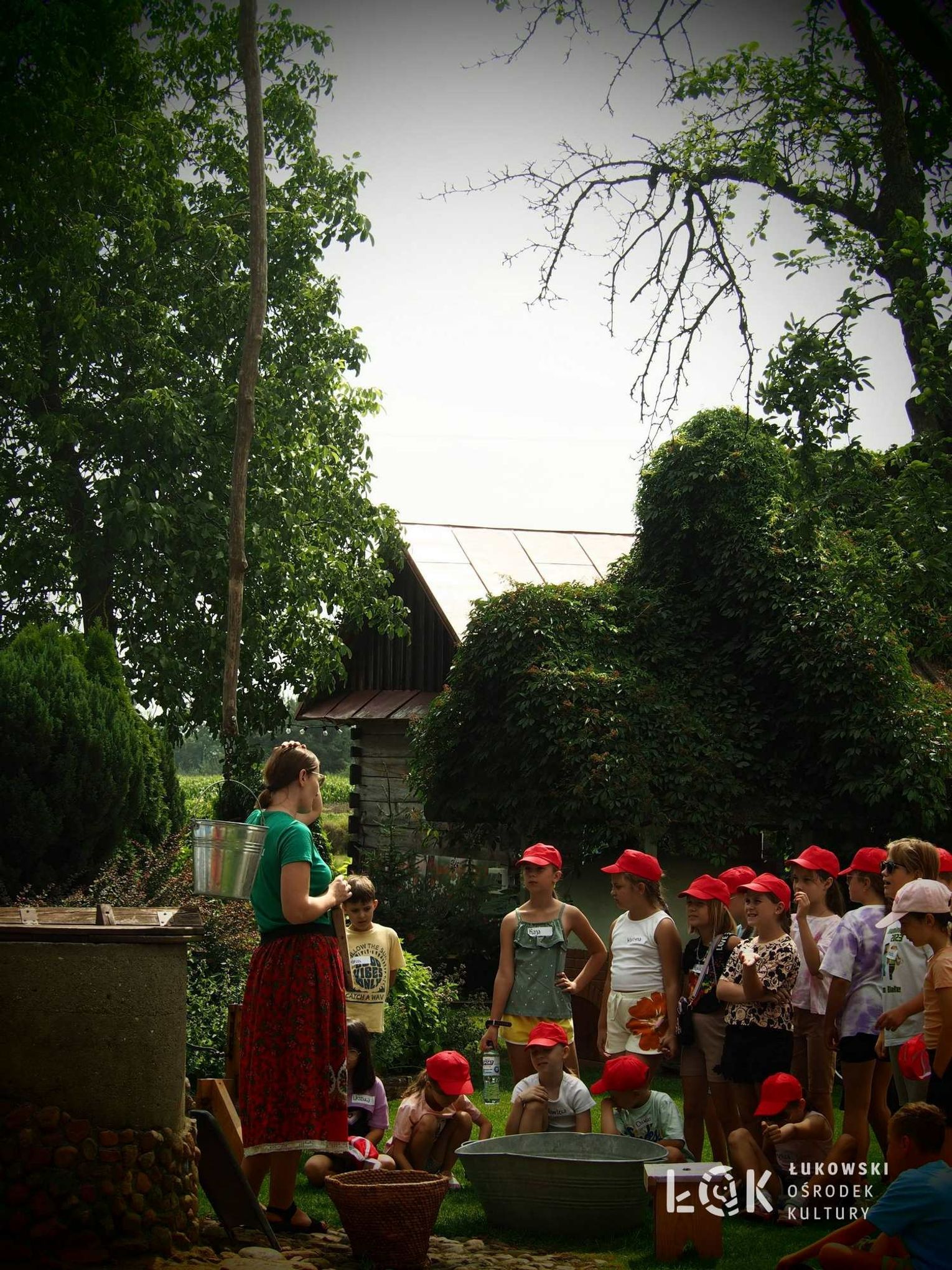 Kraina Rumianku to wioska tematyczna, w której dzieci, młodzież oraz dorośli mogą doświadczyć, jak żyli, pracowali i odpoczywali nasi przodkowie. Wszystko to dzieje się w scenerii polskiej wsi, gdzie dawne obyczaje są wciąż żywe i praktykowane. Dzieci z Łukowskiego Ośrodka Kultury wzięły udział w warsztatach „Od ziarna do chleba”, podczas których poznali tradycyjne sposoby uprawy zboża i jego przechowywania, nauczyły się młócenia cepem, czyszczenia ziarna, mielenia zboża w kamiennych żarnach. Miały także okazję przygotowywać ciasto i upiec w piecu chlebowym słodkie rogaliki, które potem mogły zjeść ze smakiem. Następnie uczestnicy zajęć w ŁOK wzięli udział w warsztatach „Dawne zajęcia domowe”, w trakcie których miały okazję m.in. wyprasować i wymaglować bieliznę, własnoręcznie upraną wcześniej w balii, zobaczyć, jak wyglądała dawna wiejska izba i co się w niej działo do świtu do zmierzchu, ubić masło w maselnicy i zjeść je ze smakiem z chlebem oraz nauczyć się prasowania żelazkiem na węgiel i z duszą. Uczestnicy warsztatów oprócz walorów edukacyjnych i integracyjnych, spędzili twórczo czas. Dodatkowo mogli czerpali radość z poznawania dziedzictwa kulturowego i przyrodniczego naszego regionu.
