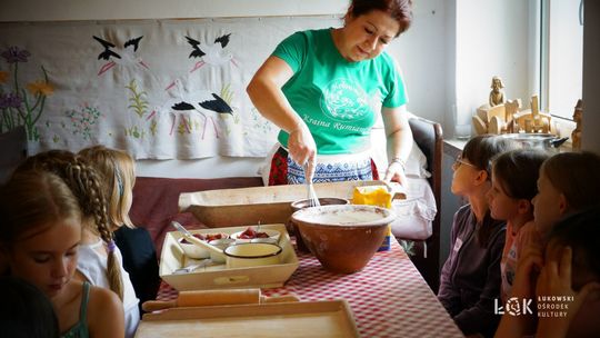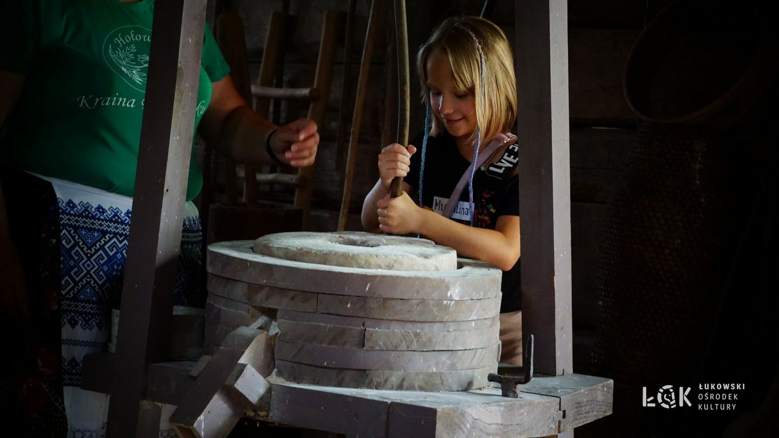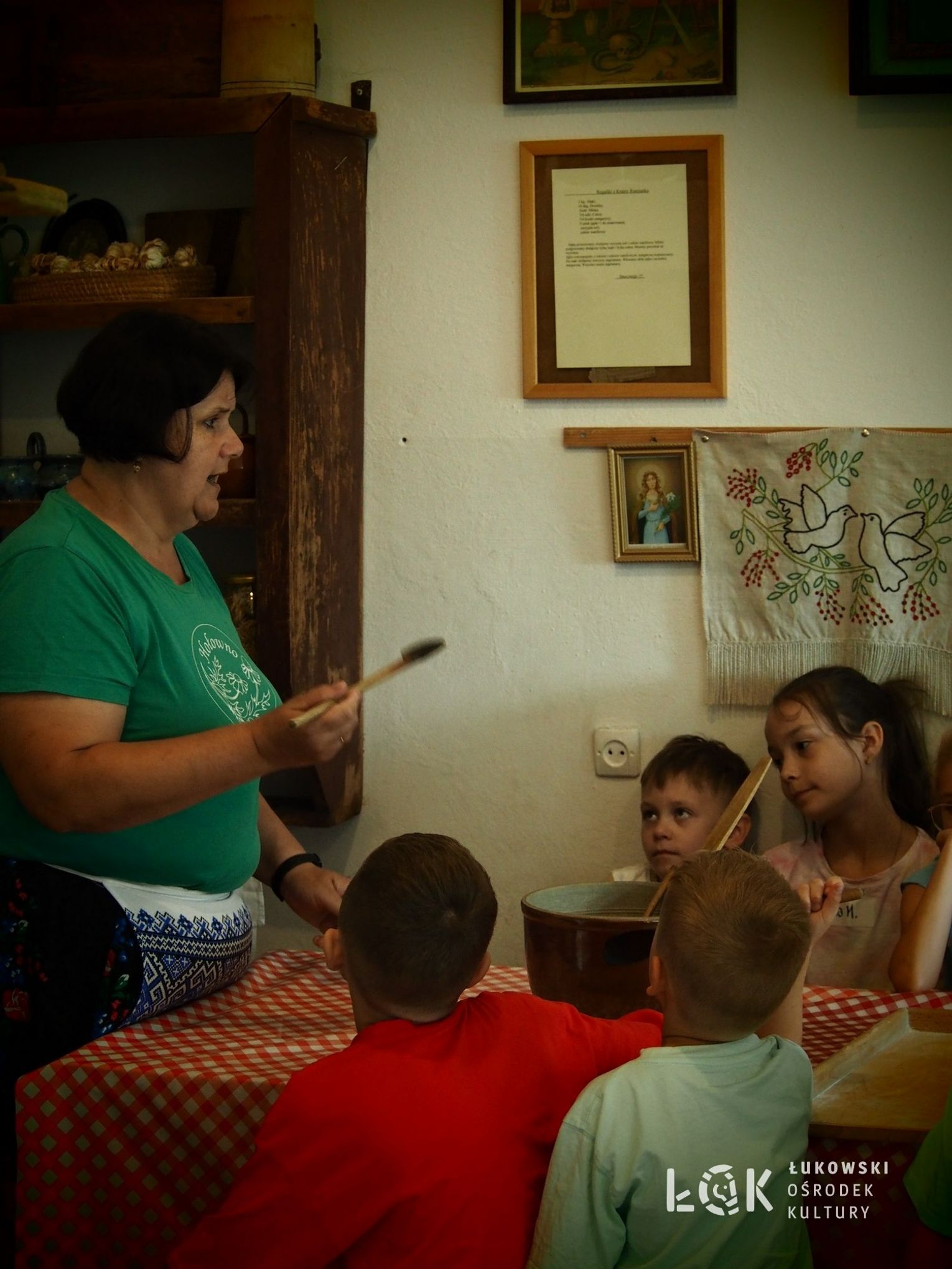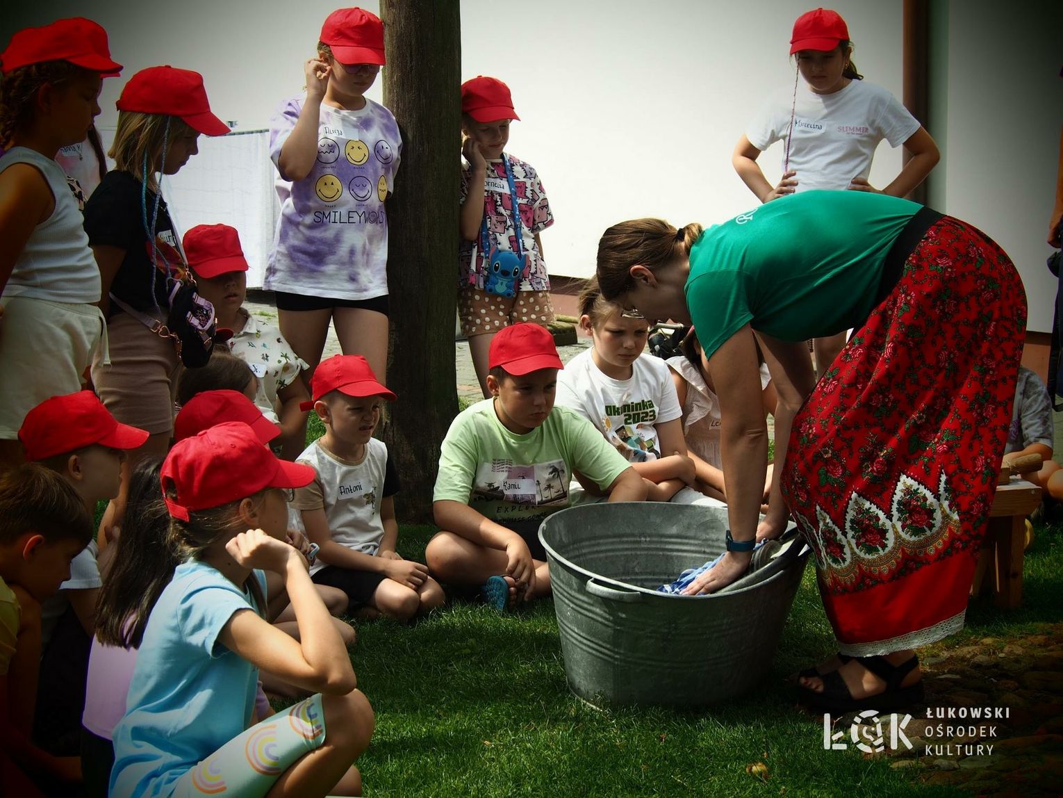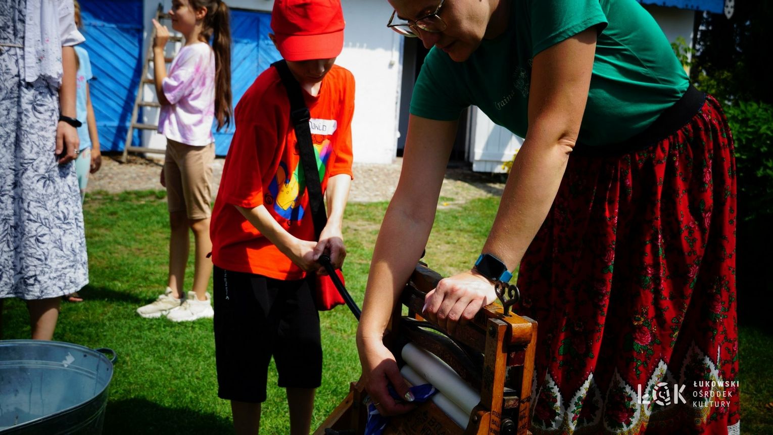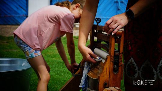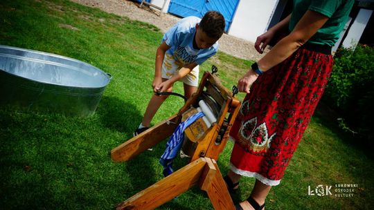 Kraina Rumianku to wioska tematyczna, w której dzieci, młodzież oraz dorośli mogą doświadczyć, jak żyli, pracowali i odpoczywali nasi przodkowie. Wszystko to dzieje się w scenerii polskiej wsi, gdzie dawne obyczaje są wciąż żywe i praktykowane. Dzieci z Łukowskiego Ośrodka Kultury wzięły udział w warsztatach „Od ziarna do chleba”, podczas których poznali tradycyjne sposoby uprawy zboża i jego przechowywania, nauczyły się młócenia cepem, czyszczenia ziarna, mielenia zboża w kamiennych żarnach. Miały także okazję przygotowywać ciasto i upiec w piecu chlebowym słodkie rogaliki, które potem mogły zjeść ze smakiem. Następnie uczestnicy zajęć w ŁOK wzięli udział w warsztatach „Dawne zajęcia domowe”, w trakcie których miały okazję m.in. wyprasować i wymaglować bieliznę, własnoręcznie upraną wcześniej w balii, zobaczyć, jak wyglądała dawna wiejska izba i co się w niej działo do świtu do zmierzchu, ubić masło w maselnicy i zjeść je ze smakiem z chlebem oraz nauczyć się prasowania żelazkiem na węgiel i z duszą. Uczestnicy warsztatów oprócz walorów edukacyjnych i integracyjnych, spędzili twórczo czas. Dodatkowo mogli czerpali radość z poznawania dziedzictwa kulturowego i przyrodniczego naszego regionu.