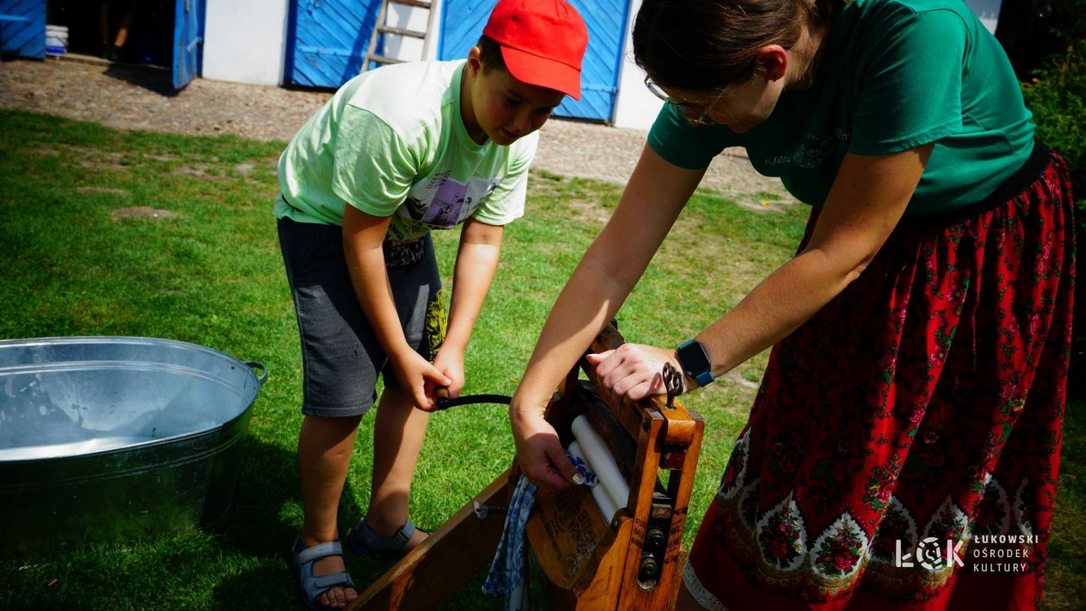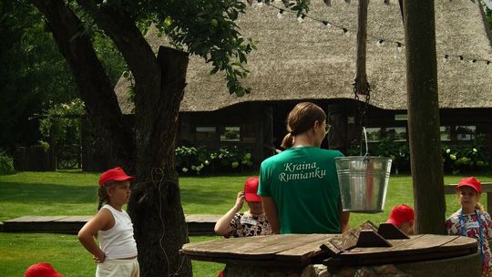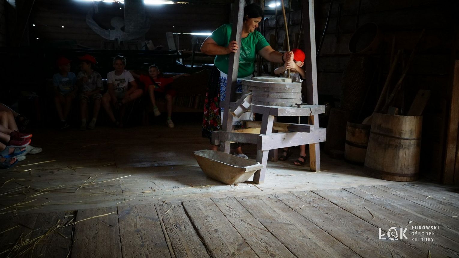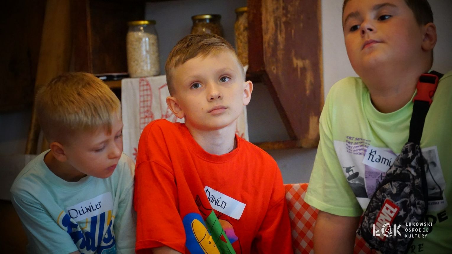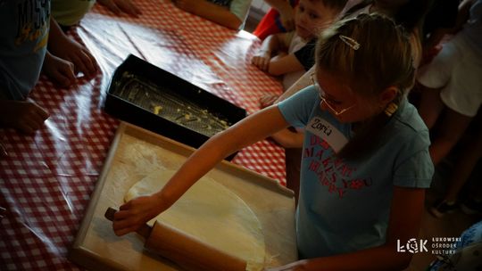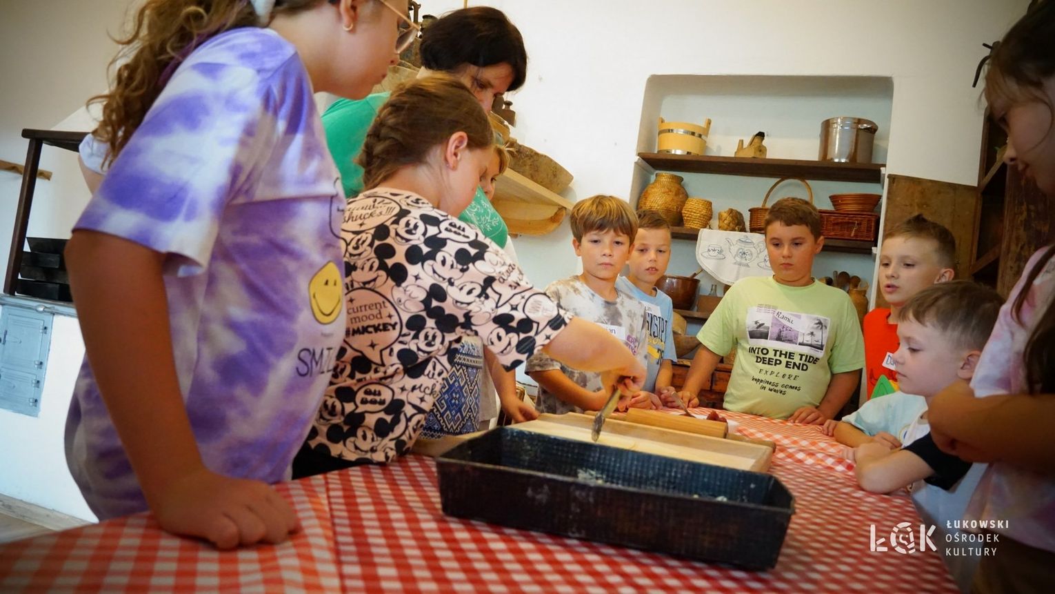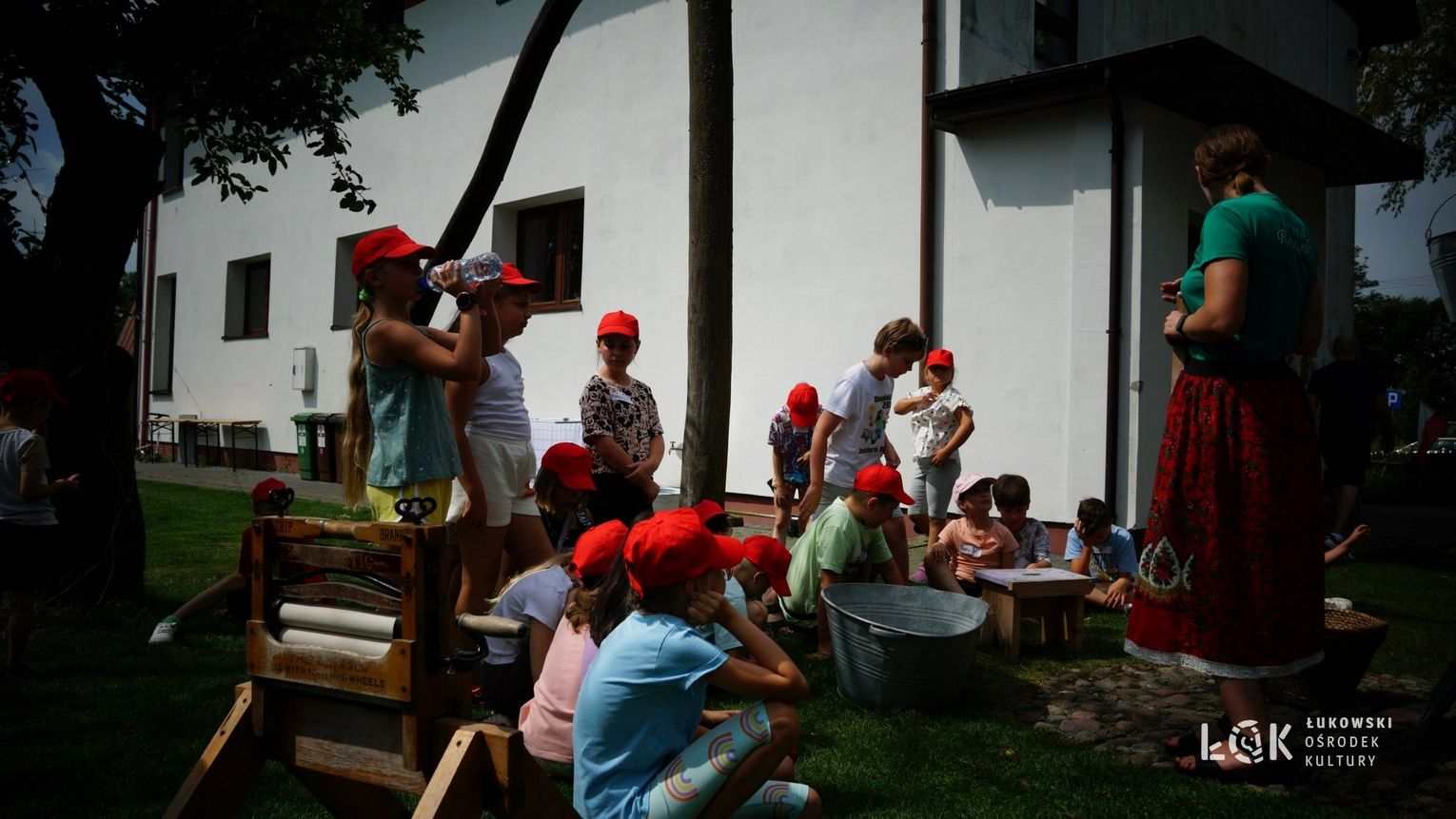 Kraina Rumianku to wioska tematyczna, w której dzieci, młodzież oraz dorośli mogą doświadczyć, jak żyli, pracowali i odpoczywali nasi przodkowie. Wszystko to dzieje się w scenerii polskiej wsi, gdzie dawne obyczaje są wciąż żywe i praktykowane. Dzieci z Łukowskiego Ośrodka Kultury wzięły udział w warsztatach „Od ziarna do chleba”, podczas których poznali tradycyjne sposoby uprawy zboża i jego przechowywania, nauczyły się młócenia cepem, czyszczenia ziarna, mielenia zboża w kamiennych żarnach. Miały także okazję przygotowywać ciasto i upiec w piecu chlebowym słodkie rogaliki, które potem mogły zjeść ze smakiem. Następnie uczestnicy zajęć w ŁOK wzięli udział w warsztatach „Dawne zajęcia domowe”, w trakcie których miały okazję m.in. wyprasować i wymaglować bieliznę, własnoręcznie upraną wcześniej w balii, zobaczyć, jak wyglądała dawna wiejska izba i co się w niej działo do świtu do zmierzchu, ubić masło w maselnicy i zjeść je ze smakiem z chlebem oraz nauczyć się prasowania żelazkiem na węgiel i z duszą. Uczestnicy warsztatów oprócz walorów edukacyjnych i integracyjnych, spędzili twórczo czas. Dodatkowo mogli czerpali radość z poznawania dziedzictwa kulturowego i przyrodniczego naszego regionu.