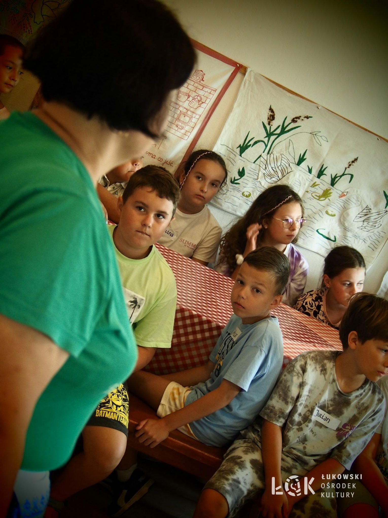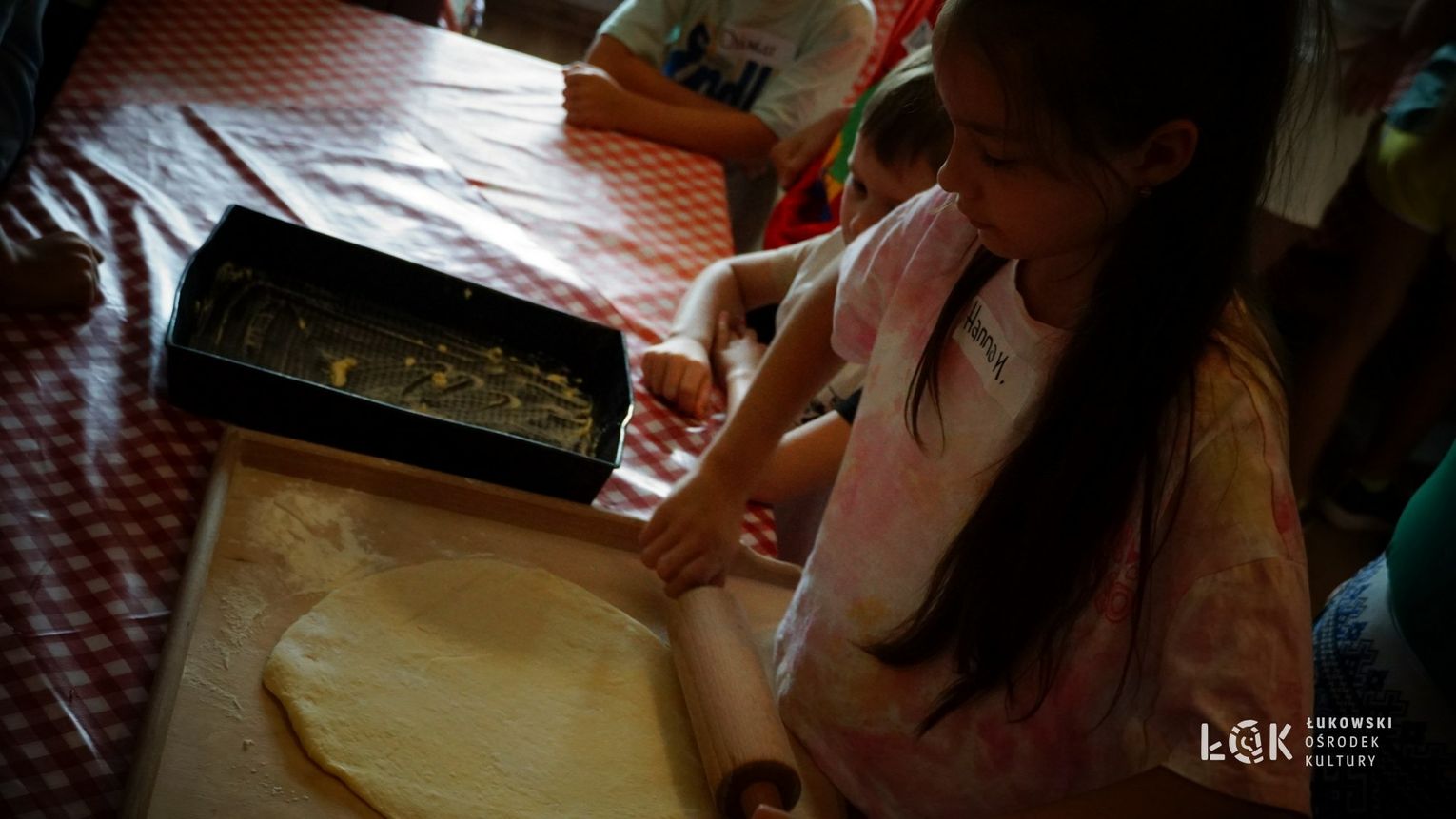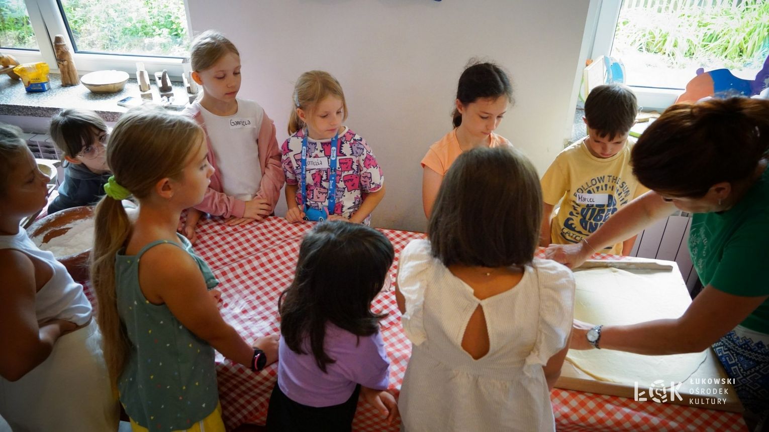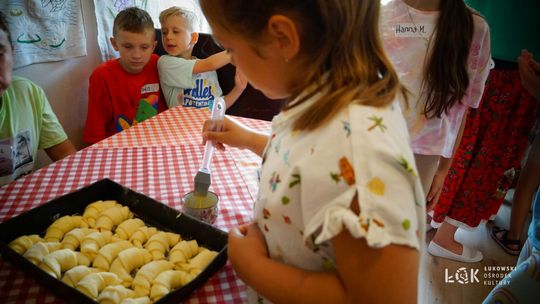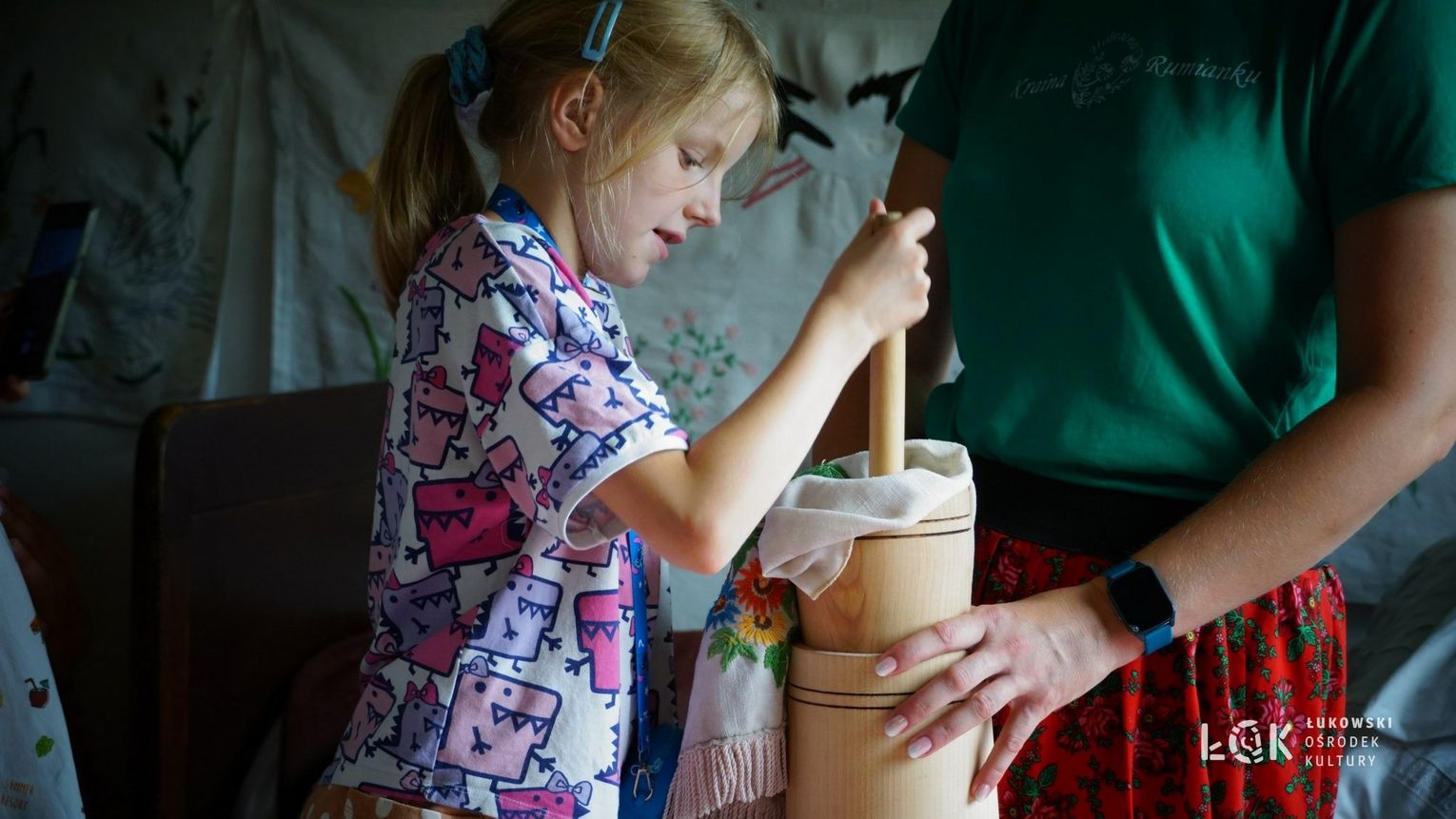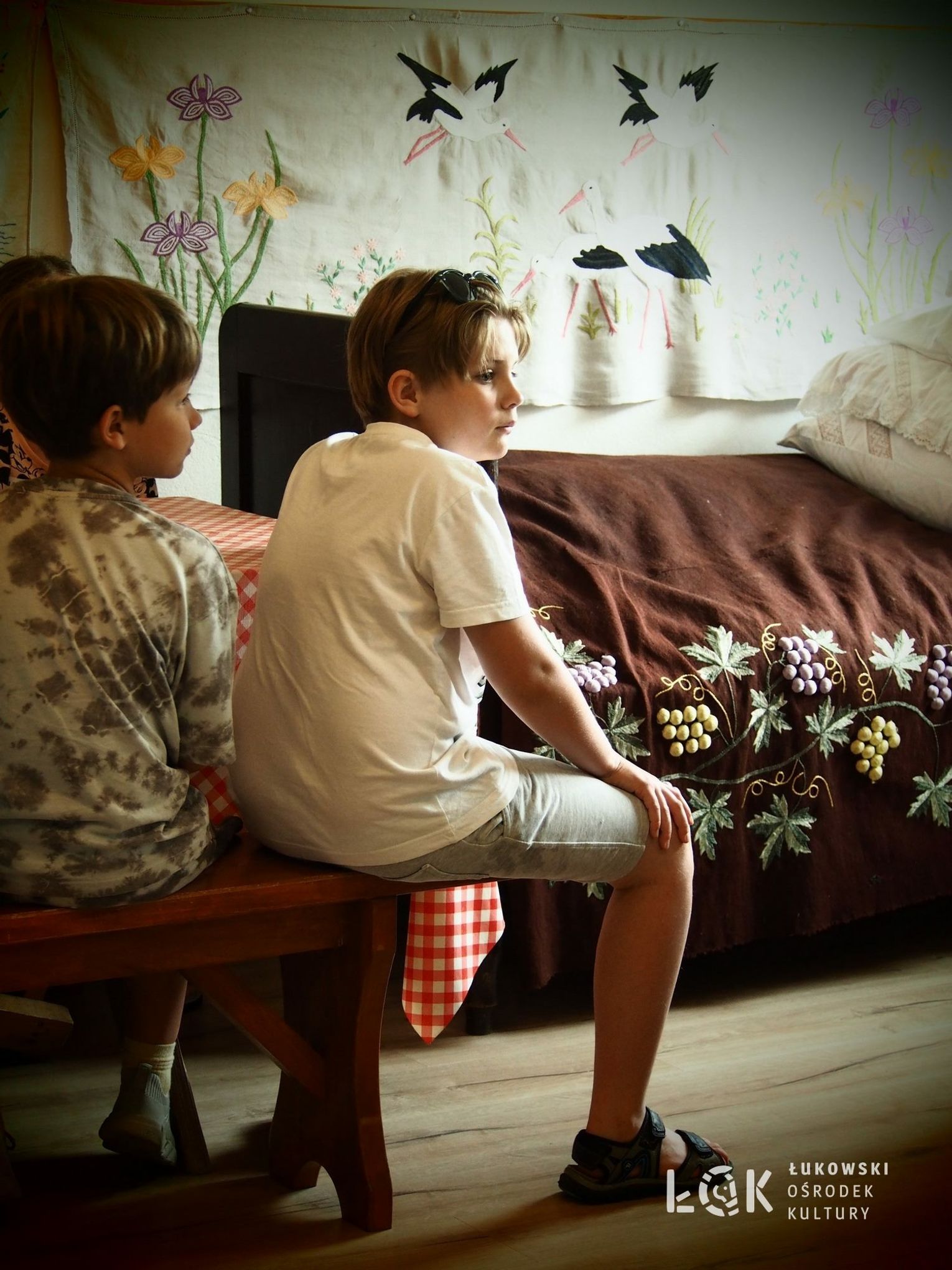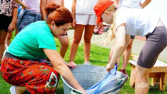 Kraina Rumianku to wioska tematyczna, w której dzieci, młodzież oraz dorośli mogą doświadczyć, jak żyli, pracowali i odpoczywali nasi przodkowie. Wszystko to dzieje się w scenerii polskiej wsi, gdzie dawne obyczaje są wciąż żywe i praktykowane. Dzieci z Łukowskiego Ośrodka Kultury wzięły udział w warsztatach „Od ziarna do chleba”, podczas których poznali tradycyjne sposoby uprawy zboża i jego przechowywania, nauczyły się młócenia cepem, czyszczenia ziarna, mielenia zboża w kamiennych żarnach. Miały także okazję przygotowywać ciasto i upiec w piecu chlebowym słodkie rogaliki, które potem mogły zjeść ze smakiem. Następnie uczestnicy zajęć w ŁOK wzięli udział w warsztatach „Dawne zajęcia domowe”, w trakcie których miały okazję m.in. wyprasować i wymaglować bieliznę, własnoręcznie upraną wcześniej w balii, zobaczyć, jak wyglądała dawna wiejska izba i co się w niej działo do świtu do zmierzchu, ubić masło w maselnicy i zjeść je ze smakiem z chlebem oraz nauczyć się prasowania żelazkiem na węgiel i z duszą. Uczestnicy warsztatów oprócz walorów edukacyjnych i integracyjnych, spędzili twórczo czas. Dodatkowo mogli czerpali radość z poznawania dziedzictwa kulturowego i przyrodniczego naszego regionu.
