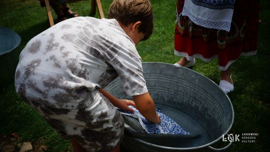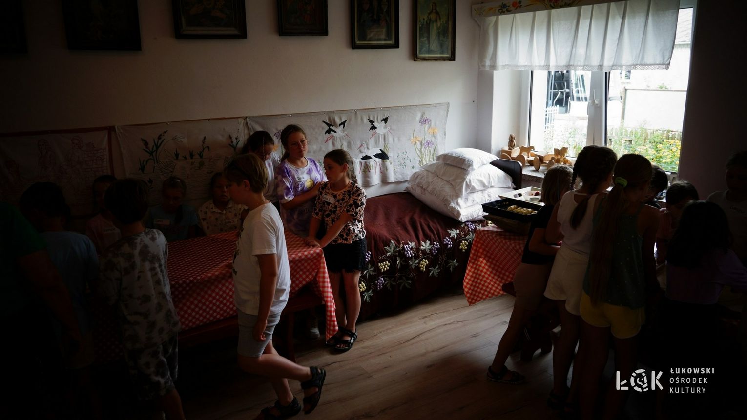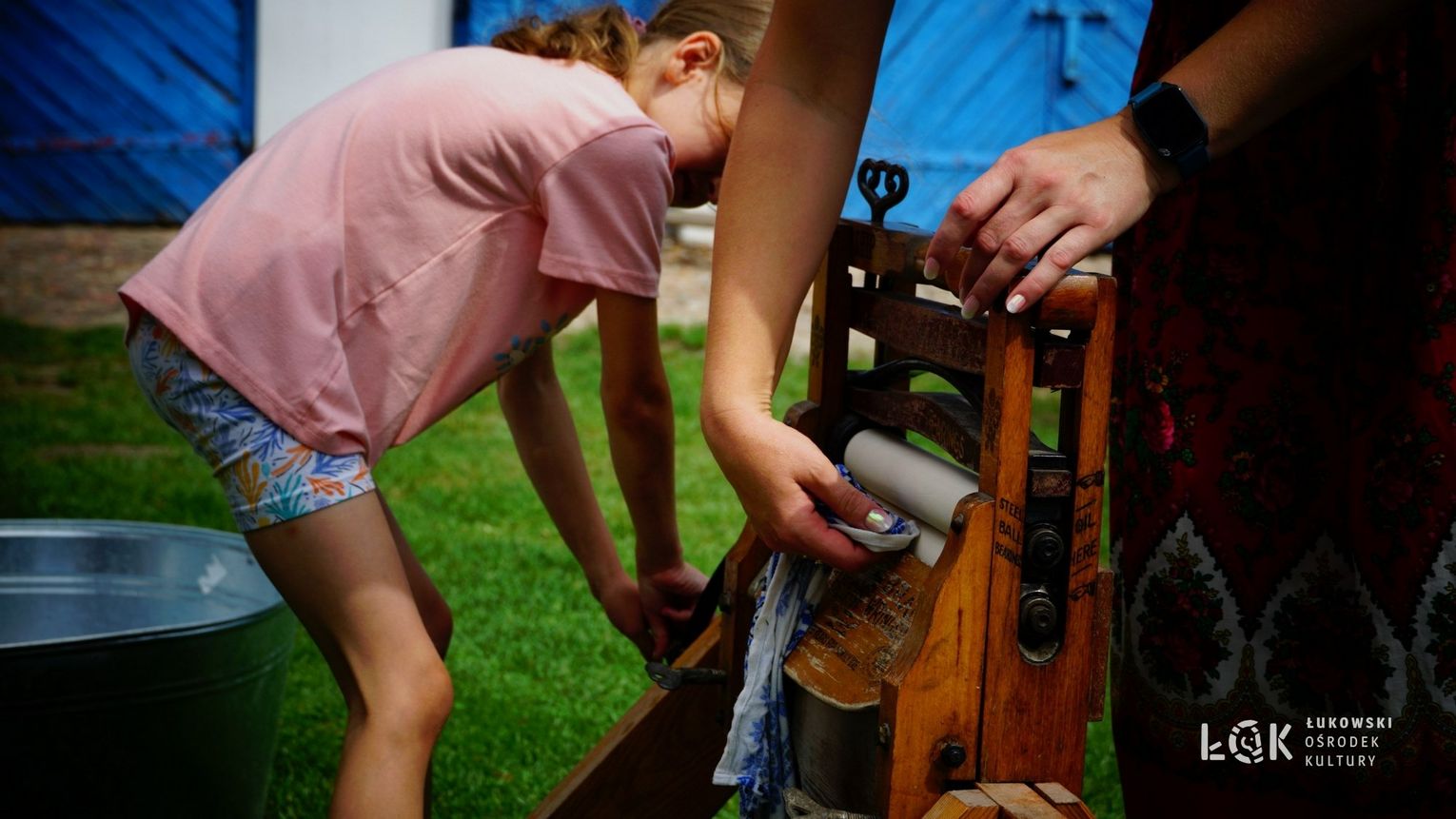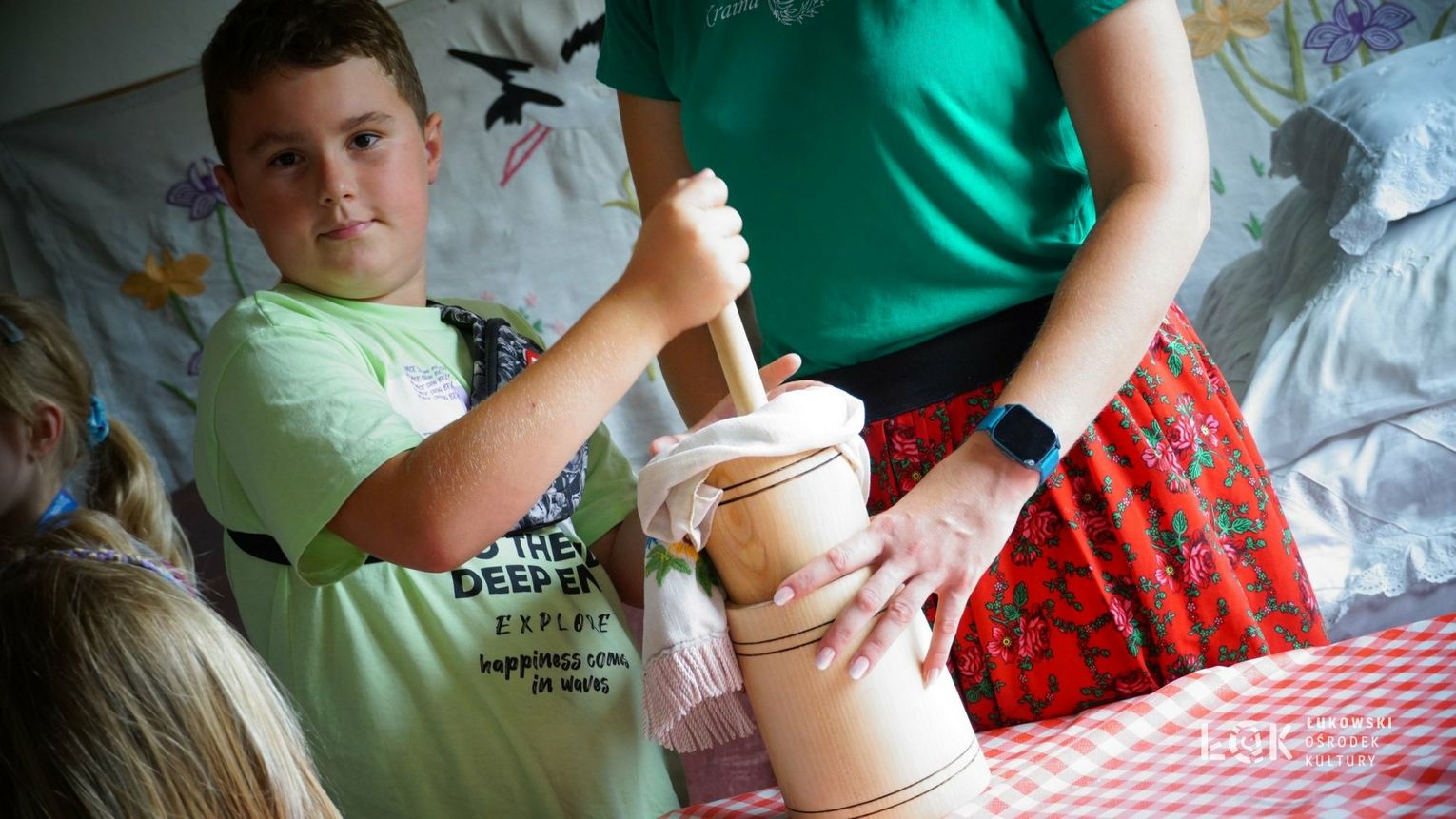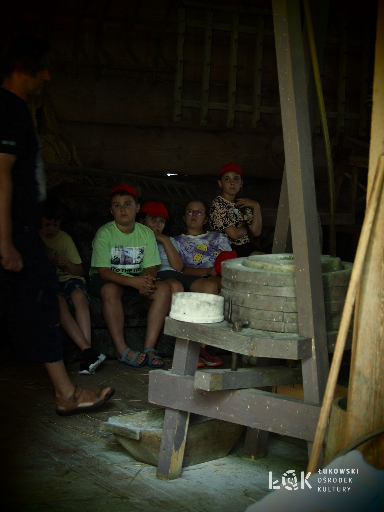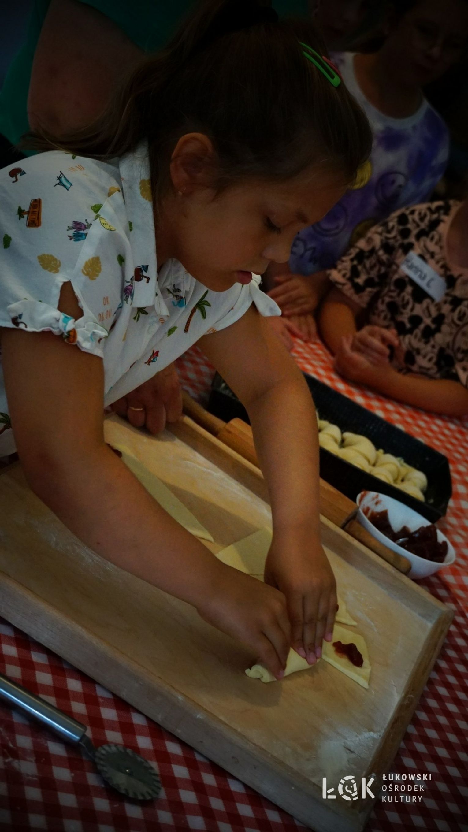 Kraina Rumianku to wioska tematyczna, w której dzieci, młodzież oraz dorośli mogą doświadczyć, jak żyli, pracowali i odpoczywali nasi przodkowie. Wszystko to dzieje się w scenerii polskiej wsi, gdzie dawne obyczaje są wciąż żywe i praktykowane. Dzieci z Łukowskiego Ośrodka Kultury wzięły udział w warsztatach „Od ziarna do chleba”, podczas których poznali tradycyjne sposoby uprawy zboża i jego przechowywania, nauczyły się młócenia cepem, czyszczenia ziarna, mielenia zboża w kamiennych żarnach. Miały także okazję przygotowywać ciasto i upiec w piecu chlebowym słodkie rogaliki, które potem mogły zjeść ze smakiem. Następnie uczestnicy zajęć w ŁOK wzięli udział w warsztatach „Dawne zajęcia domowe”, w trakcie których miały okazję m.in. wyprasować i wymaglować bieliznę, własnoręcznie upraną wcześniej w balii, zobaczyć, jak wyglądała dawna wiejska izba i co się w niej działo do świtu do zmierzchu, ubić masło w maselnicy i zjeść je ze smakiem z chlebem oraz nauczyć się prasowania żelazkiem na węgiel i z duszą. Uczestnicy warsztatów oprócz walorów edukacyjnych i integracyjnych, spędzili twórczo czas. Dodatkowo mogli czerpali radość z poznawania dziedzictwa kulturowego i przyrodniczego naszego regionu.
