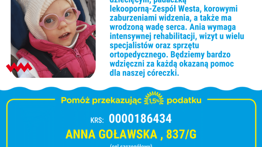 zmaga się z mózgowym porażeniem dziecięcym, padaczką lekooporną-Zespół Westa, korowymi zaburzeniami widzenia, a także ma wrodzoną wadę serca. Ania wymaga intensywnej rehabilitacji, wizyt u wielu specjalistów oraz sprzętu ortopedycznego.