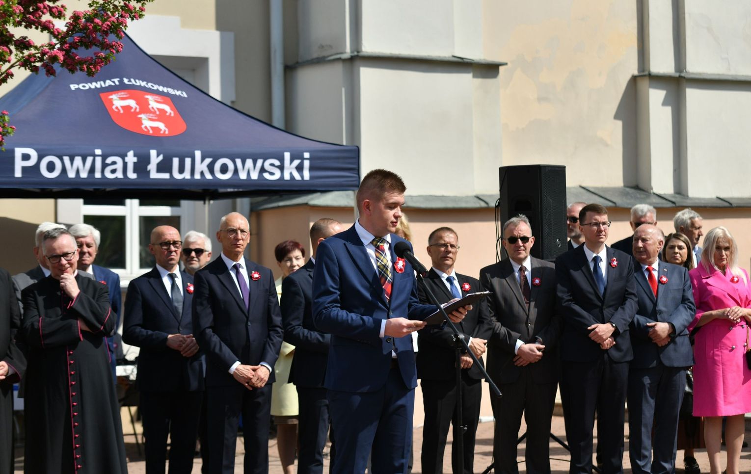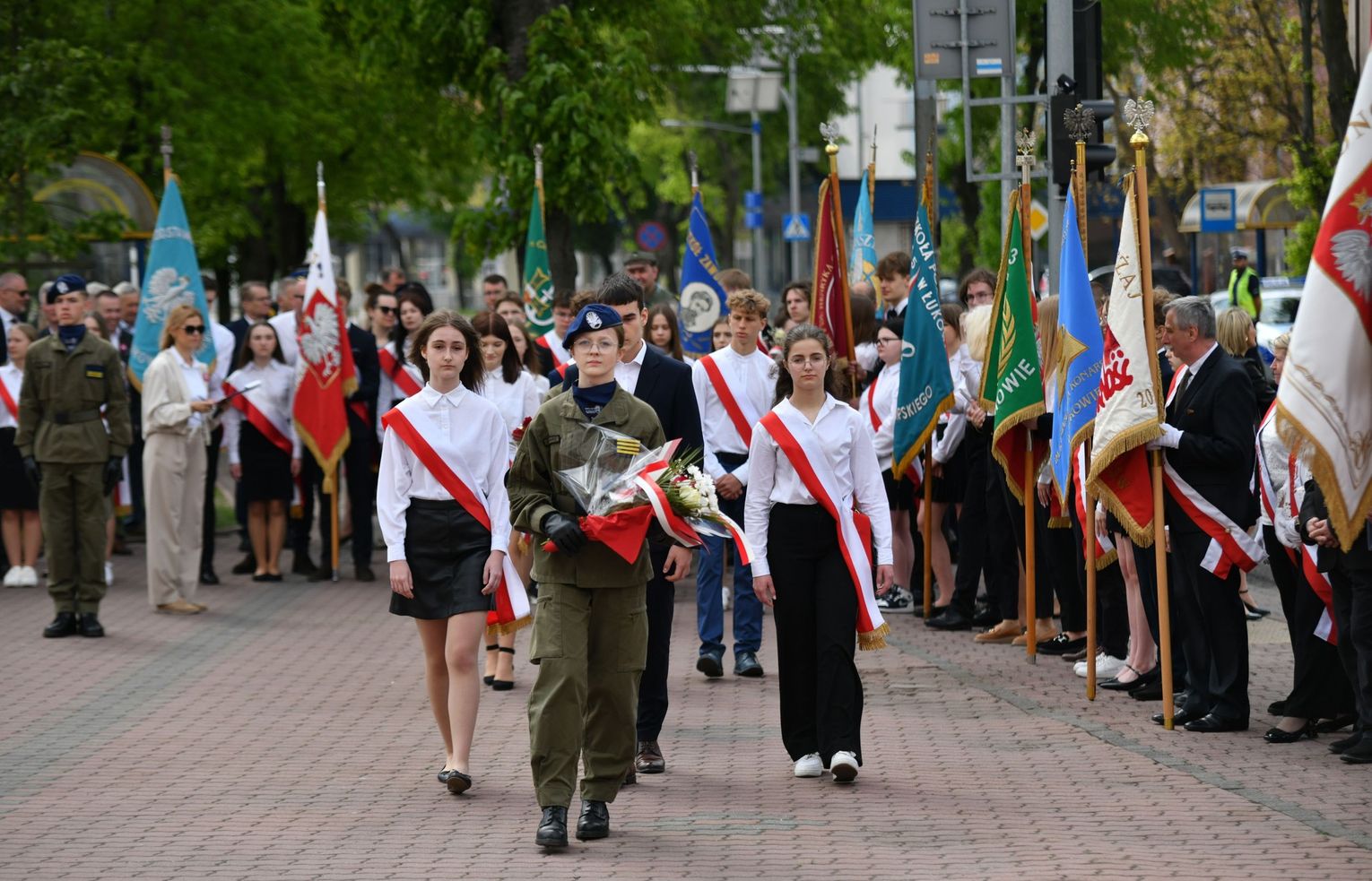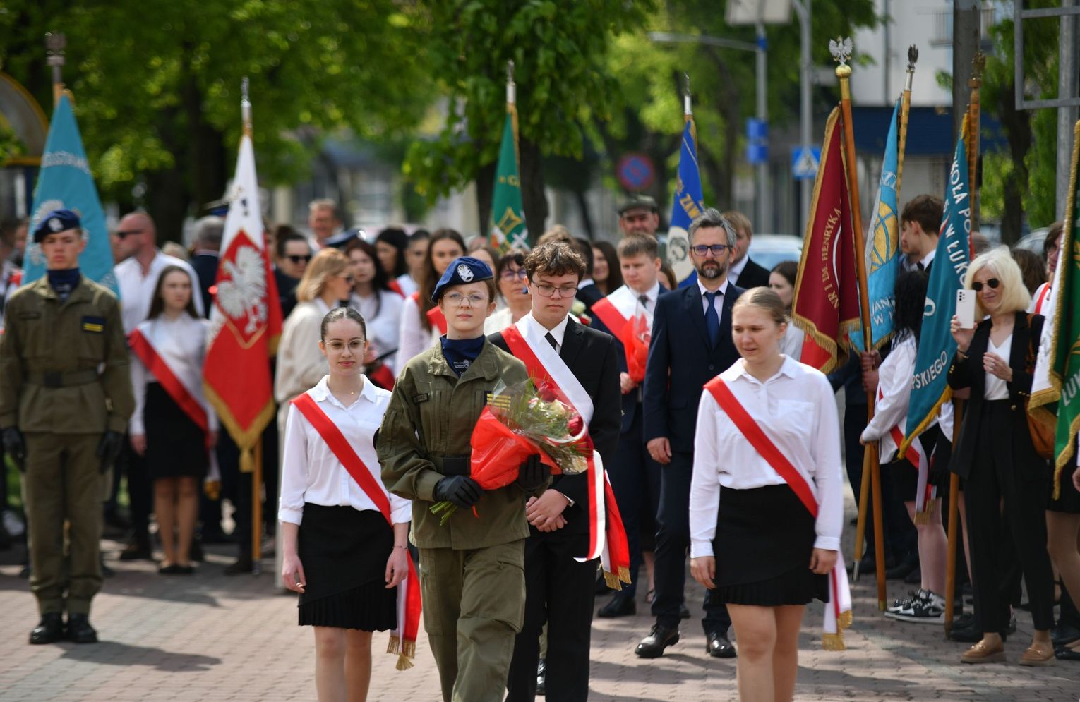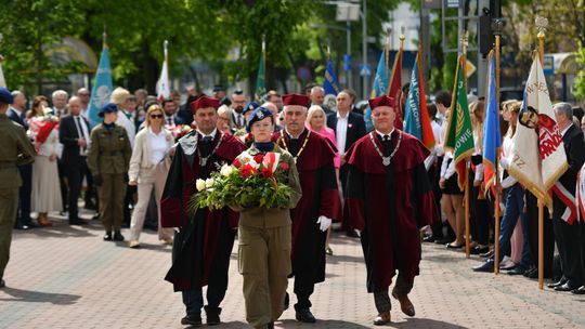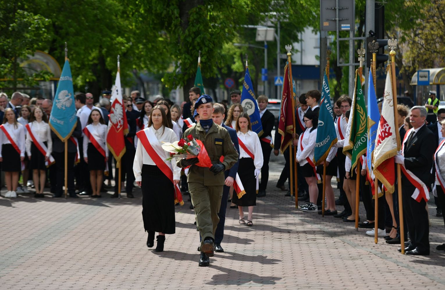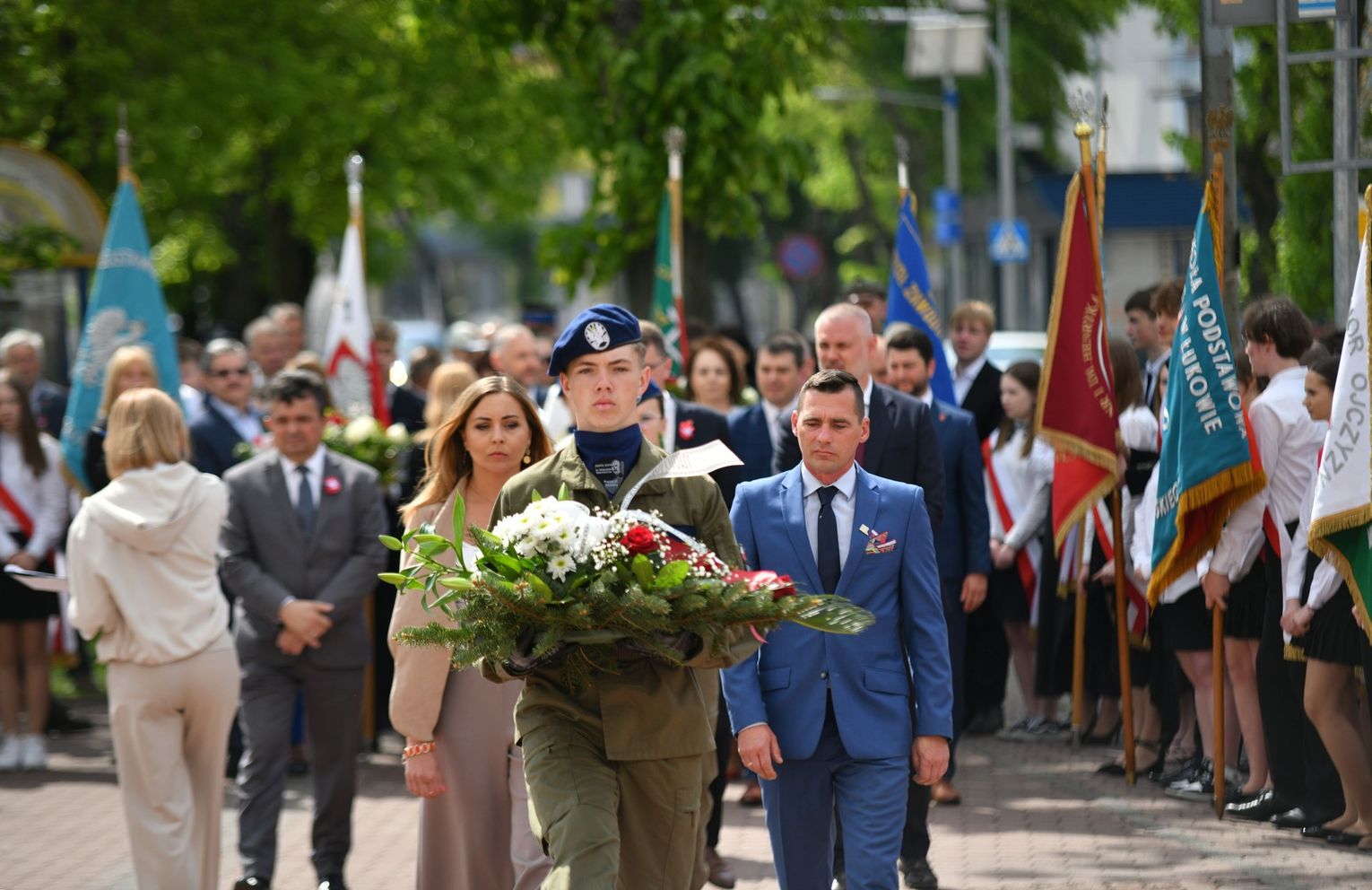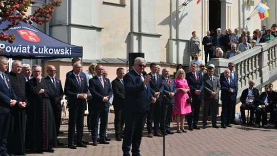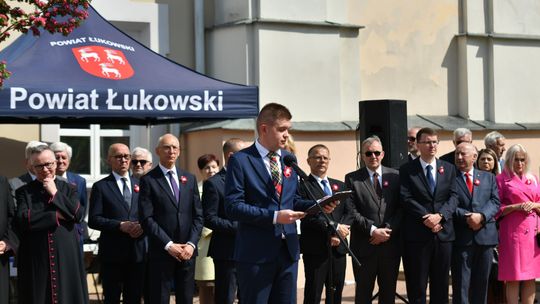 Wydarzenie rozpoczęła Msza Święta w Kolegiacie pw. Przemienienia Pańskiego, z udziałem pocztów sztandarowych instytucji i szkół z terenu Powiatu Łukowskiego. Dalsza część obchodów odbyła się pod tablicą upamiętniającą uchwalenie Konstytucji 3 Maja w Łukowie. Uroczystość rozpoczęła się przemówieniem Posła na Sejm Rzeczypospolitej Polskiej Sławomira Skwarka. Następnie listy okolicznościowe odczytali: w imieniu Marszałka Województwa Lubelskiego Jarosława Stawiarskiego – Radny Sejmiku Województwa Lubelskiego Ryszard Szczygieł oraz w imieniu Wojewody Lubelskiego Krzysztofa Komorskiego – Zastępca Burmistrza Miasta Łuków Mateusz Popławski. Okolicznościowe przemówienie w imieniu samorządu powiatowego, miejskiego i gminnego wygłosił Starosta Łukowski Dariusz Szustek. Kolejnym punktem uroczystości był pokaz musztry paradnej w wykonaniu kadetów klas mundurowych z Zespół Szkół im. Władysława Tatarkiewicza w Radoryżu Smolanym. Trenerem i dobrym duchem kadetów jest Daniel Sobczak. Zarząd Powiatu Łukowskiego postanowił nagrodzić reprezentacyjny oddział musztry paradnej z Zespołu Szkół im. Władysława Tatarkiewicza w Radoryżu Smolanym za aktywne uczestnictwo w prestiżowych konkursach o zasięgu ogólnopolskim oraz regularne zdobywanie czołowych lokat. W uznaniu tych osiągnięć oddział otrzymał od Zarządu Powiatu szablę reprezentacyjną. Ostatnim punktem uroczystości było złożenie kwiatów przed tablicą upamiętniającą uchwalenie Konstytucji 3 Maja w Łukowie znajdującej się na budynku Powiatowego Urzędu Pracy. Uroczystość uświetnił występ orkiestry dętej Towarzystwa Muzycznego im. Antoniego Próchniewicza w Łukowie pod batutą kapelmistrza Tadusza Bochmana. W ramach obchodów odbyły się również XXXII Łukowskie Uliczne Biegi 3 Maja pod honorowym patronatem Rady i Burmistrza Miasta Łuków. Niech żyje Konstytucja 3 Maja! Niech żyje Polska!