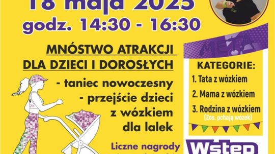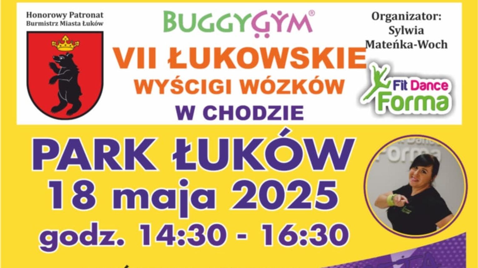 Początek o godzinie 14:30. Uczestnicy zabawy będą mieć do pokonania dystans 100 kroków, a rywalizować będą w kategoriach: mama z wózkiem, tata z wózkiem i rodzina z wózkiem (dwie osoby pchają wózek). Będzie też taniec nowoczesny oraz przejście trasy przez dzieci z wózkiem dla lalek. Zapisy: Fit Dance Forma – Sylwia Mateńka-Woch, Łuków ul. Siedlecka 10A, tel. 515-913-310. Na uczestników czekają: fantastyczne nagrody, pokaz tańca nowoczesnego, strefa rozrywki dla dzieci i świetna zabawa! Organizatorem wydarzenia jest Fit Dance Forma i Sylwia Mateńka-Woch. Partnerami wydarzenia są m.in. Łukowski Ośrodek Kultury oraz Kino Łuków. Honorowy Patronat nad imprezą objął Burmistrz Miasta Łuków Piotr Płudowski.