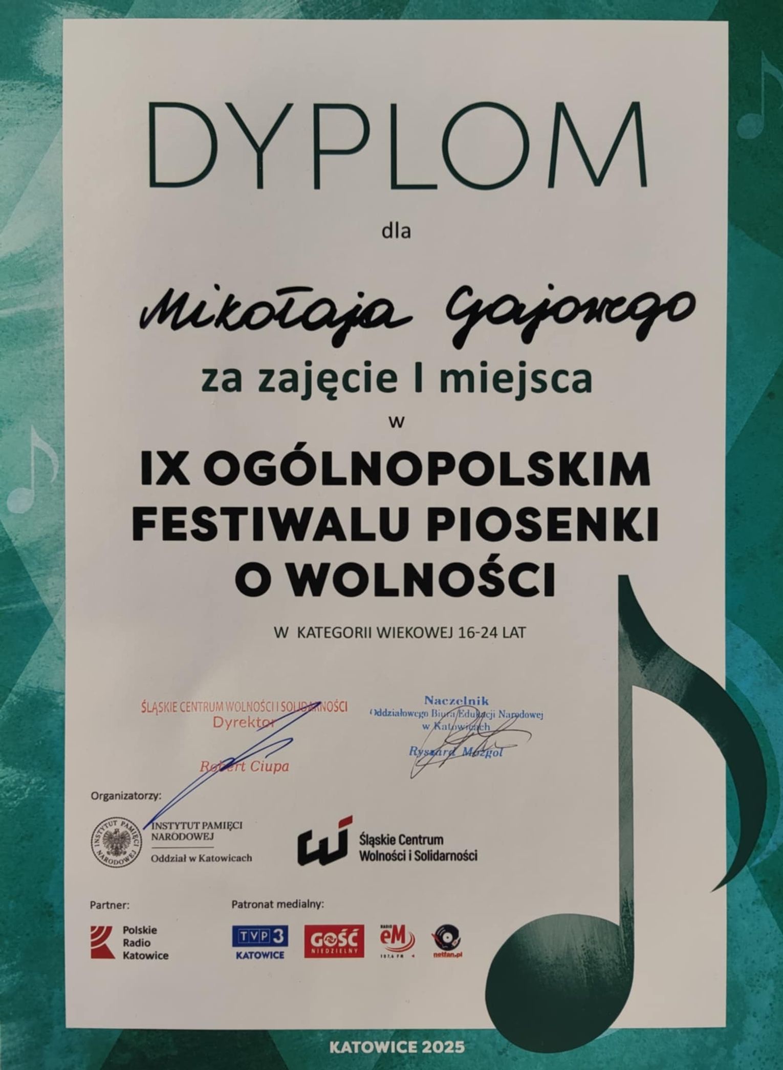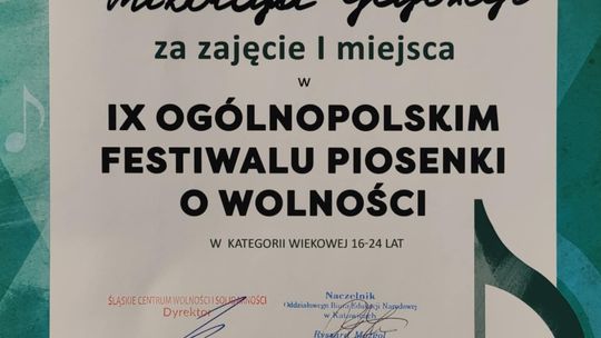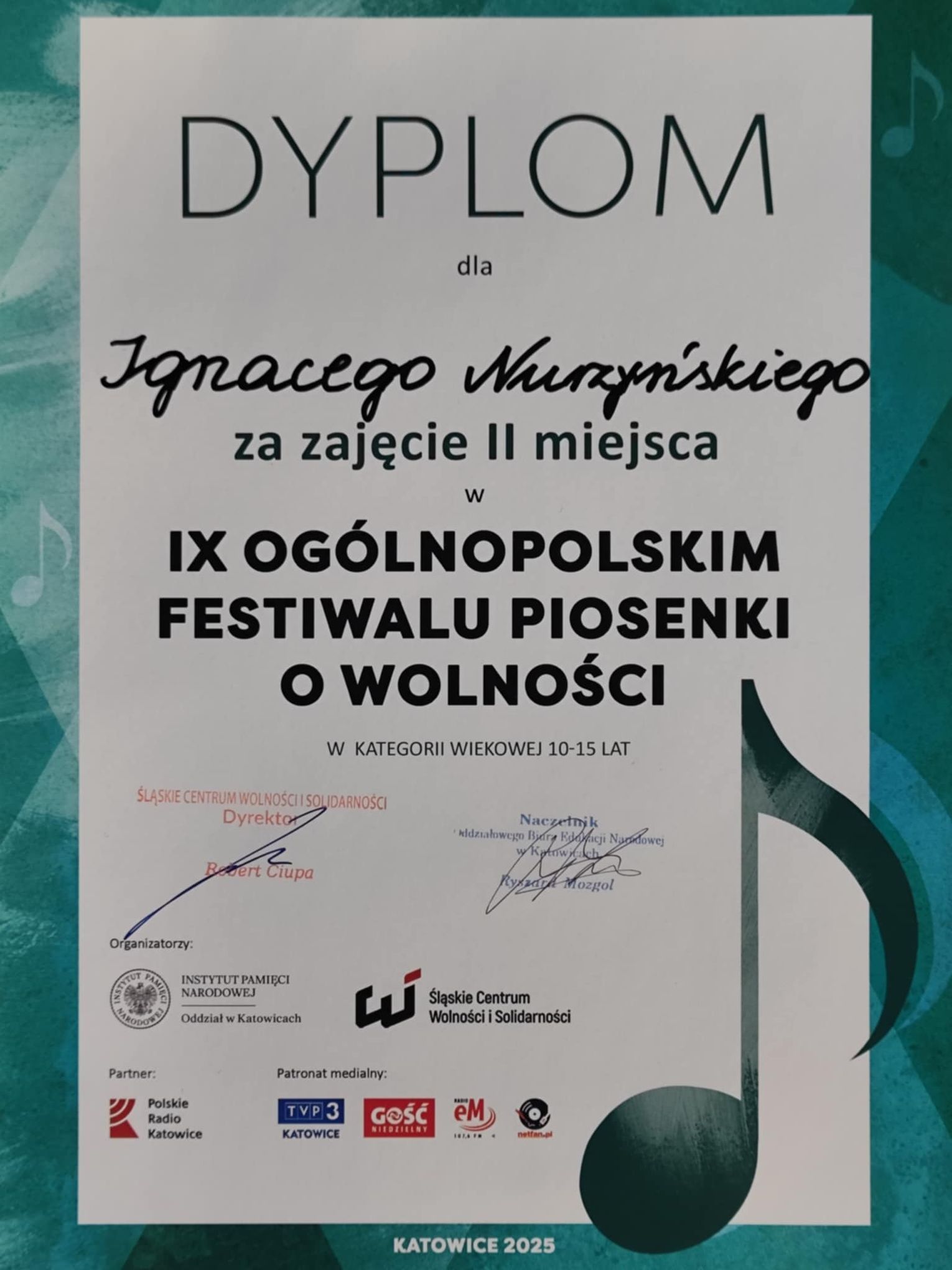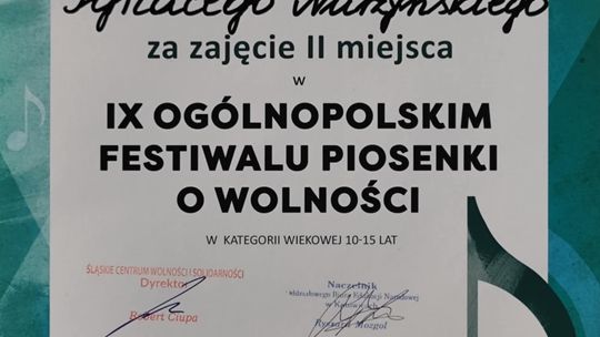 Z ogromną radością i dumą chcemy poinformować, że Mikołaj Gajowy za wykonanie utworu "Nim wstanie świt" otrzymał I miejsce w kategorii starszej, a Ignacy Nurzyński za interpretację utworu "Nie pytaj o Polskę" wyśpiewał II miejsce! To wielkie sukcesy naszych chłopaków!