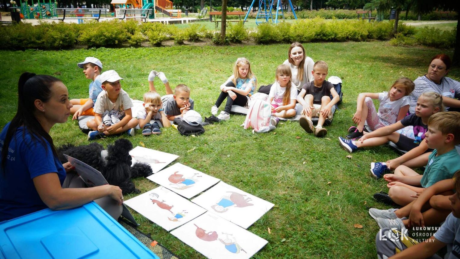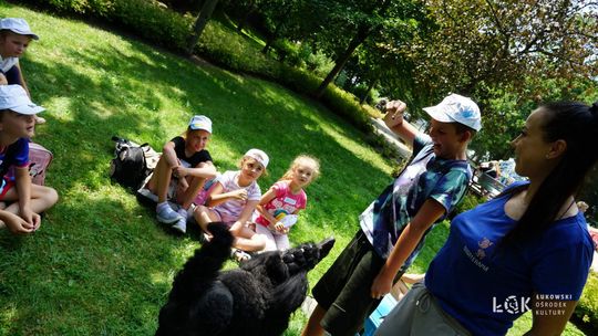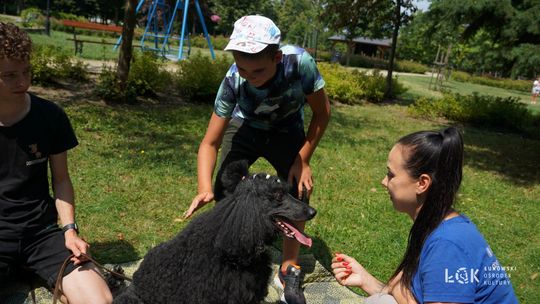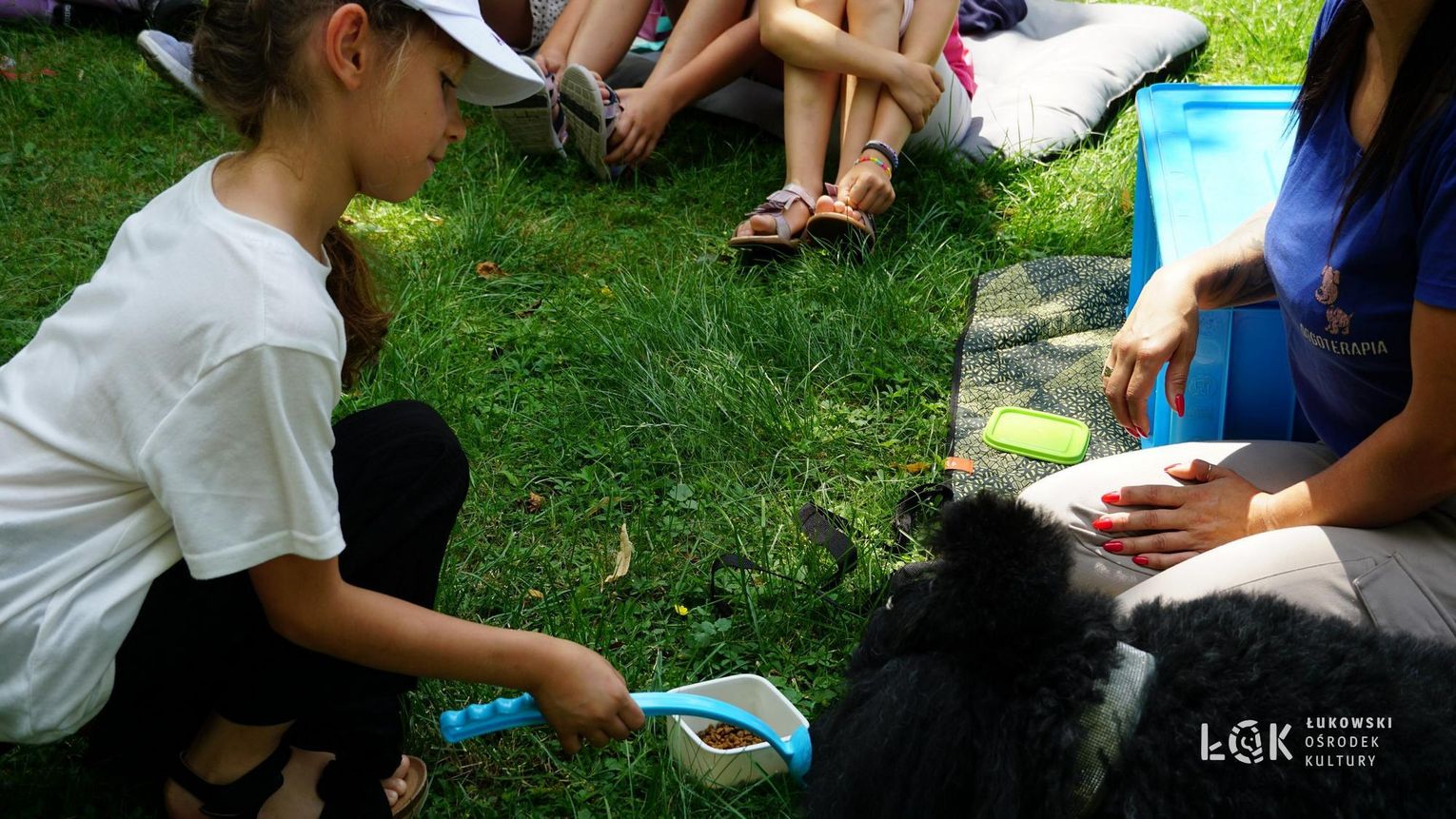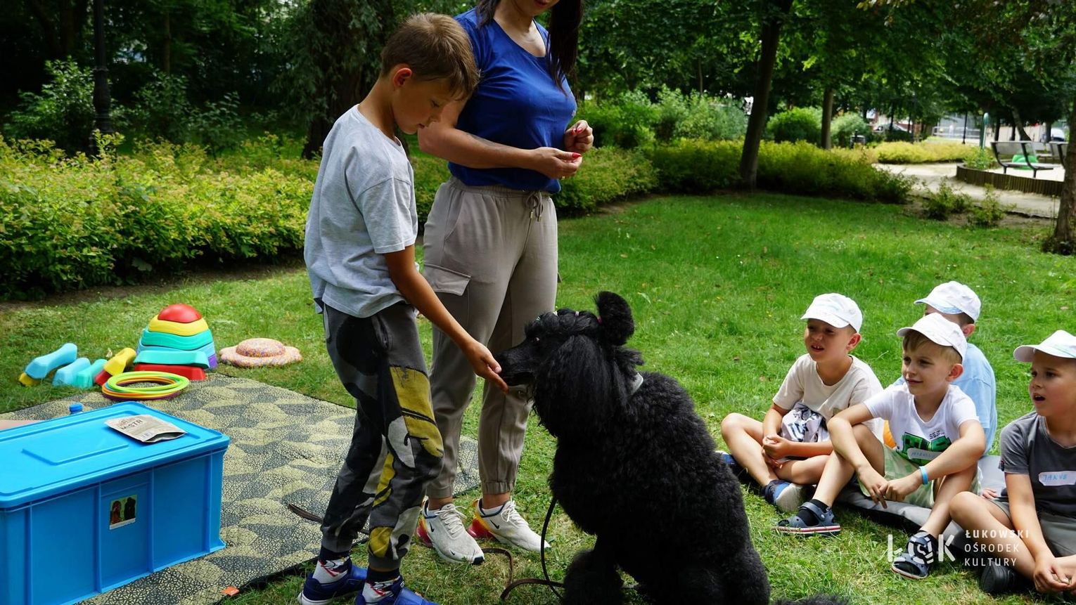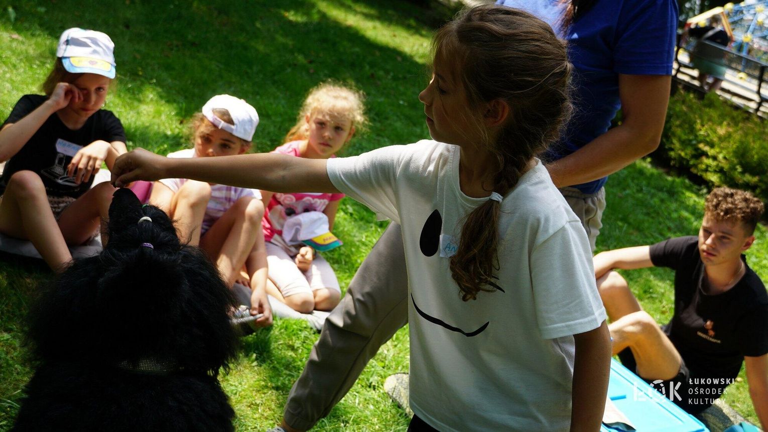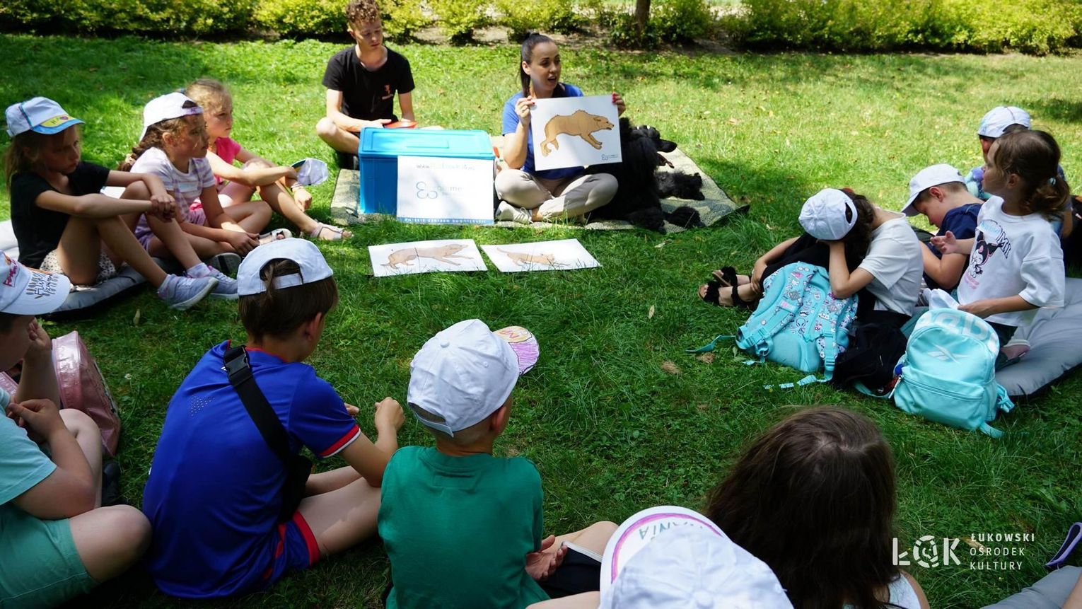 W poniedziałek 7 lipca 2025r. ropoczęły sie półkolonie w Łukowskim Ośrodku Kultury. Pierwszy dzień Wakacji ŁOK 2025 „Wokół zwierząt świata” zaczął się zabawami integracyjnymi. Następnie odbyły się inspirujące i kreatywne zajęcia plastyczne. Podczas tych warsztatów dzieci miały okazję wyrazić swoją wyobraźnię i pasję do zwierząt poprzez tworzenie unikalnych worko-plecaków. Każde dziecko wybrało swoje ulubione zwierzę i namalowało je na powierzchni plecaka, korzystając ze specjalnych markerów do tkanin. Dodatkowo, przestrzeń na plecaku została wykorzystana do przedstawienia innych elementów związanych z wybranym zwierzęciem lub własnych pomysłów, co pozwoliło na jeszcze bardziej osobiste i oryginalne projekty. Uczestnicy zajęć tym samym sposobem stworzyli własne kompozycje na czapkach, które będą nam odtąd towarzyszyć każdego dnia Wakacji ŁOK 2025. Następnie uczestnicy udali się do Parku Miejskiego, gdzie mogli korzystać ze Strefy Rozrywki Smykolandia Anna Siemionek. Była wspaniała zabawa, dmuchańce, lody i wata cukrowa. Na zakończenie pierwszego dnia, dzieci wzięły udział w dogoterapii, którą poprowadziła Monika Kozłowska. Uczestnicy wydając psu komendy, wchodzili w interakcję ze zwierzęciem. Warsztaty te pomagają w rozwoju fizycznym dziecka oraz w kształtowaniu i rozwijaniu umiejętności okazywania emocji i uczuć. Zajęcia te uczą również samodzielności, stwarzając dziecku możliwość wywiązywania się z działań podejmowanych wobec psa. Dzieci odkryły, że kontakt, zabawa i głaskanie odpowiednio przeszkolonego psa, znacząco poprawia samopoczucie zarówno dzieci, jak i dorosłych.