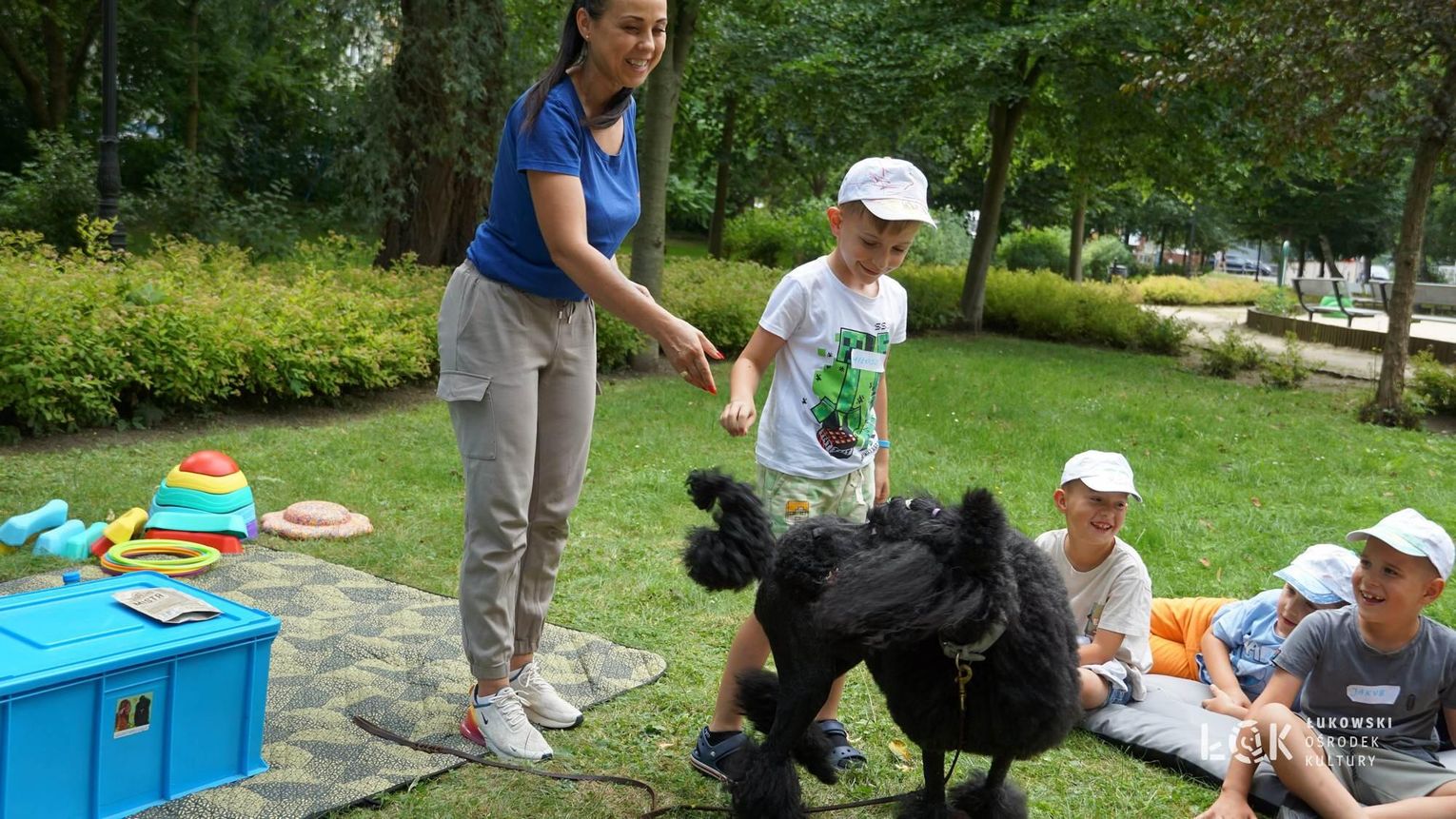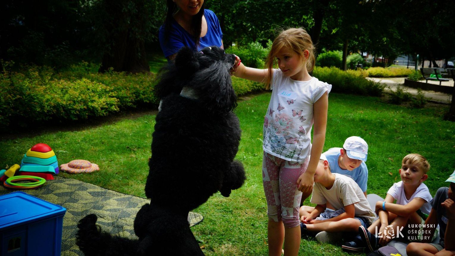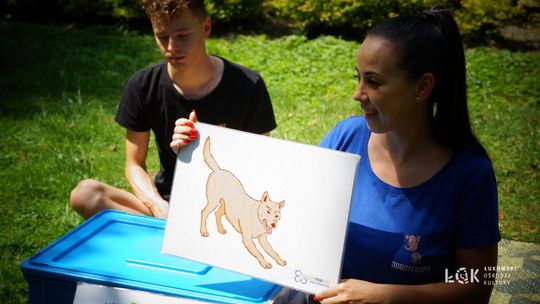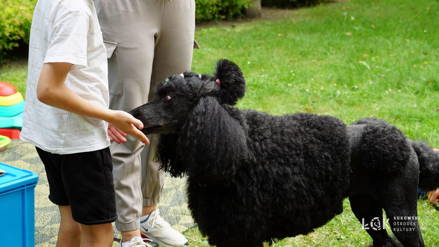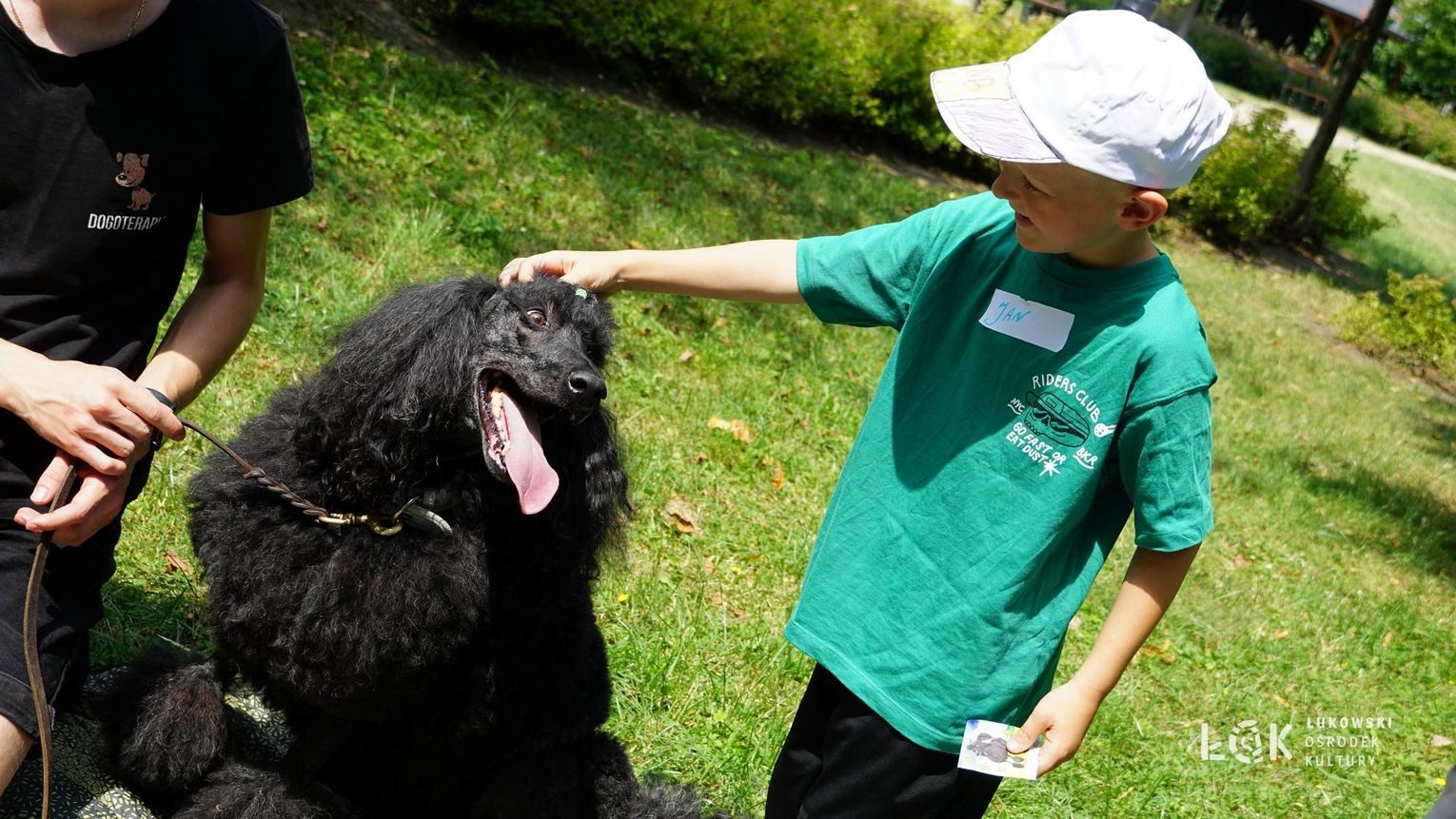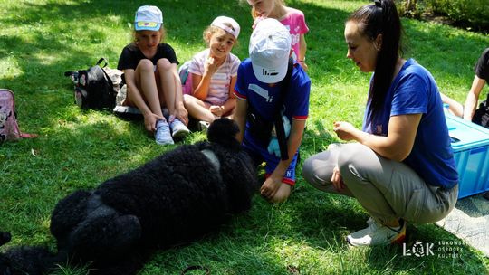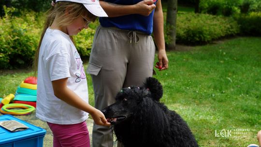 W poniedziałek 7 lipca 2025r. ropoczęły sie półkolonie w Łukowskim Ośrodku Kultury. Pierwszy dzień Wakacji ŁOK 2025 „Wokół zwierząt świata” zaczął się zabawami integracyjnymi. Następnie odbyły się inspirujące i kreatywne zajęcia plastyczne. Podczas tych warsztatów dzieci miały okazję wyrazić swoją wyobraźnię i pasję do zwierząt poprzez tworzenie unikalnych worko-plecaków. Każde dziecko wybrało swoje ulubione zwierzę i namalowało je na powierzchni plecaka, korzystając ze specjalnych markerów do tkanin. Dodatkowo, przestrzeń na plecaku została wykorzystana do przedstawienia innych elementów związanych z wybranym zwierzęciem lub własnych pomysłów, co pozwoliło na jeszcze bardziej osobiste i oryginalne projekty. Uczestnicy zajęć tym samym sposobem stworzyli własne kompozycje na czapkach, które będą nam odtąd towarzyszyć każdego dnia Wakacji ŁOK 2025. Następnie uczestnicy udali się do Parku Miejskiego, gdzie mogli korzystać ze Strefy Rozrywki Smykolandia Anna Siemionek. Była wspaniała zabawa, dmuchańce, lody i wata cukrowa. Na zakończenie pierwszego dnia, dzieci wzięły udział w dogoterapii, którą poprowadziła Monika Kozłowska. Uczestnicy wydając psu komendy, wchodzili w interakcję ze zwierzęciem. Warsztaty te pomagają w rozwoju fizycznym dziecka oraz w kształtowaniu i rozwijaniu umiejętności okazywania emocji i uczuć. Zajęcia te uczą również samodzielności, stwarzając dziecku możliwość wywiązywania się z działań podejmowanych wobec psa. Dzieci odkryły, że kontakt, zabawa i głaskanie odpowiednio przeszkolonego psa, znacząco poprawia samopoczucie zarówno dzieci, jak i dorosłych.