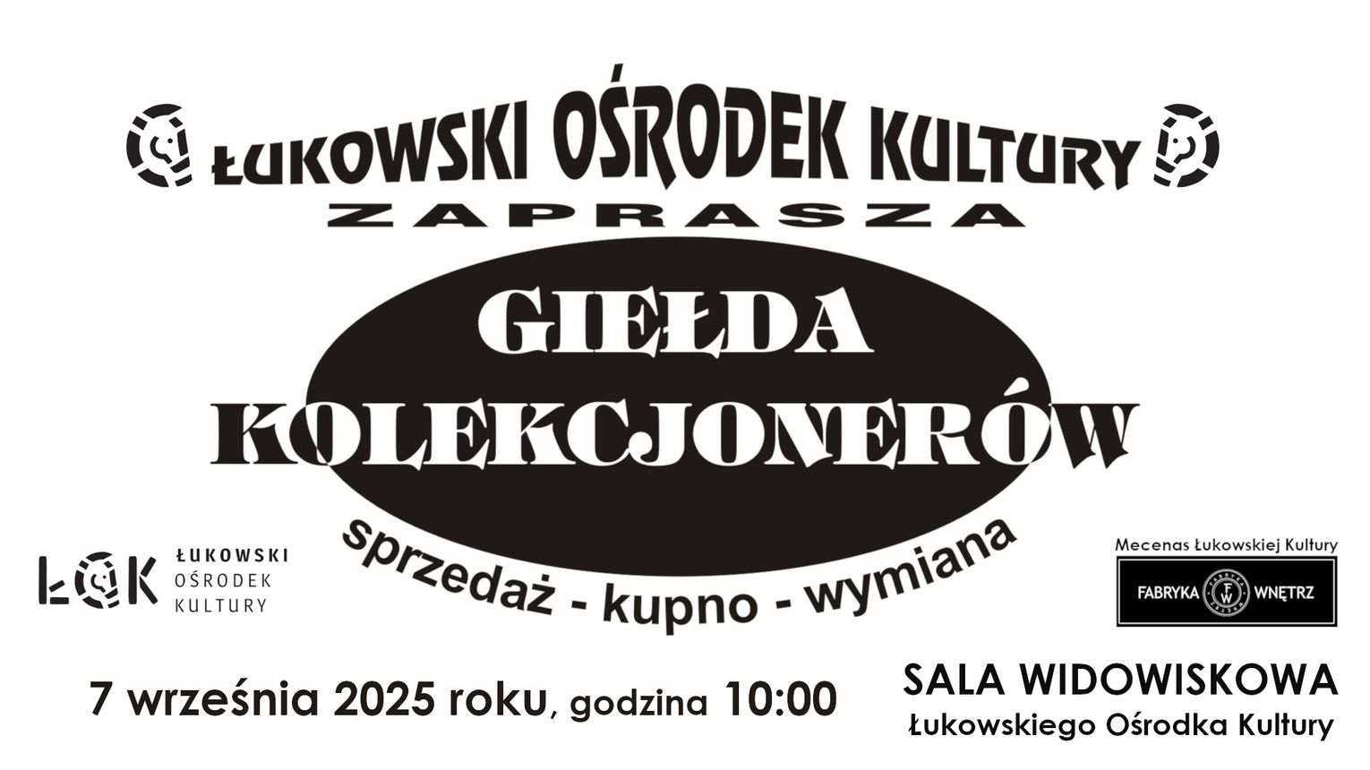 Łukowski Ośrodek Kultury zaprasza na kolejną Giełdę Kolekcjonerów. Odbędzie się ona w niedzielę 7 września 2025 roku od godziny 10:00 w Sali widowiskowej ŁOK.