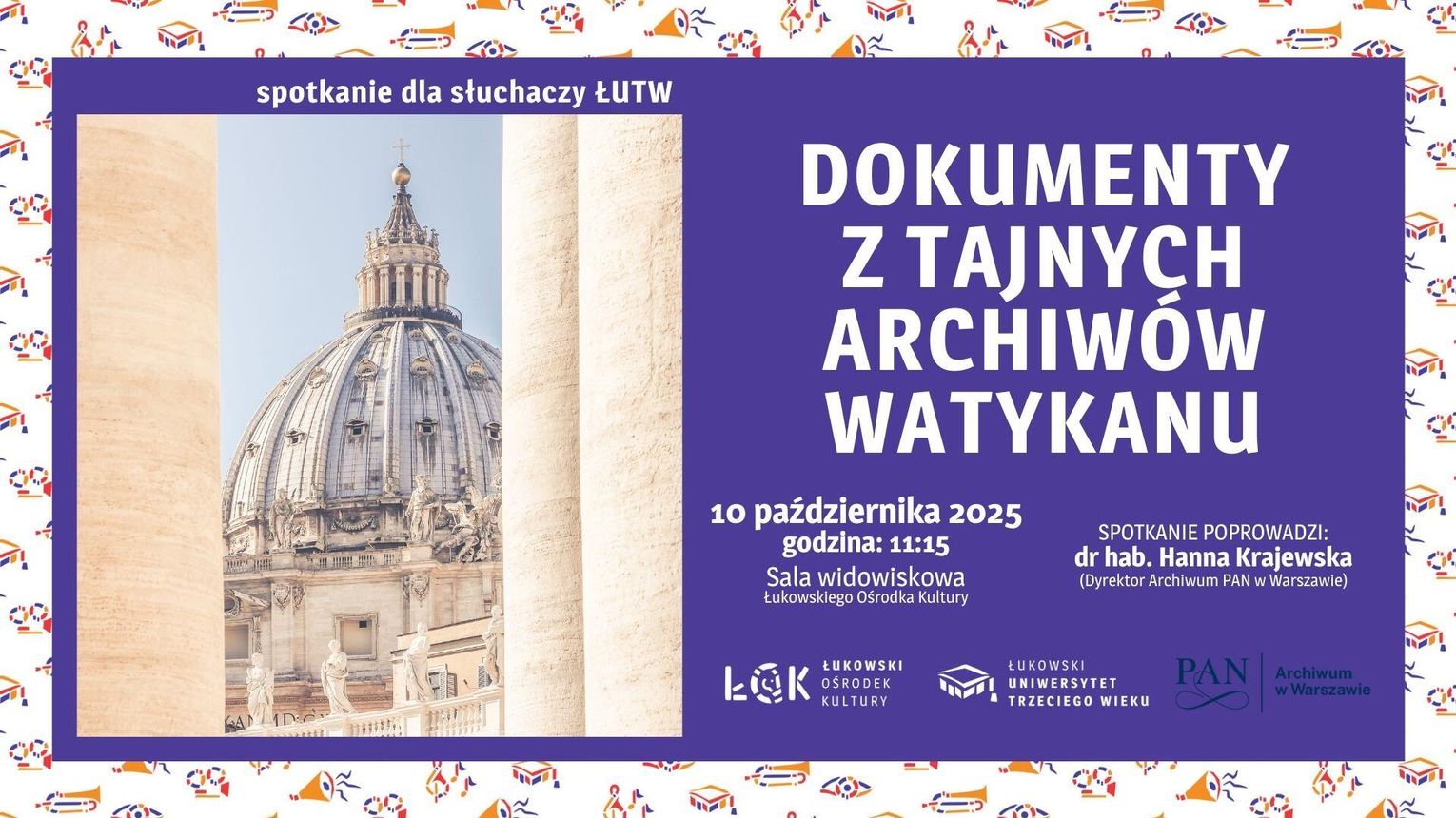 Dokumenty z tajnych archiwów Watykanu są opowieścią o wystawie, którą zorganizował Watykan w 400 lecie utworzenia swojego archiwum. Na wystawie pokazane były unikalne dokumenty oraz fascynujące opisy związane z ich powstaniem i postaciami, których dotyczą. Na wykładzie przedstawione będą min. dokumenty dotyczące Galileusza, Krzysztofa Kolumba, Henryka VIII, Marii Antoniny, Jana III Sobieskiego, procesu Templariuszy i innych.