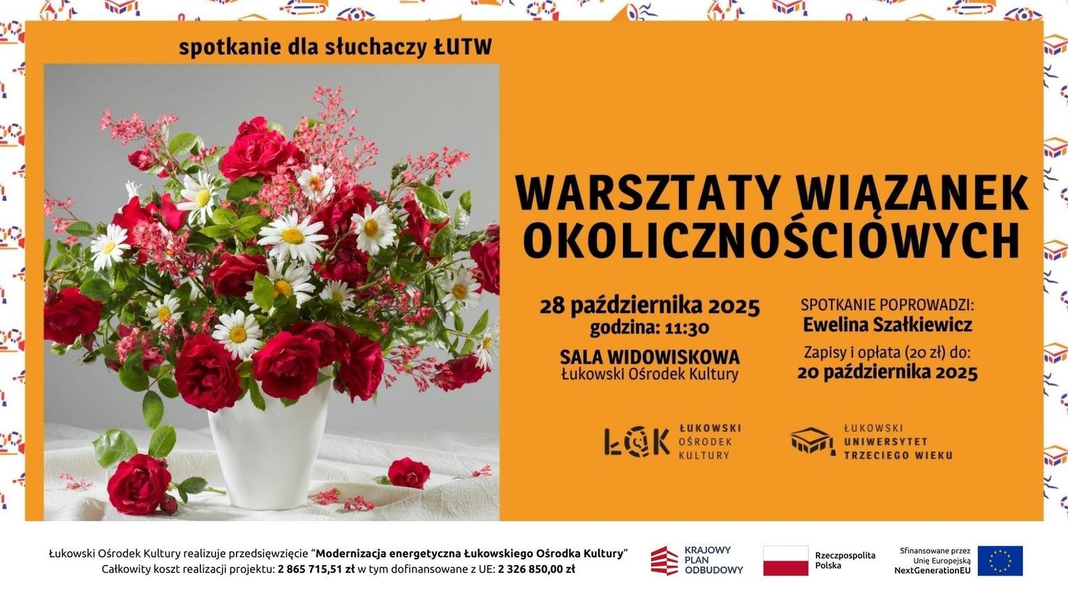 Koszt udziału w warsztatach to 20 zł. Zapisy i opłata do 20 października 2025r. W ramach opłaty zapewniamy kwiaty, gąbkę florystyczną, drucik. Prosimy o przyniesienie gałązek świerka, jodły, tui i innych roślin.
