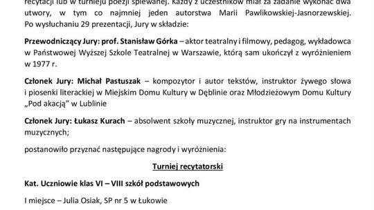 Po wysłuchaniu 29 wykonawców Jury przyznało nagrody i wyróżnienia. Wsród nagrodzonych osób znaleźli się recytatorzy Łukowskiego Ośrodka Kultury.