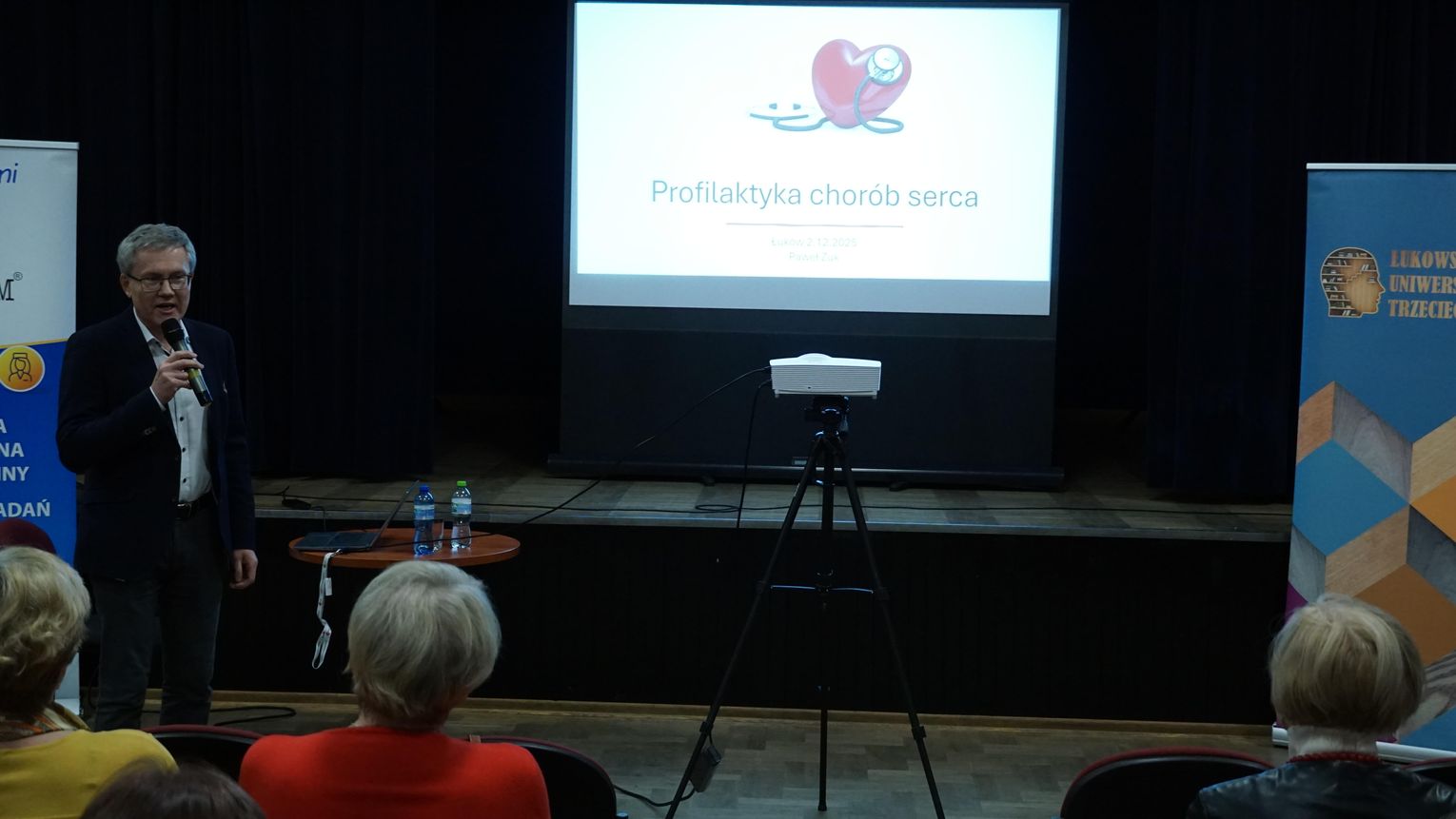 Grudzień w Łukowskim Uniwersytecie Trzeciego Wieku rozpoczęliśmy pod znakiem profilaktyki chorób serca. 2 grudnia 2025r. odbyło się spotkanie, które poprowadził dr Paweł Żuk, kardiolog, członek Polskiego i Europejskiego Towarzystwa Kardiologicznego, ekspert w zespole ds. wdrożenia opieki koordynowanej w POZ, powołanym przez Ministerstwo Zdrowia, Przewodniczący Rady Nadzorczej oraz współzałożyciel Centrum Medyczno-Diagnostycznego Sp. z o. o.
