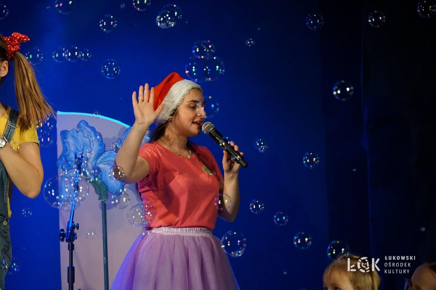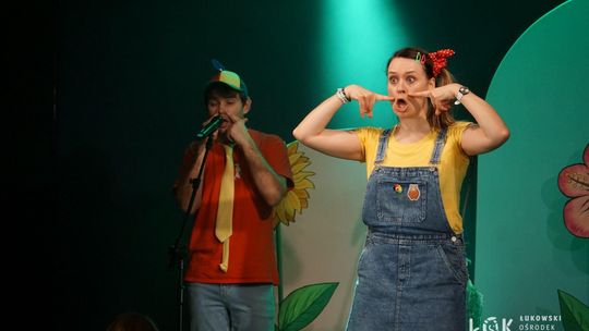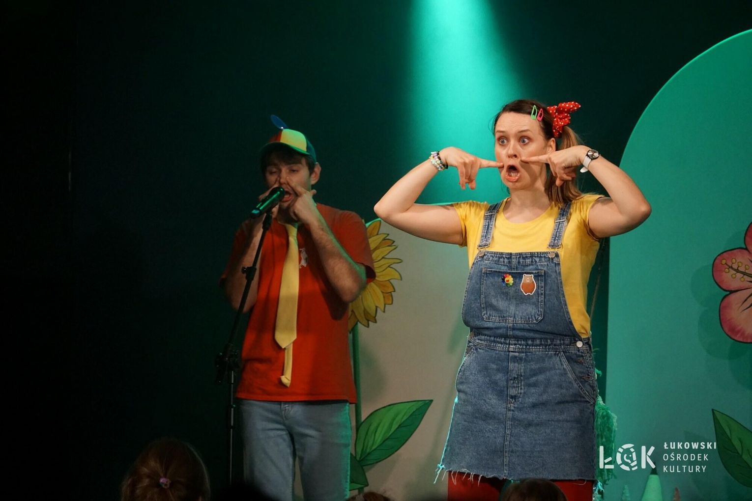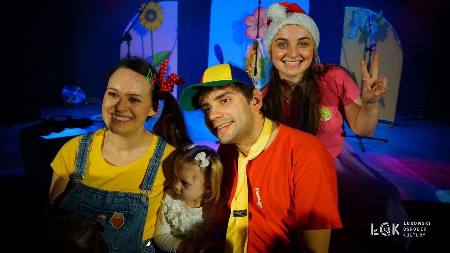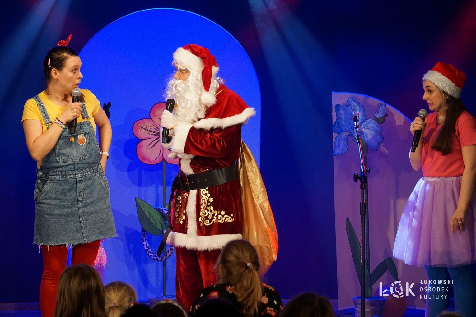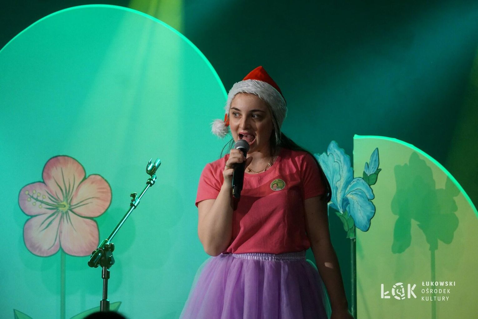 Karolina, Kasia i Mateusz porwali dzieci do krainy tańca, śmiechu i czarów. Mali uczestnicy przez pełną godzinę tańczyli i śpiewali wraz z artystami do swoich ulubionych piosenek, jak „Idziemy przez dżunglę”, „Ciała kształt”, „Tańce Połamańce”, „Kubeczek”, „Rozbawiony tydzień” i wiele innych hitów, które wprowadziły prawdziwie bajkową atmosferę. Co chwilę pojawiały się też animacje, magiczne sztuczki, serpentyny i bańki mydlane, które wywoływały szerokie uśmiechy i okrzyki zachwytu. Odwiedził nas też Święty Mikołaj! Była to kolejna odsłona „Niedzieli z teatrem”, która po raz kolejny udowodniła, że kultura potrafi przenosić dzieci i dorosłych do świata pełnego fantazji. Tego dnia Łukowski Ośrodek Kultury wypełnił się radością, tańcem i atmosferą mikołajkowej przygody, a zespół Spoko Loko pozostawił za sobą ślad tak kolorowy, bajkowy, radosny i świetlisty, jakby przez ŁOK przeszła kolorowa gwiezdna kometa.