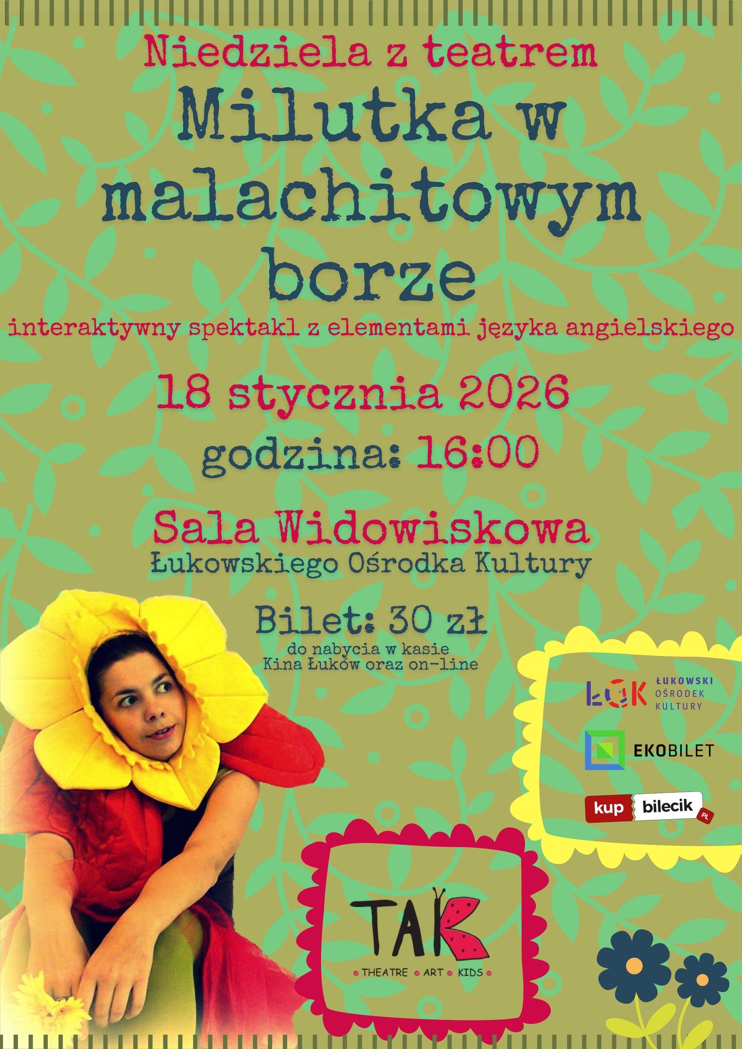 Bilety na spektakl teatralny „Milutka w malachitowym borze” w cenie 30 zł do nabycia są w kasie Kina Łuków oraz online na stronach ekobilet.pl i kupbilecik.pl