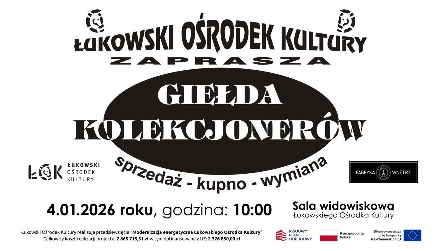 Łukowski Ośrodek Kultury realizuje przedsięwzięcie “Modernizacja energetyczna Łukowskiego Ośrodka Kultury”. Całkowity koszt realizacji projektu: 2 865 715,51 zł w tym dofinansowane z UE: 2 326 850,00 zł