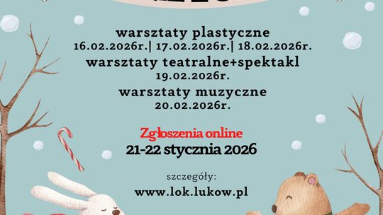 - warsztaty teatralne + spektakl "Czerwony kapturek", 19.02.2026r., wiek 7-10 lat, koszt 140 zł,