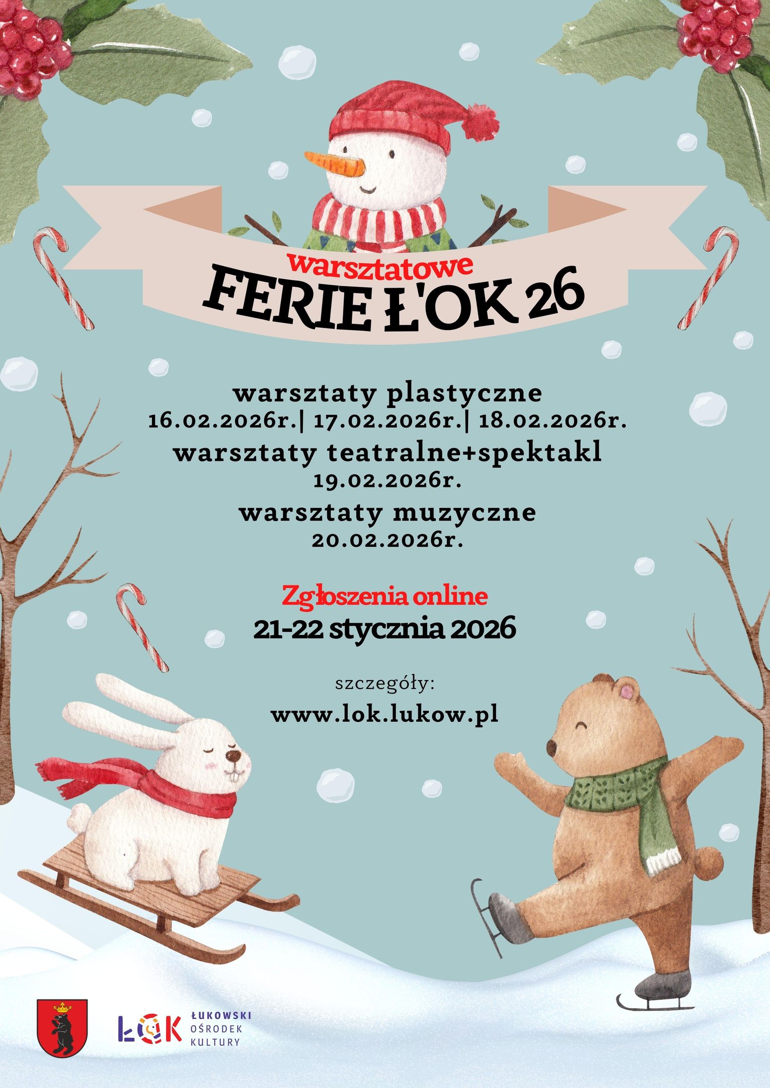 Zapisy na poszczególne zajęcia (plastyczne lub teatralne + spektakl lub muzyczne) odbędą się poprzez wypełnienie formularza zgłoszeniowego na stronie zgloszenia.lok.lukow.pl, dołączenie RODO dziecka oraz opcjonalnie pozwolenia na samodzielne przyjście na zajęcia/ powrót do domu w dniach: