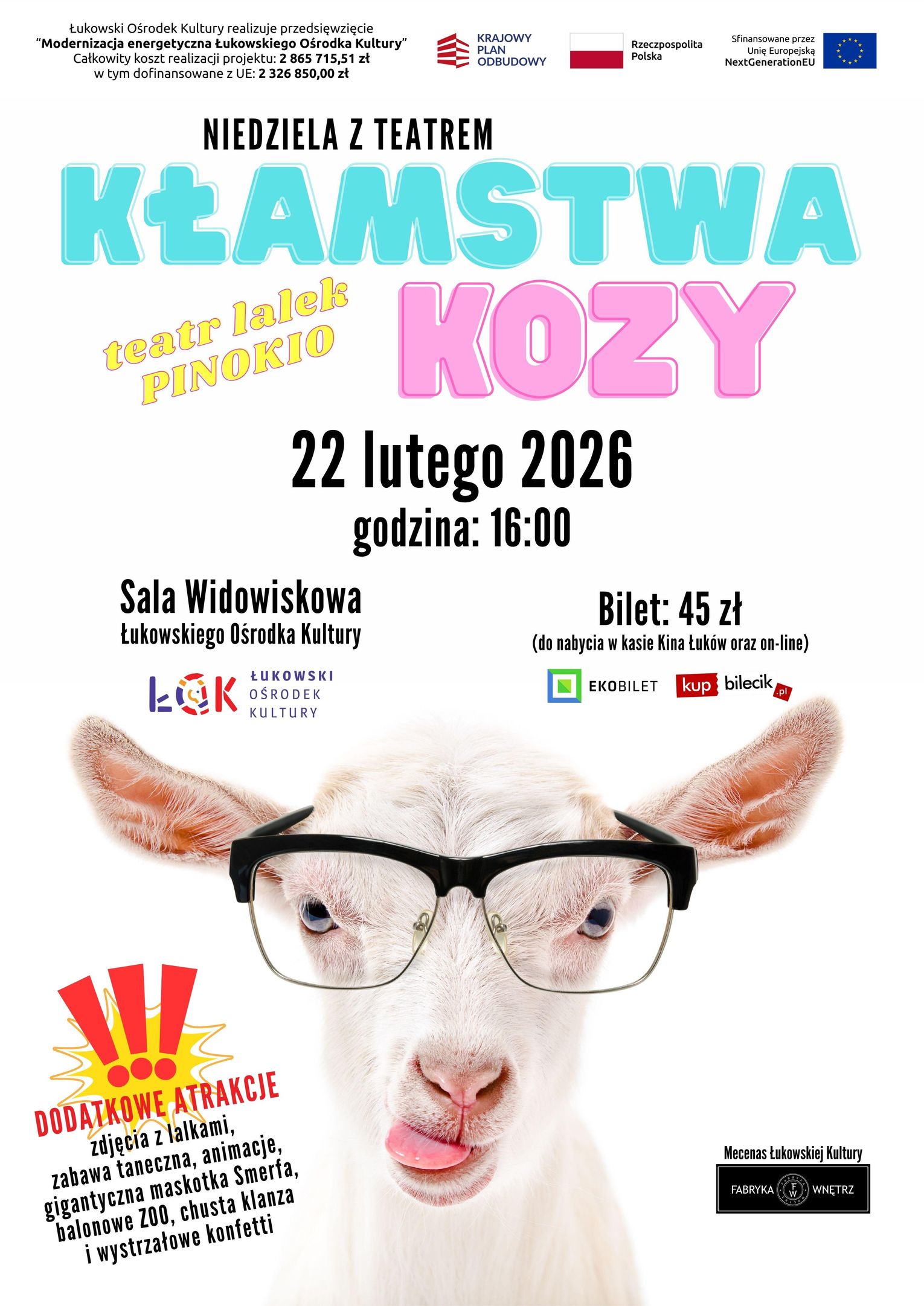 Spektakl „Kłamstwa kozy” w sposób humorystyczny ukazuje, że kłamstwo ma krótkie nogi, a w życiu nie należy oszukiwać i żerować na cudzej dobroci. Sierotka Paulinka poszukując pracy i miejsca dla siebie na świecie, trafia do domu gospodyni, gdzie ma zaopiekować się podstępną Kozą. Kozucha okłamuje gospodynię, przez co dziewczyna musi szukać nowej pracy. Jednak oszustwo szybko wychodzi na jaw i sama Koza zostaje wypędzona. Idzie do lasu, gdzie sprytem zajmuje dom lisa. Zrozpaczone zwierzę prosi o pomoc swoich leśnych sąsiadów. Czy ktoś pokaże kozie, gdzie jest jej miejsce? Jak potoczą się dalsze losy Paulinki? Tego i wiele innych rzeczy dowiecie się przychodząc na spektakl do Łukowskiego Ośrodka Kultury.
