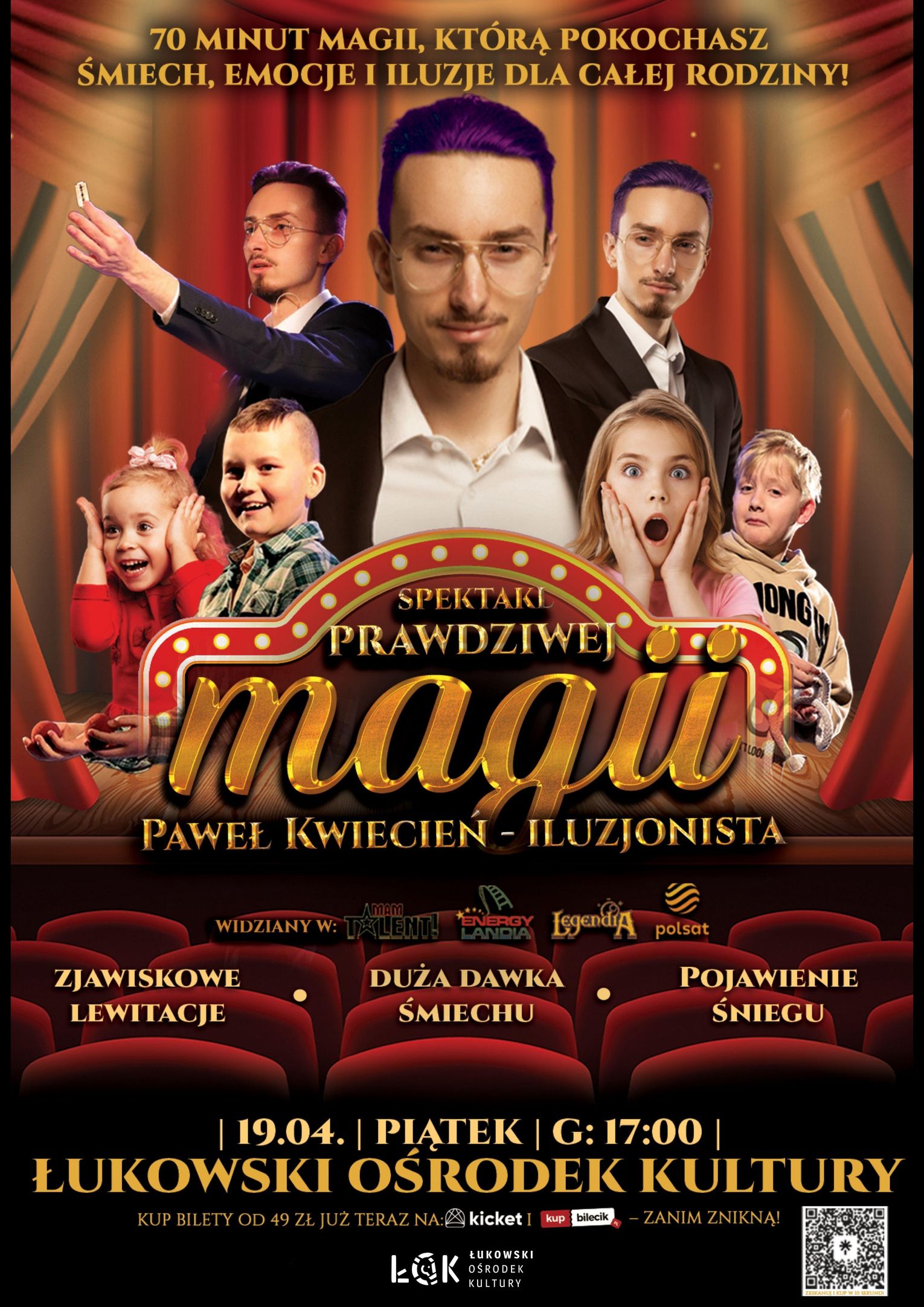 Przygotujcie się na 70 minut pełnych emocji, śmiechu i zaskoczeń. Paweł Kwiecień, iluzjonista, który na co dzień czaruje widzów po całej Polsce, zaprasza Was na show, które połączy magiczne iluzje z rodzinną atmosferą! To najśmieszniejsze magiczne show w Polsce - przeznaczone dla całych rodzin, które będą miały okazję poczuć się częścią tej niezwykłej przygody!