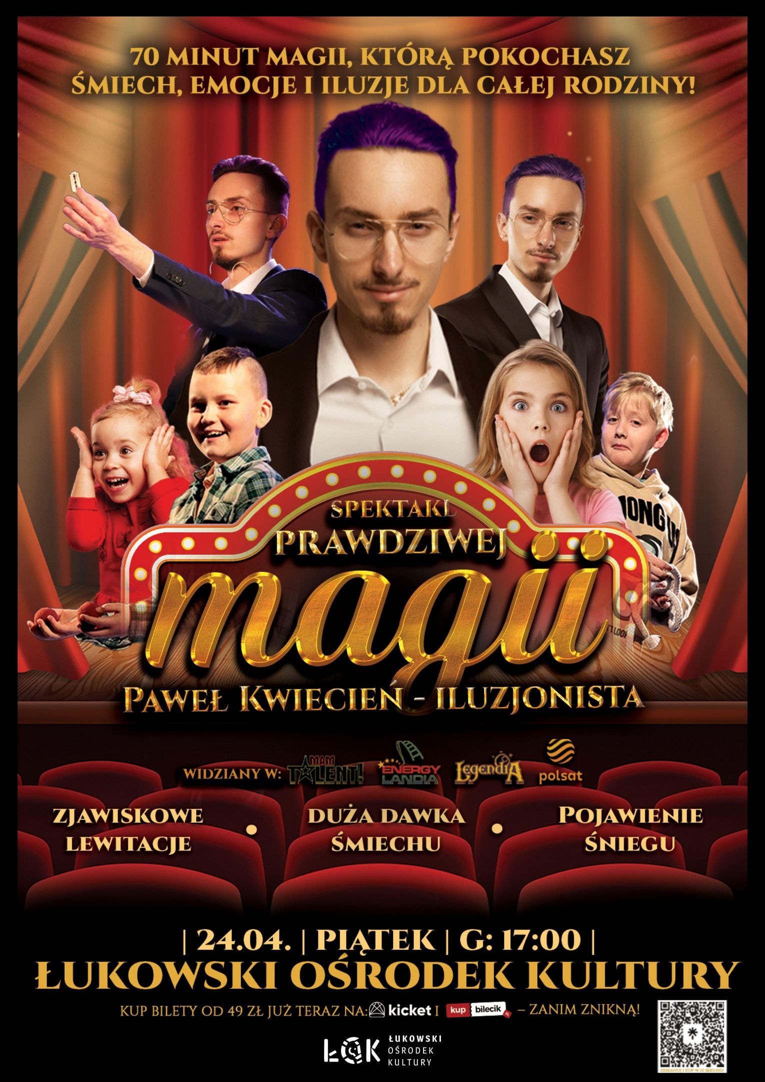 Przygotujcie się na 70 minut pełnych emocji, śmiechu i zaskoczeń. Paweł Kwiecień, iluzjonista, który na co dzień czaruje widzów po całej Polsce, zaprasza Was na show, które połączy magiczne iluzje z rodzinną atmosferą! To najśmieszniejsze magiczne show w Polsce - przeznaczone dla całych rodzin, które będą miały okazję poczuć się częścią tej niezwykłej przygody!