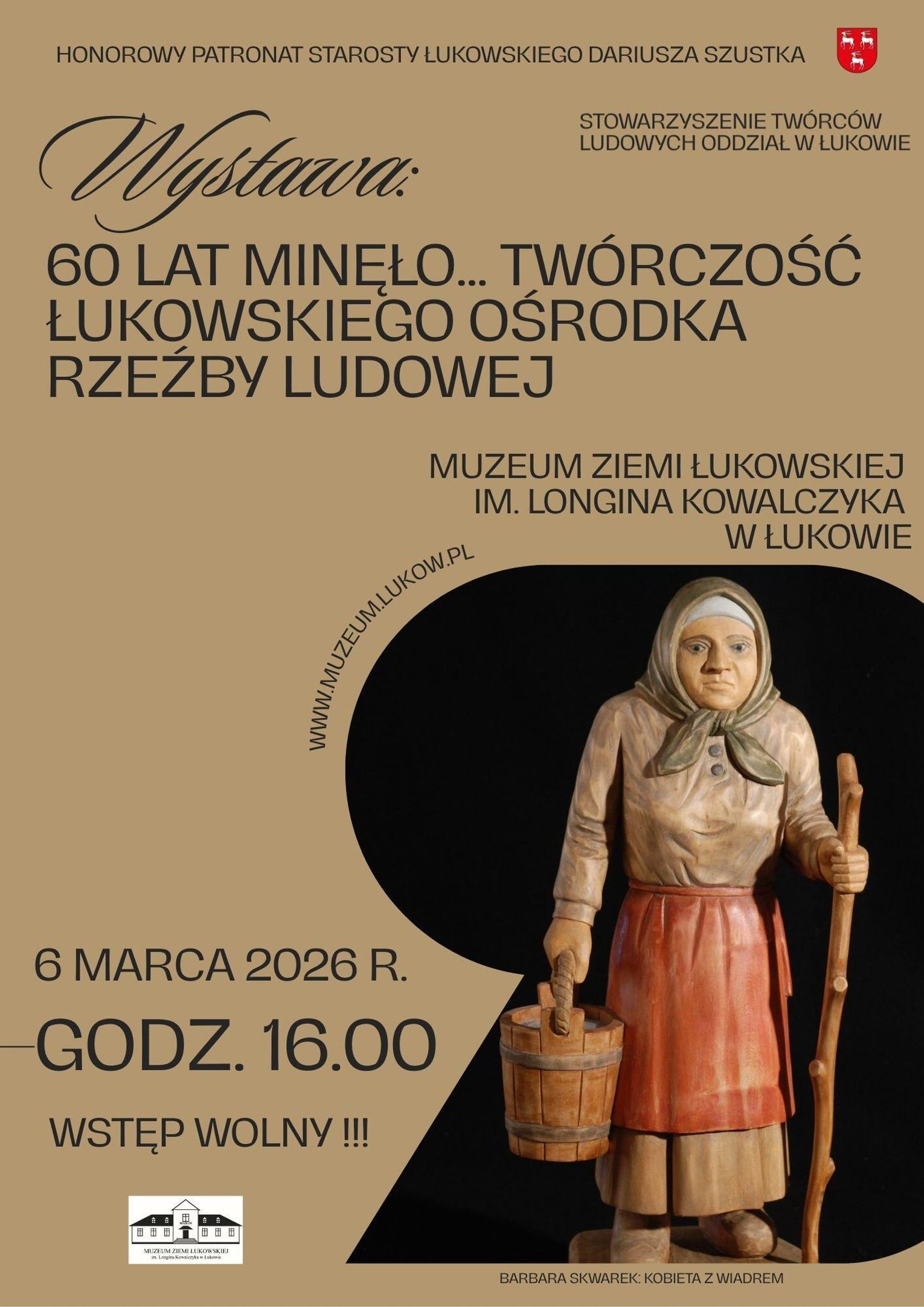 W imieniu Stowarzyszenia Twórców Ludowych oddział w Łukowie oraz Muzeum Ziemi Łukowskiej im. Longina Kowalczyka w Łukowie zapraszamy serdecznie wszystkich miłośników rzeźbiarstwa na wernisaż wystawy okolicznościowej pt. ,,60 lat minęło... Twórczość Łukowskiego Ośrodka Rzeźby Ludowej"