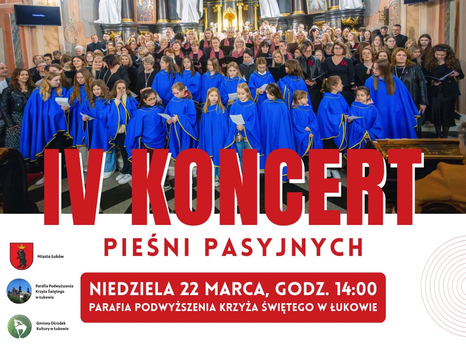 Wspólny śpiew pieśni pasyjnych w wykonaniu zespołów chóralnych stworzy podniosłą, a zarazem pełną zadumy atmosferę. Organizatorzy zapraszają wszystkich mieszkańców Łukowa i okolic do udziału w tym wyjątkowym wydarzeniu. Wstęp na koncert jest wolny.