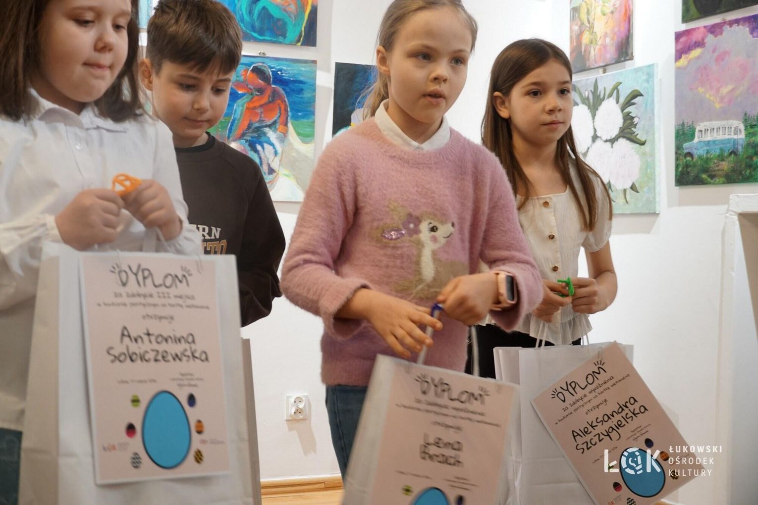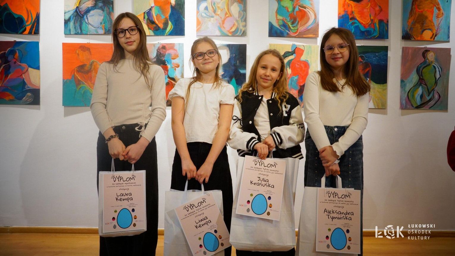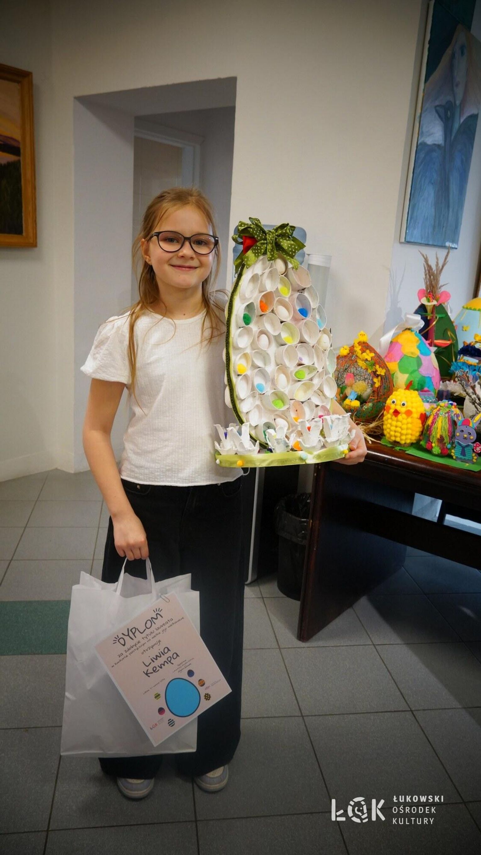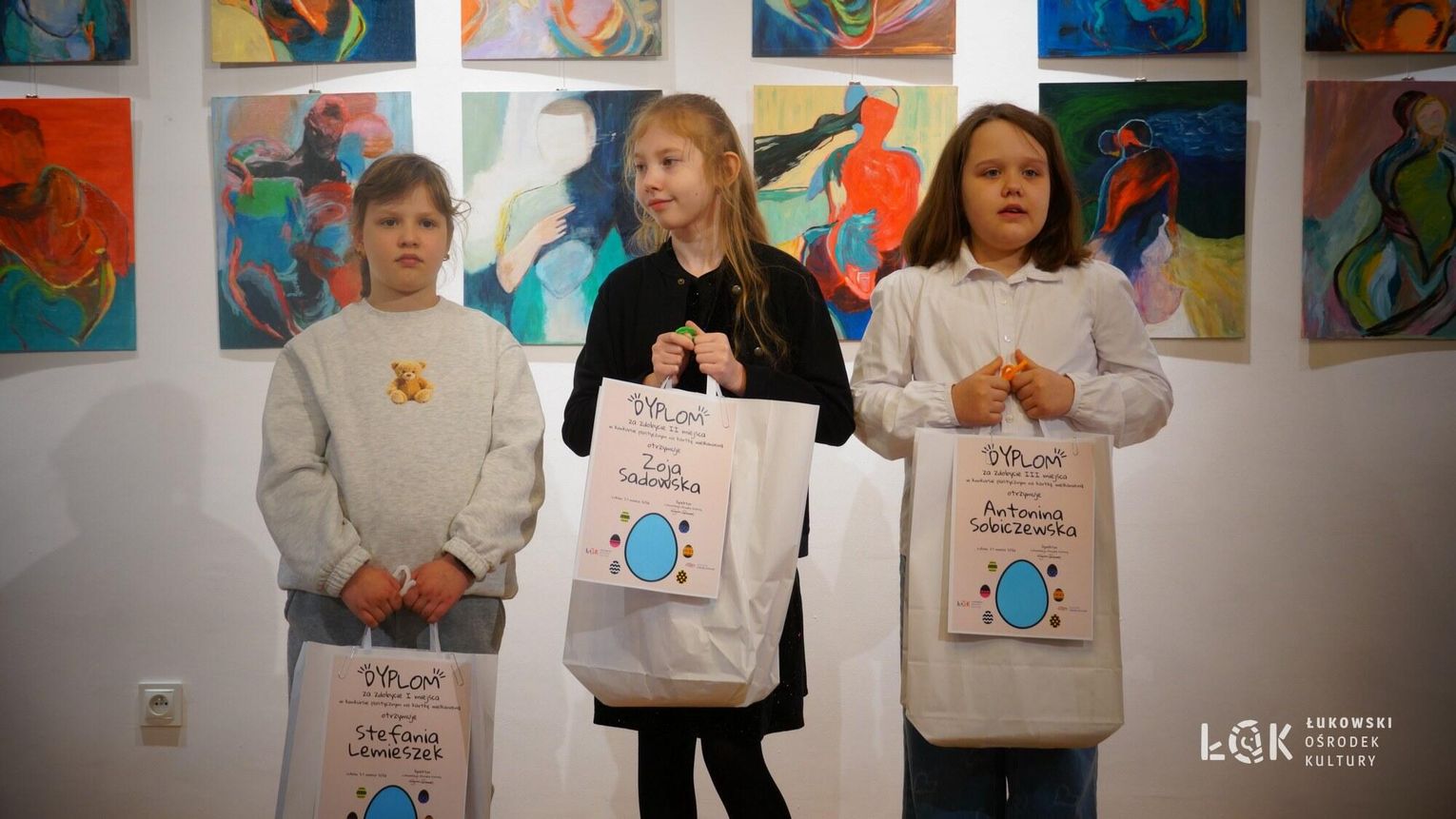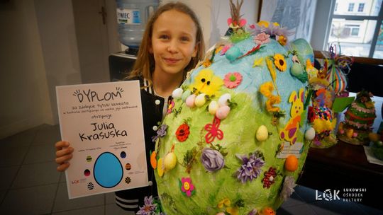 Tegoroczna edycja przyniosła ogromną różnorodność technik – od klasycznych rysunków po odważne formy przestrzenne. Wyobraźnia naszych młodych artystów, nie zna granic. Choć ogólny poziom prac był bardzo zróżnicowany, jurorzy stanęli przed niełatwym zadaniem. Uczestnicy zachwycili warsztatem, stawiając na klasyczne piękno i kolor. Na wystawie prac „Kartka Wielkanocna” królują nasycone akryle, subtelne akwarele, wycinanki oraz precyzyjne rysunki. Wykorzystanie pasteli nadało pracom wyjątkowego, miękkiego klimatu, tworząc z każdej kartki małe, starannie wykonane dzieło sztuki. Natomiast prace z konkursu „Wielkie Jajo Wielkanocne” całkowicie skradły show! Jurorzy podziwiali jaja wykonane niesamowicie różnorodnymi technikami: od puszystych pomponów i kolorowej bibuły, po niezwykle pomysłowe konstrukcje wyklejane ręcznikami kuchennymi i malowane. Na wystawie znajdziemy zarówno prace inspirowane dziełami wielkich artystów, jak i te w duchu eko-recyklingu, wykorzystujące np. wytłoczki po jajkach. To prawdziwe rzeźby, które zaskakują nie tylko rozmiarem, ale przede wszystkim precyzją i nowatorskim podejściem do tradycji. Zachęcamy wszystkich do odwiedzenia Łukowskiego Ośrodka Kultury. Wystawa pokonkursowa jest dostępna na korytarzach ŁOK do 7 kwietnia 2026 roku. To świetna okazja, by zobaczyć na własne oczy, jak różne może być spojrzenie na wielkanocną tradycję. Prace zgłoszone do konkursu na „Wielkie Jajo Wielkanocne” należy odebrać w dniach 7-9 kwietnia 2026 roku. Prosimy o terminowe zgłoszenie się po swoje prace – po tym czasie jajka przechodzą na własność organizatora.