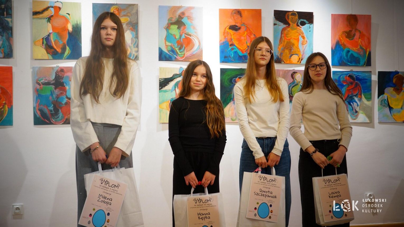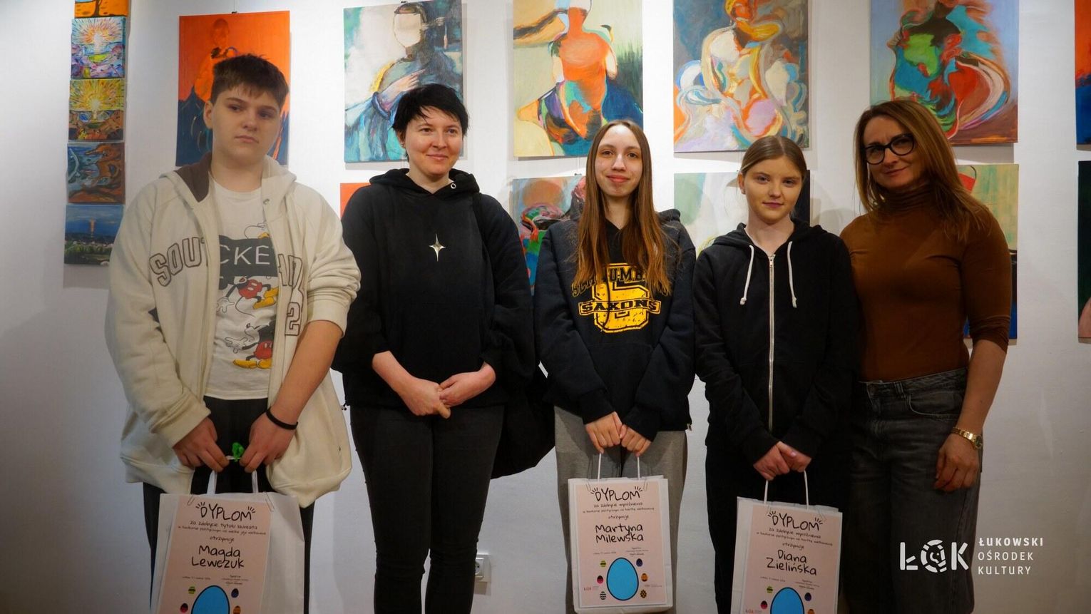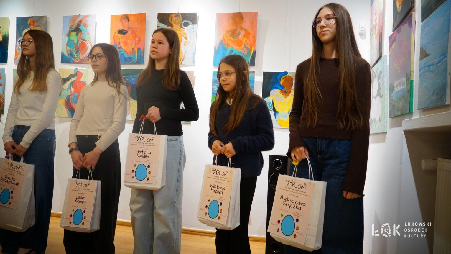 Tegoroczna edycja przyniosła ogromną różnorodność technik – od klasycznych rysunków po odważne formy przestrzenne. Wyobraźnia naszych młodych artystów, nie zna granic. Choć ogólny poziom prac był bardzo zróżnicowany, jurorzy stanęli przed niełatwym zadaniem. Uczestnicy zachwycili warsztatem, stawiając na klasyczne piękno i kolor. Na wystawie prac „Kartka Wielkanocna” królują nasycone akryle, subtelne akwarele, wycinanki oraz precyzyjne rysunki. Wykorzystanie pasteli nadało pracom wyjątkowego, miękkiego klimatu, tworząc z każdej kartki małe, starannie wykonane dzieło sztuki. Natomiast prace z konkursu „Wielkie Jajo Wielkanocne” całkowicie skradły show! Jurorzy podziwiali jaja wykonane niesamowicie różnorodnymi technikami: od puszystych pomponów i kolorowej bibuły, po niezwykle pomysłowe konstrukcje wyklejane ręcznikami kuchennymi i malowane. Na wystawie znajdziemy zarówno prace inspirowane dziełami wielkich artystów, jak i te w duchu eko-recyklingu, wykorzystujące np. wytłoczki po jajkach. To prawdziwe rzeźby, które zaskakują nie tylko rozmiarem, ale przede wszystkim precyzją i nowatorskim podejściem do tradycji. Zachęcamy wszystkich do odwiedzenia Łukowskiego Ośrodka Kultury. Wystawa pokonkursowa jest dostępna na korytarzach ŁOK do 7 kwietnia 2026 roku. To świetna okazja, by zobaczyć na własne oczy, jak różne może być spojrzenie na wielkanocną tradycję. Prace zgłoszone do konkursu na „Wielkie Jajo Wielkanocne” należy odebrać w dniach 7-9 kwietnia 2026 roku. Prosimy o terminowe zgłoszenie się po swoje prace – po tym czasie jajka przechodzą na własność organizatora.