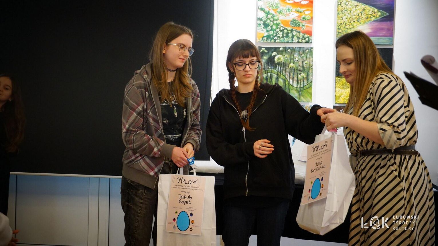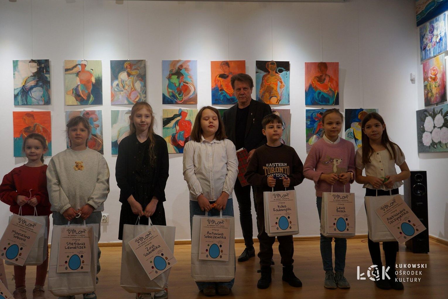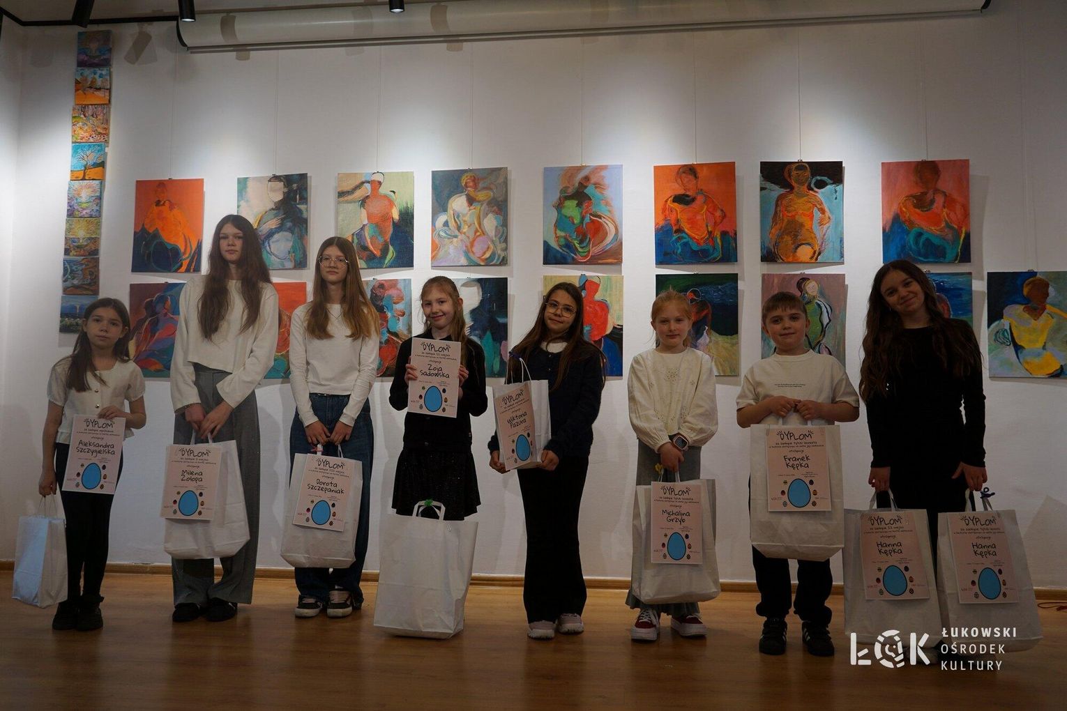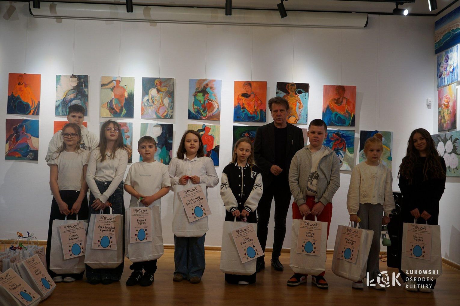 Tegoroczna edycja przyniosła ogromną różnorodność technik – od klasycznych rysunków po odważne formy przestrzenne. Wyobraźnia naszych młodych artystów, nie zna granic. Choć ogólny poziom prac był bardzo zróżnicowany, jurorzy stanęli przed niełatwym zadaniem. Uczestnicy zachwycili warsztatem, stawiając na klasyczne piękno i kolor. Na wystawie prac „Kartka Wielkanocna” królują nasycone akryle, subtelne akwarele, wycinanki oraz precyzyjne rysunki. Wykorzystanie pasteli nadało pracom wyjątkowego, miękkiego klimatu, tworząc z każdej kartki małe, starannie wykonane dzieło sztuki. Natomiast prace z konkursu „Wielkie Jajo Wielkanocne” całkowicie skradły show! Jurorzy podziwiali jaja wykonane niesamowicie różnorodnymi technikami: od puszystych pomponów i kolorowej bibuły, po niezwykle pomysłowe konstrukcje wyklejane ręcznikami kuchennymi i malowane. Na wystawie znajdziemy zarówno prace inspirowane dziełami wielkich artystów, jak i te w duchu eko-recyklingu, wykorzystujące np. wytłoczki po jajkach. To prawdziwe rzeźby, które zaskakują nie tylko rozmiarem, ale przede wszystkim precyzją i nowatorskim podejściem do tradycji. Zachęcamy wszystkich do odwiedzenia Łukowskiego Ośrodka Kultury. Wystawa pokonkursowa jest dostępna na korytarzach ŁOK do 7 kwietnia 2026 roku. To świetna okazja, by zobaczyć na własne oczy, jak różne może być spojrzenie na wielkanocną tradycję. Prace zgłoszone do konkursu na „Wielkie Jajo Wielkanocne” należy odebrać w dniach 7-9 kwietnia 2026 roku. Prosimy o terminowe zgłoszenie się po swoje prace – po tym czasie jajka przechodzą na własność organizatora.