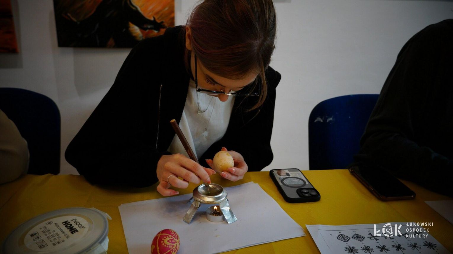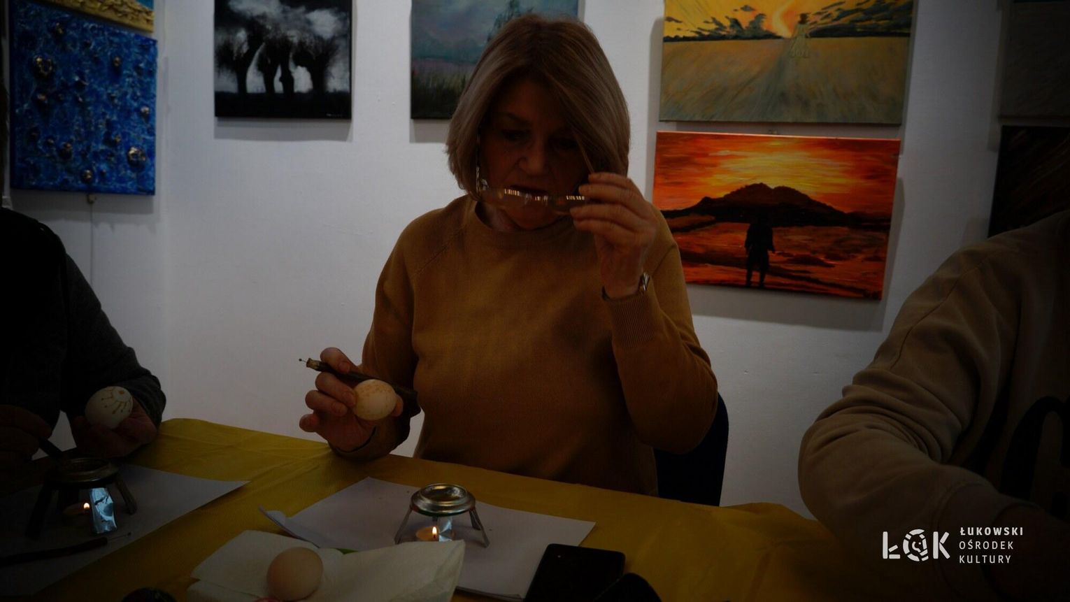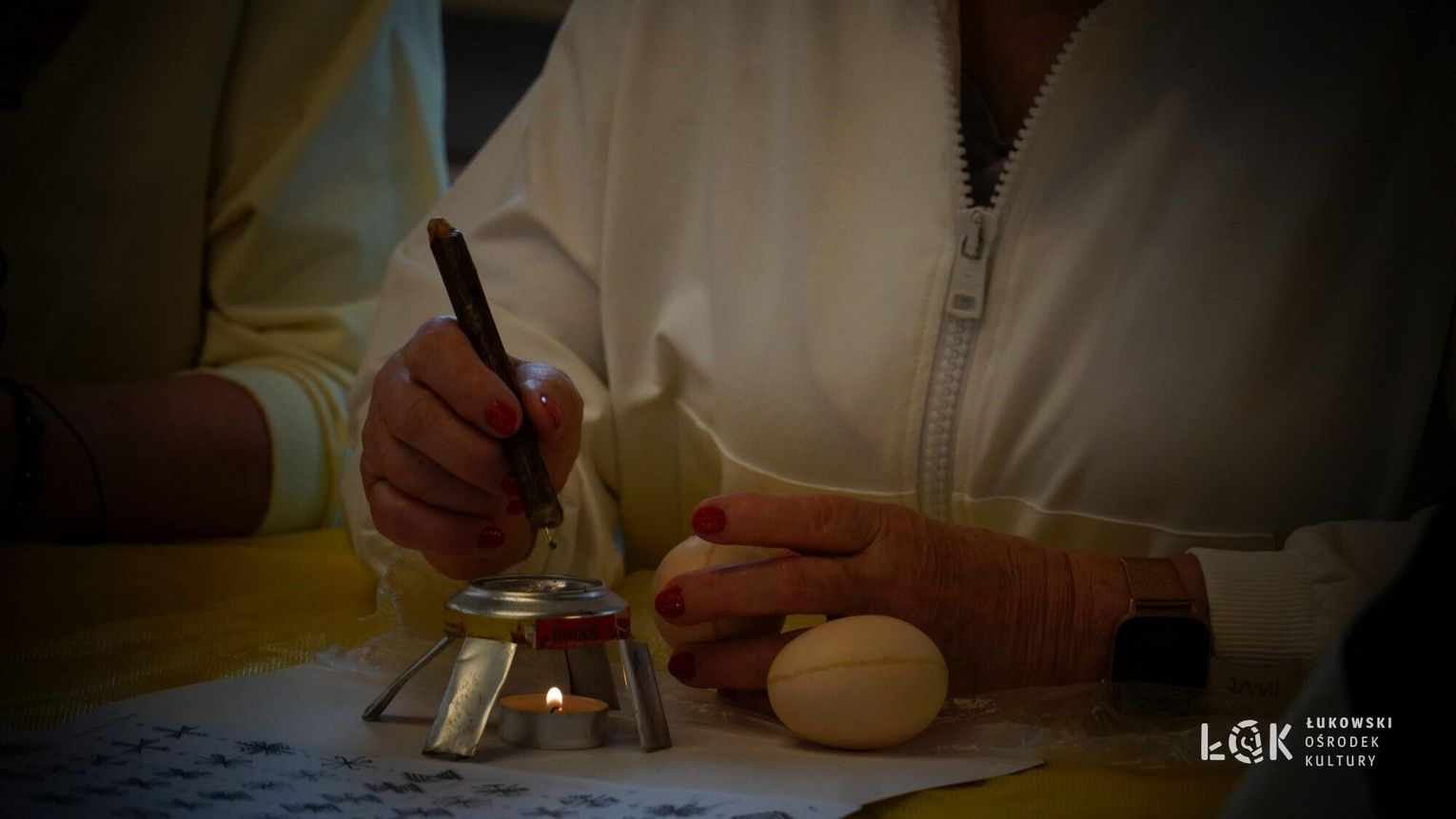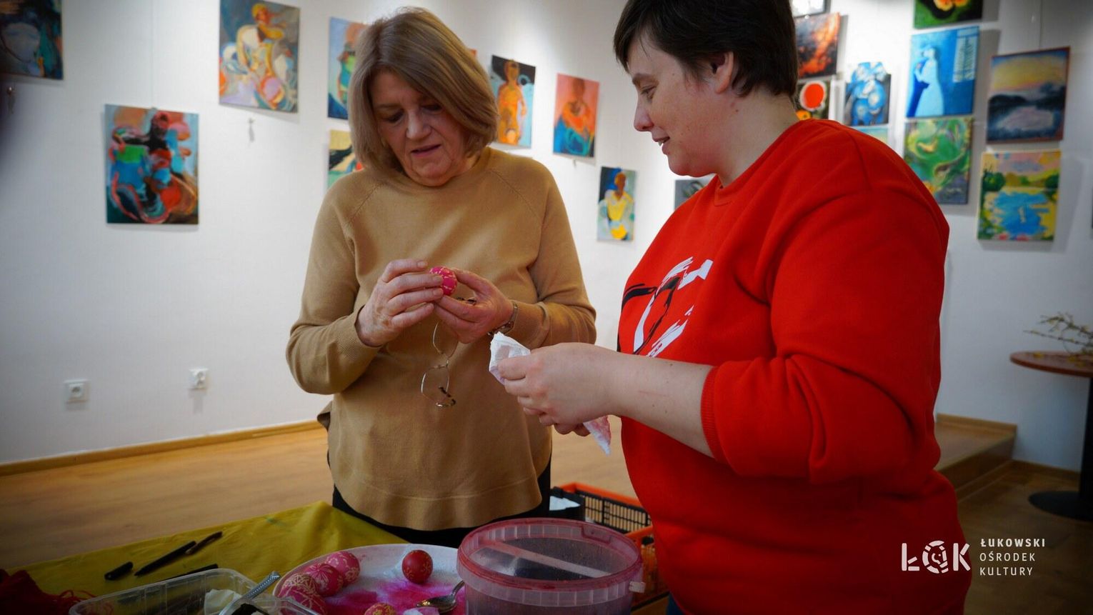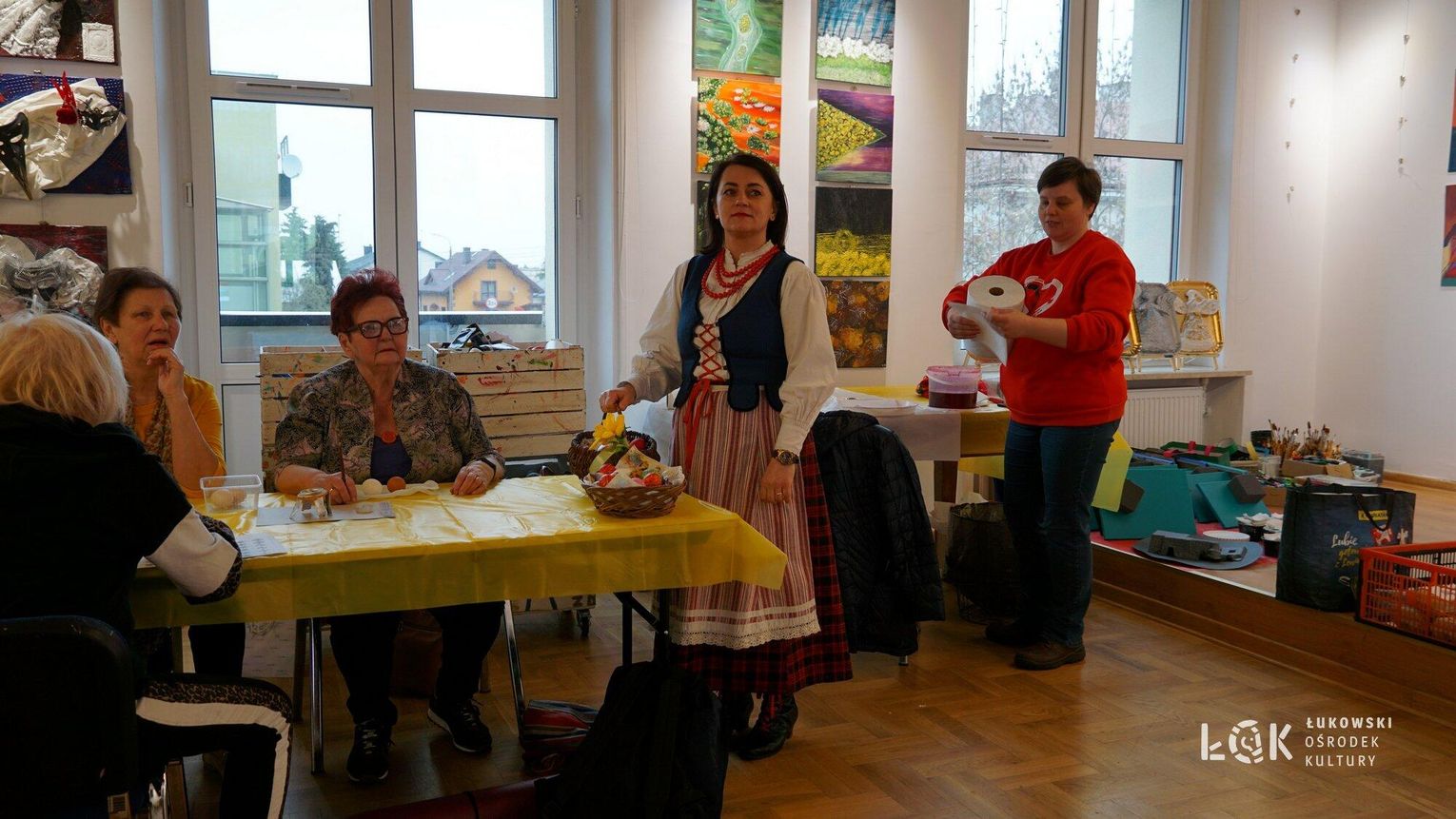Podczas wydarzenia miały okazję poznać lub poćwiczyć tradycyjną metodę zdobienia jaj – technikę batikową. Warsztaty poprowadziła Edyta Sak – twórczyni ludowa związana z Muzeum Ziemi Łukowskiej im. Longina Kowalczyka, która z pasją i zaangażowaniem wprowadziła uczestniczki w tajniki zdobienia pisanek przy użyciu wosku i barwników. W trakcie zajęć panie krok po kroku poznawały kolejne etapy pracy – od przygotowania jaj, poprzez nanoszenie wzorów, aż po ich barwienie. Podczas warsztatów powstały piękne pisanki, które będą zdobić koszyczki tradycyjnie przygotowywane na święconkę. Wydarzenie było także okazją do wspominania dawnych zwyczajów wielkanocnych, panujących w domach uczestniczek wydarzenia.