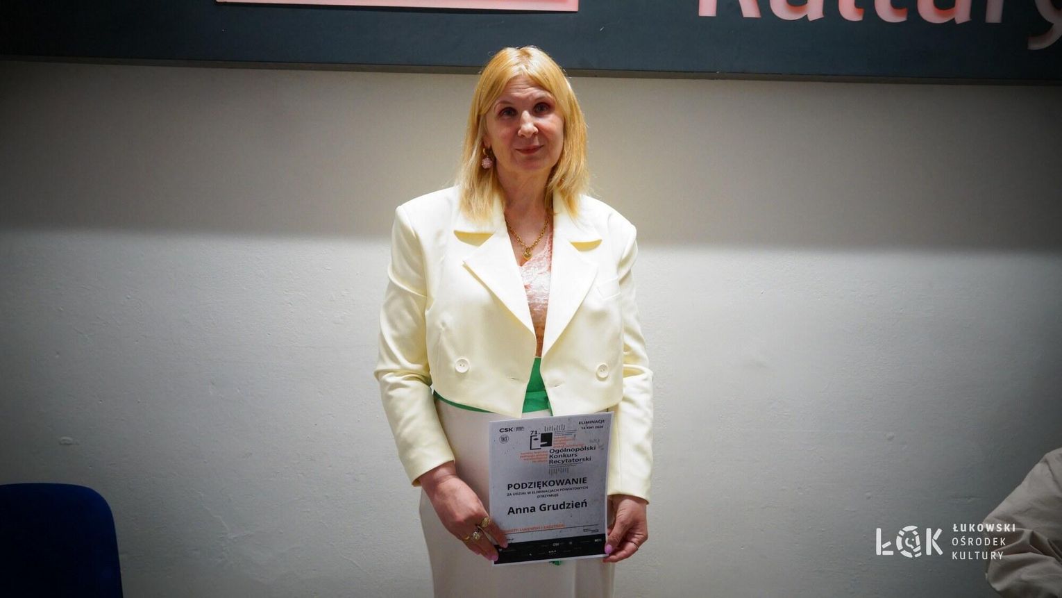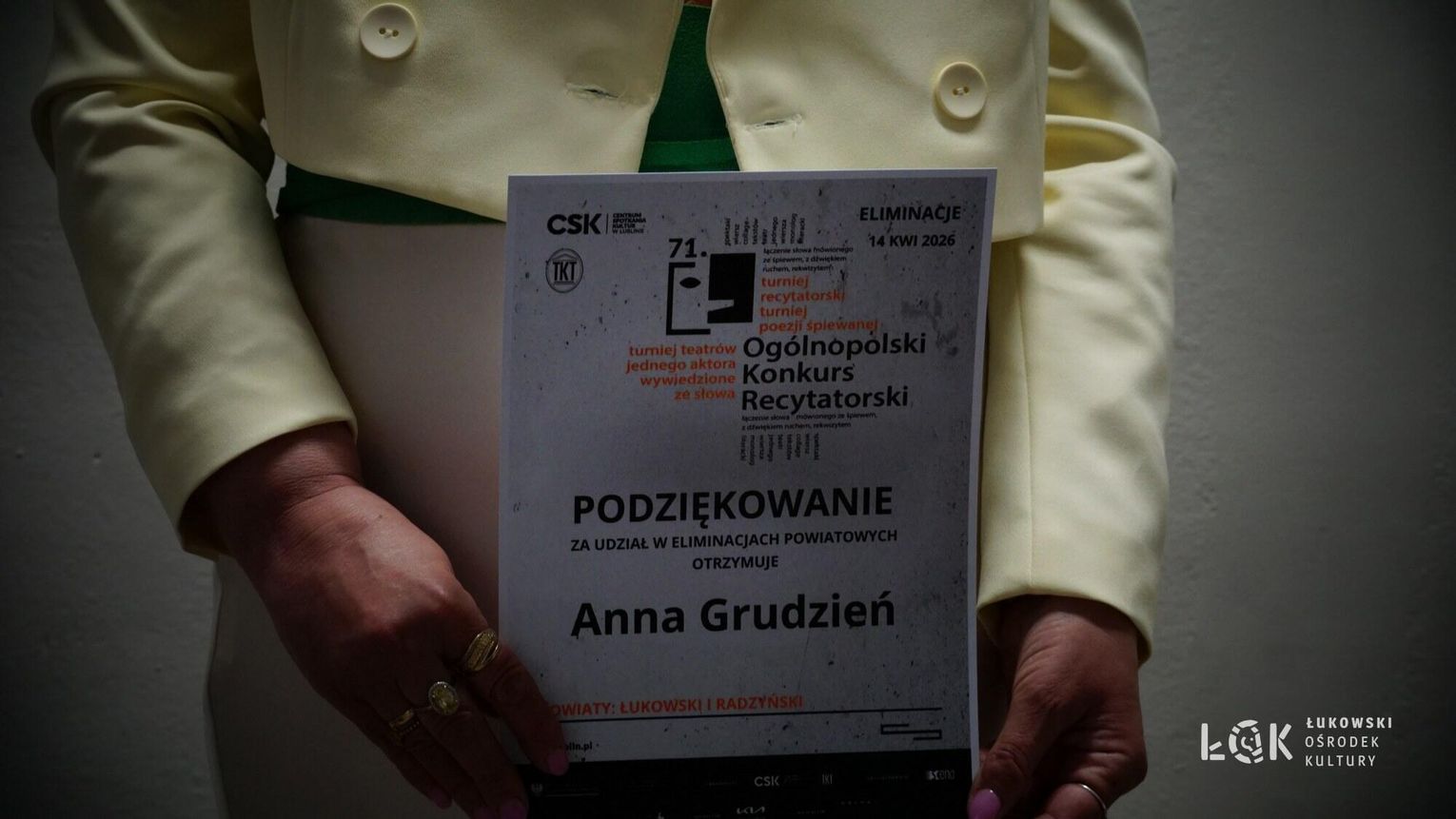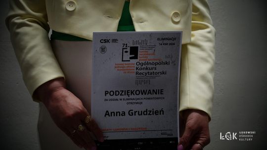 Organizator Turnieju Międzypowiatowego po przyjęciu 3 zgłoszeń do Eliminacji Powiatowych postanowił – w porozumieniu z koordynatorem eliminacji 71. OKR w województwie lubelskim – przeprowadzić konsultacje dla zgłoszonych uczestników. W rezultacie postanowił, że w Turnieju Teatrów Jednego Aktora Nagrodę i Nominację do Turnieju Wojewódzkiego 71. OKR w Lublinie otrzymuje Emilia Orzeł z Łukowskiego Ośrodka Kultury, w Turnieju Recytatorskim w kategorii Szkół Ponadpodstawowych Nagrodę i Nominację do Turnieju Wojewódzkiego 71. OKR w Lublinie otrzymuje Piotr Mućka z Łukowskiego Ośrodka Kultury a w Turnieju Recytatorskim w kategorii Dorośli Nagrodę i Nominację do Turnieju Wojewódzkiego 71. OKR w Lublinie otrzymuje Anna Grudzień (zgłoszenie indywidualne). Gratulacje! Jednocześnie pragniemy poinformować osoby nominowane do Turnieju Wojewódzkiego 71. Ogólnopolskiego Konkursu Recytatorskiego w Lublinie, że przesłuchania odbędą się we wtorek 19 maja 2026 roku w Klubie Muzycznym Centrum Spotkania Kultur w Lublinie (Plac Teatralny 1, 20-029 Lublin, poziom -1). Turniej Wojewódzki w Lublinie będzie obejmował bloki konkursowe, konsultacje z członkami Komisji Konkursowej oraz wydarzenia towarzyszące (np. warsztaty). Uczestników Turnieju Wojewódzkiego obowiązuje obecność podczas wszystkich wydarzeń w dniu, w którym będą występować.